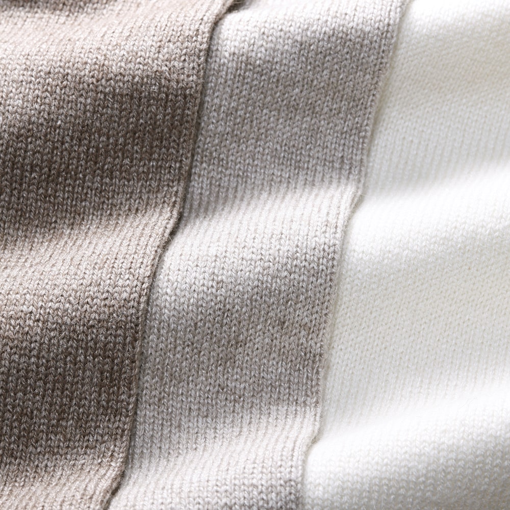 ・こちらの"シルカシ"は9月から3月くらいまでおよそ半年着られる編み地。上質感あるベーシックカラーを中心に全8色と豊富なバリエーションをラインナップしました。同じ編み地でクルーネックとタートルもラインナップ。