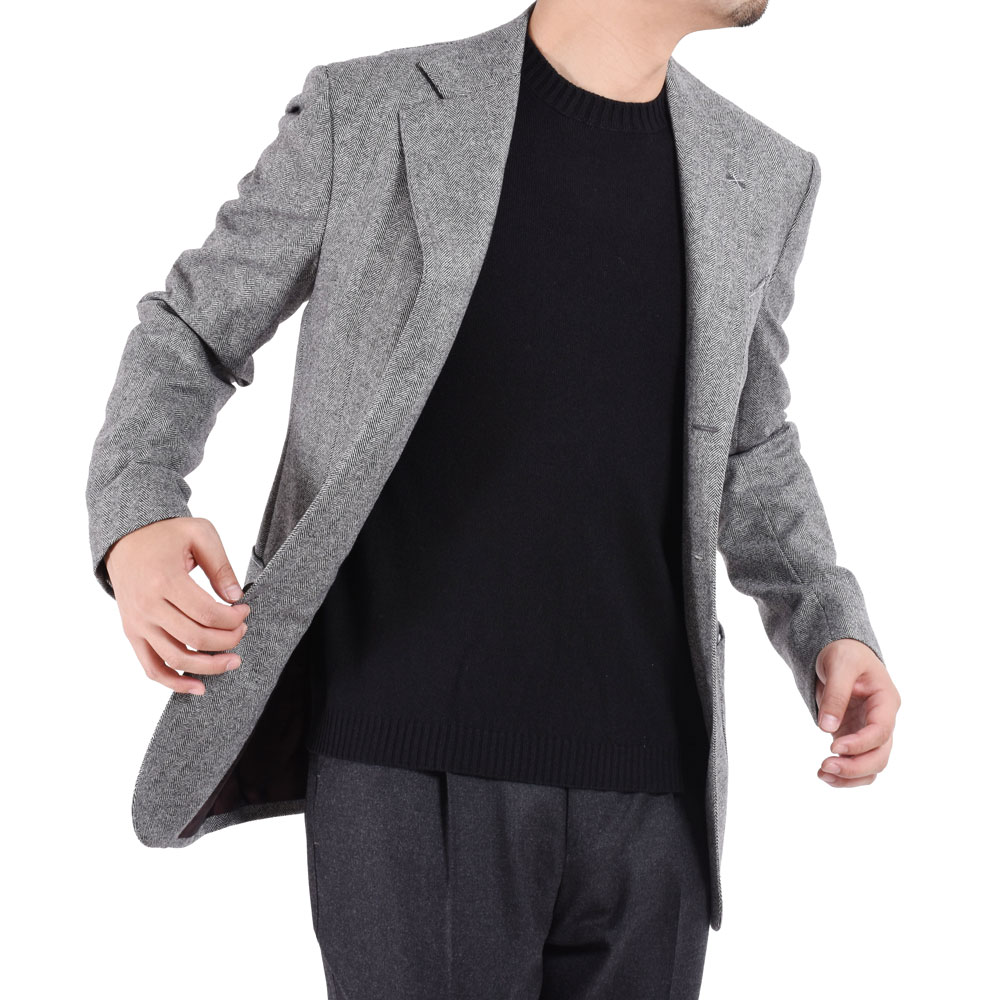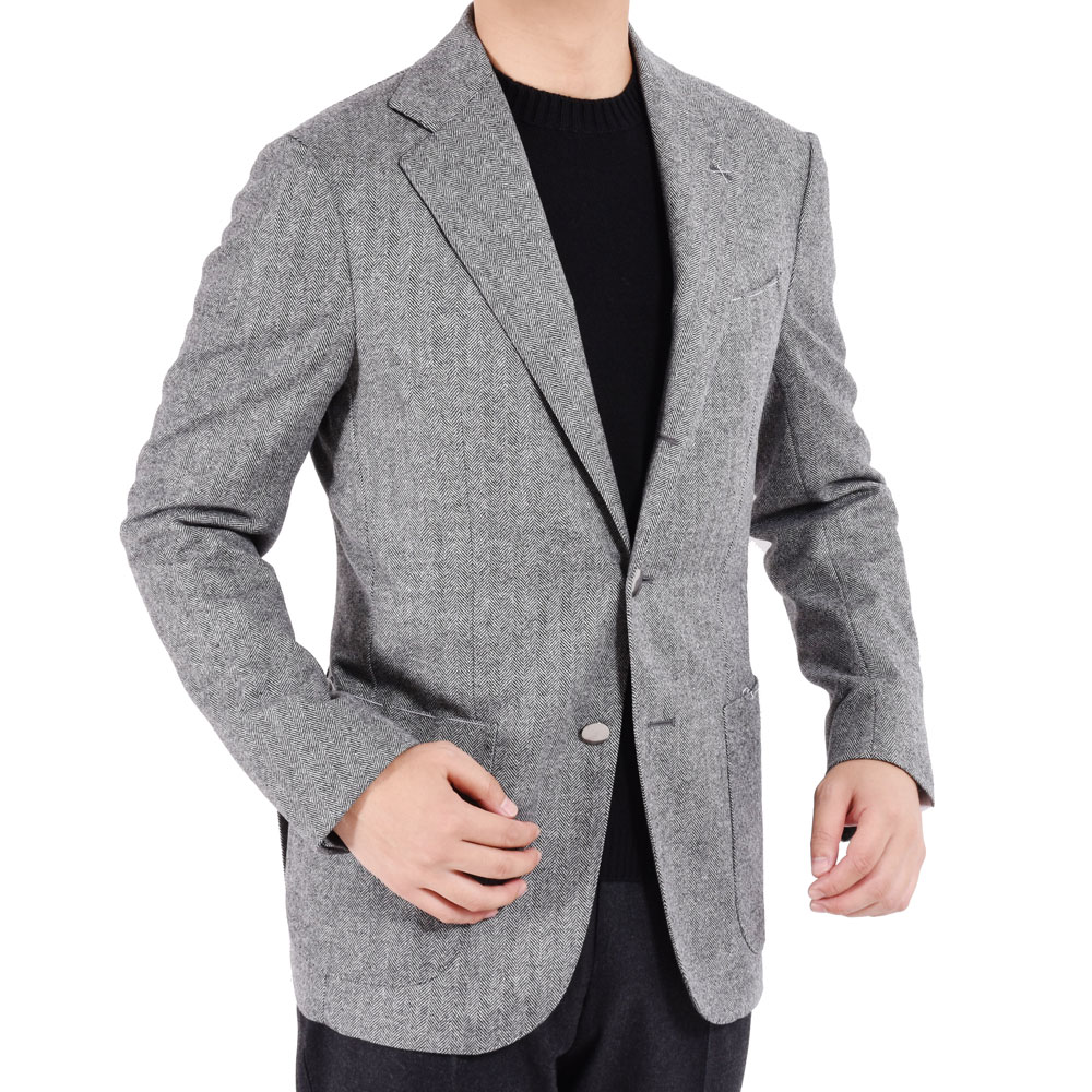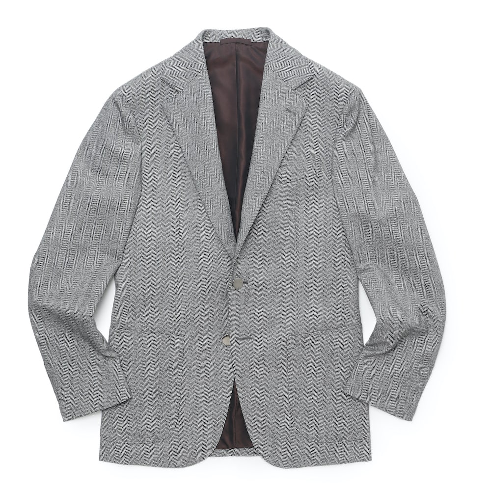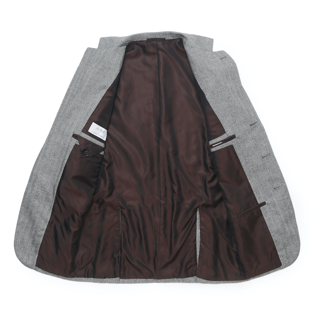 ・生地は"Loro Piana(ロロ・ピアーナ)"のSuper170'S Wool & Cashmereのヘリンボーン。カシミア混ならではの滑らかさが際立ちながら、グレーヘリンボーンの品の良さも堪能できます。目付は280グラム。