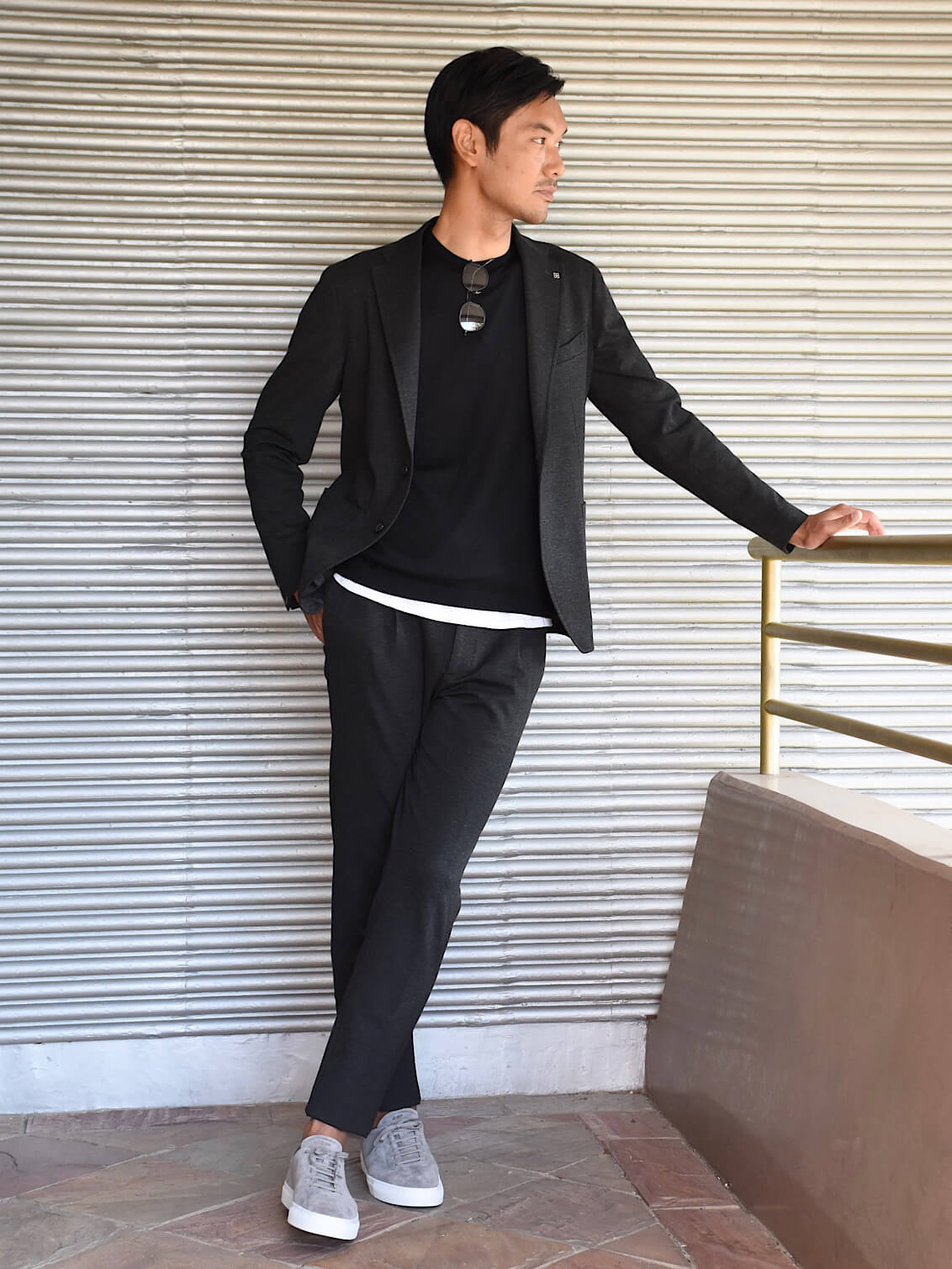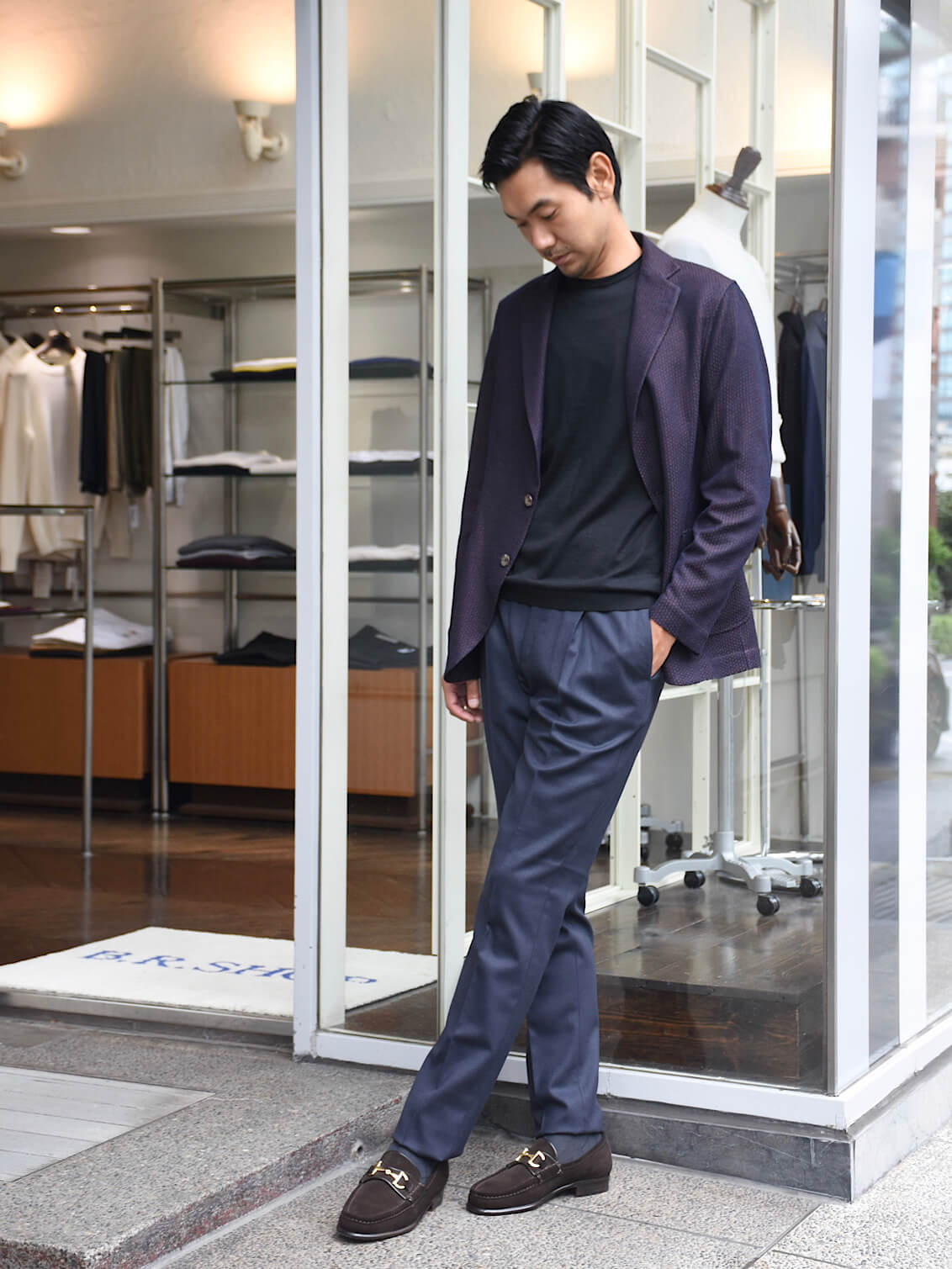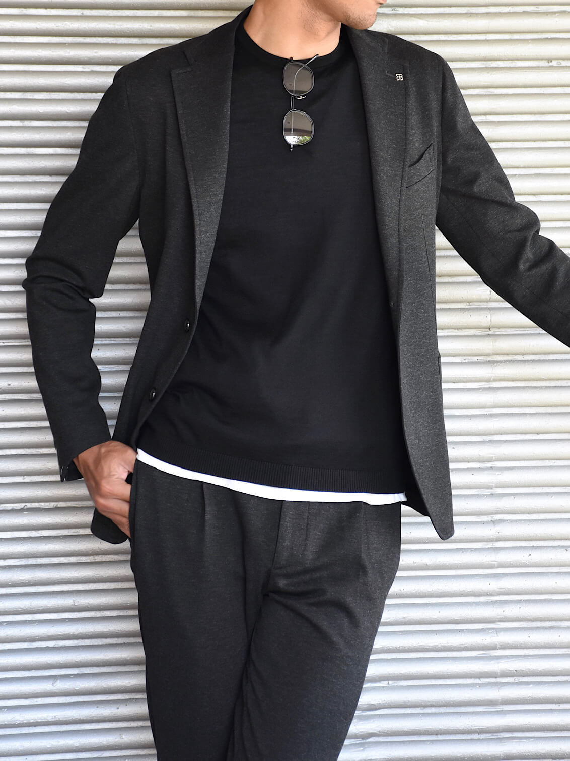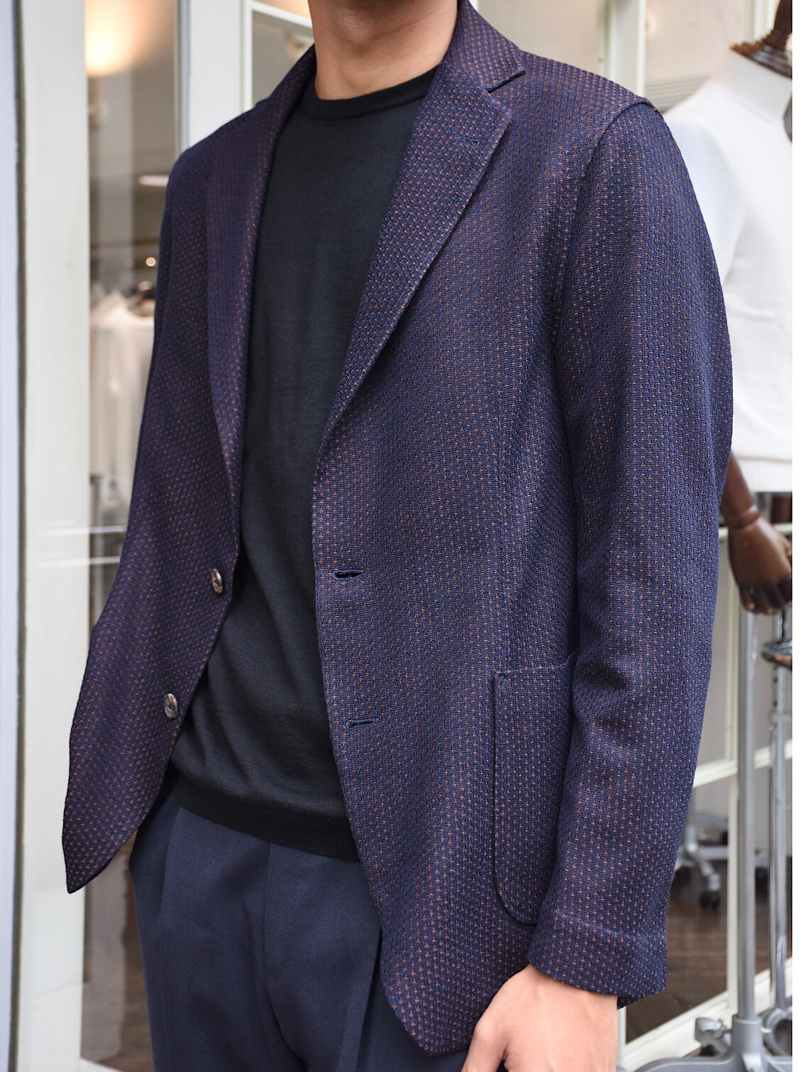 細身体型で普段サイズ46を着用しますが、こちらはワンサイズ上げたサイズ48で丈感などがジャストサイズでした。
