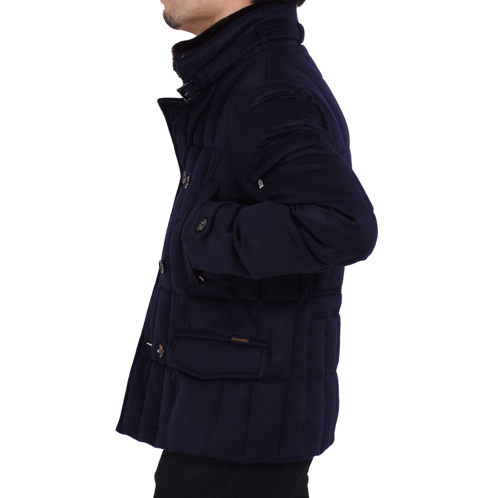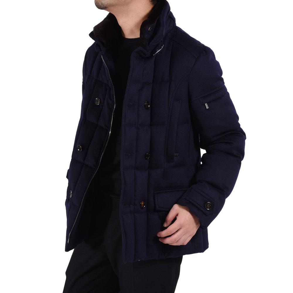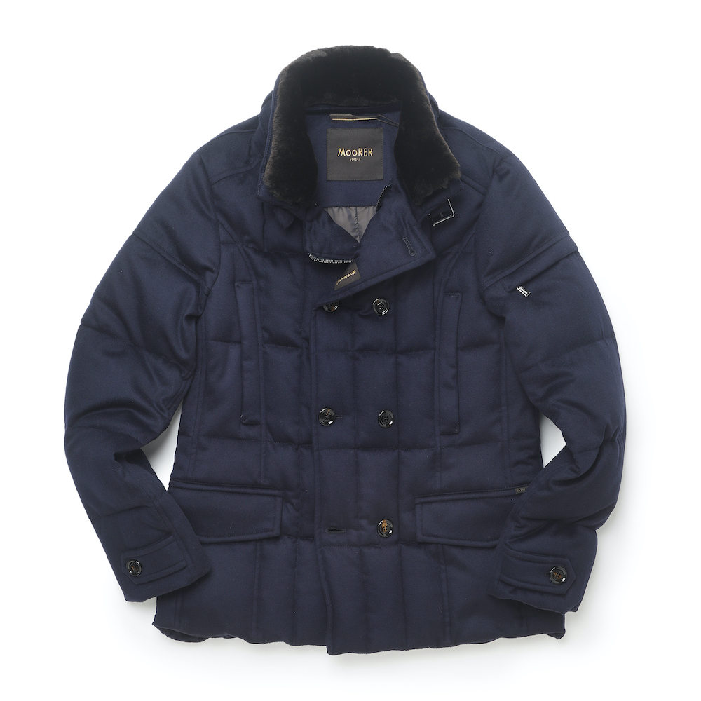 ・同じモデルでも表地や襟のファーにより価格が異なるのが「MooRER(ムーレー)」の特徴で様々な"SIRO(シーロ)"が存在します。ご紹介するのは最上級モデル!見るからにラグジュアリーな表地はウール&カシミア。ビーバーのような仕上げになっており、カシミア混率10%とは思えないほどのぬめり感と品の良い光沢を備えています。またネイビーの色出しの美しさも特筆すべき点です。