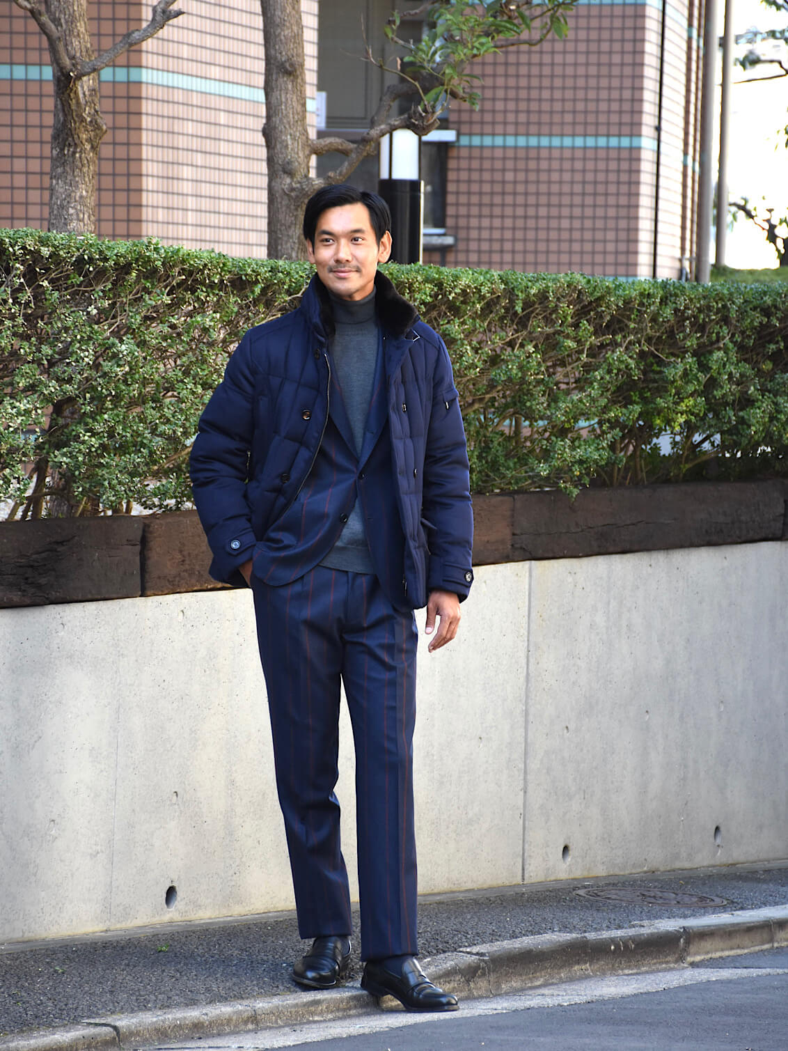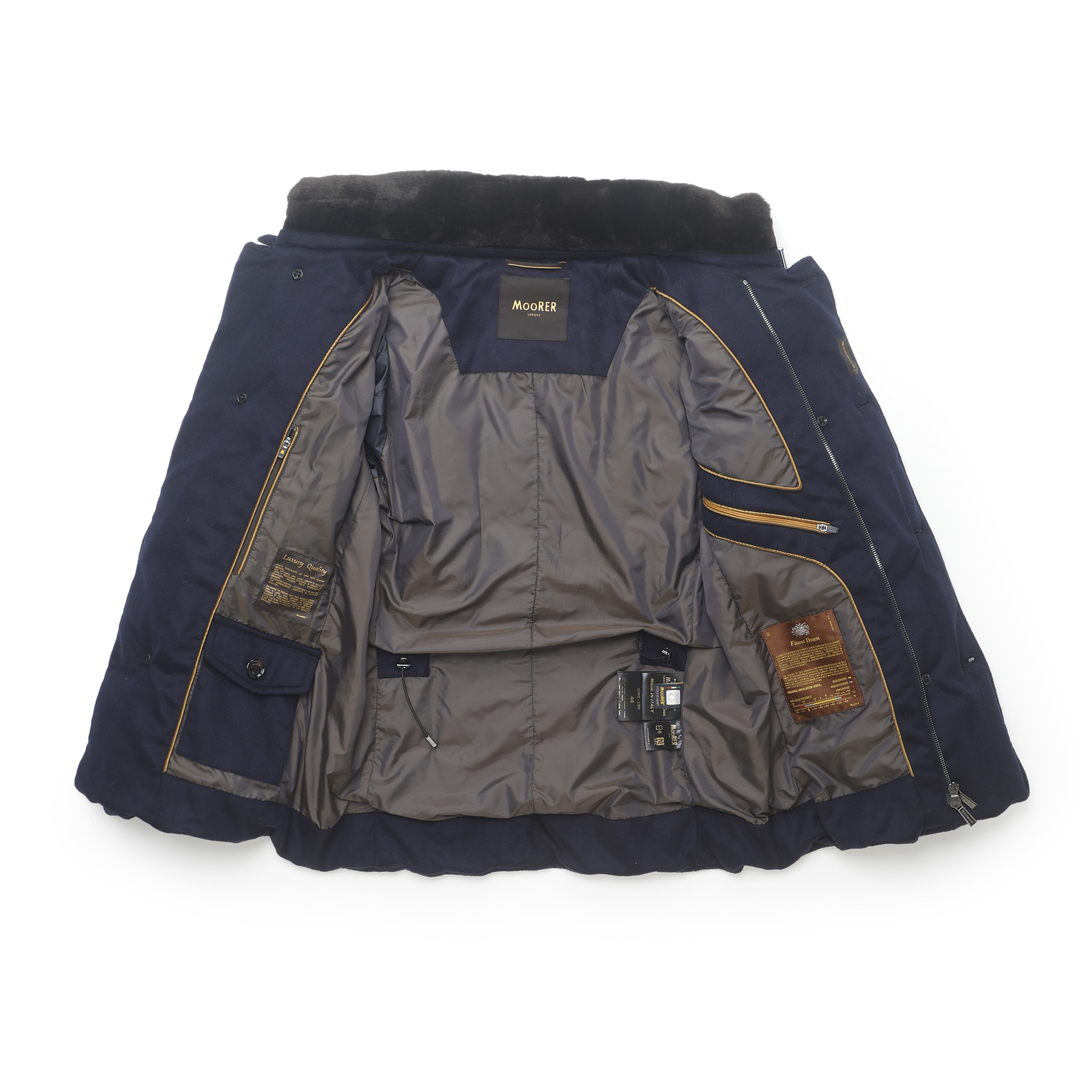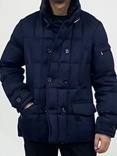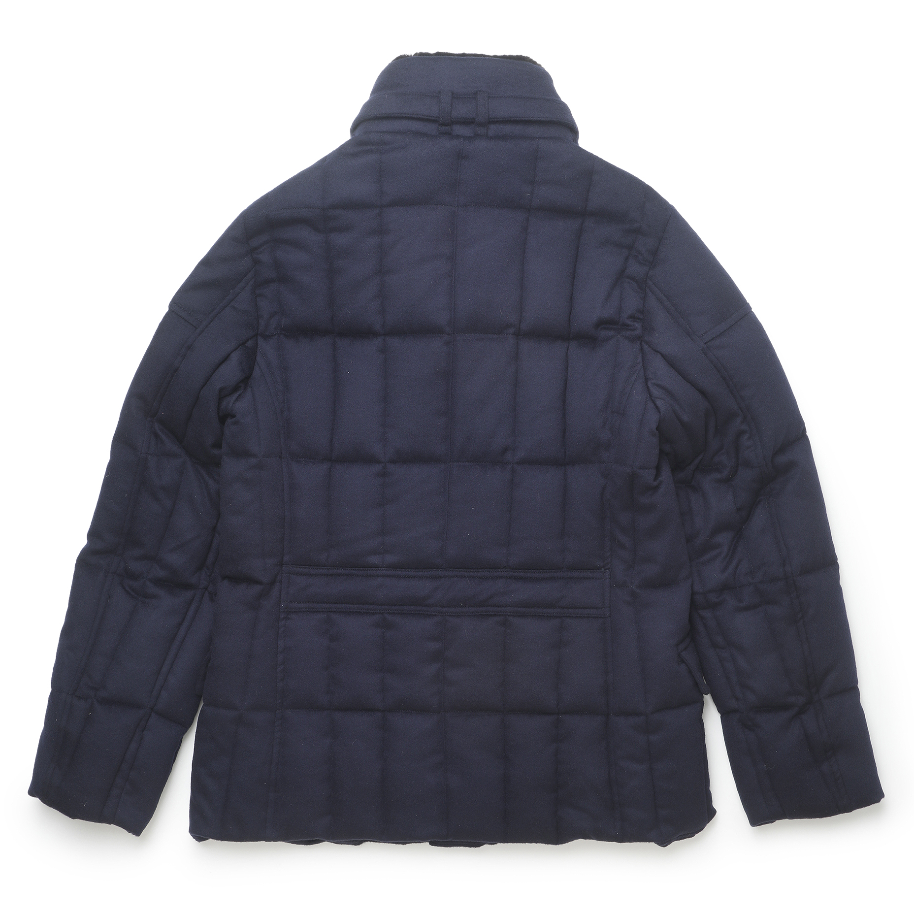 ・同じモデルでも表地や襟のファーにより価格が異なるのが「MooRER(ムーレー)」の特徴で様々な"SIRO(シーロ)"が存在します。ご紹介するのは最上級モデル!見るからにラグジュアリーな表地はウール&カシミア。ビーバーのような仕上げになっており、カシミア混率10%とは思えないほどのぬめり感と品の良い光沢を備えています。またネイビーの色出しの美しさも特筆すべき点です。
