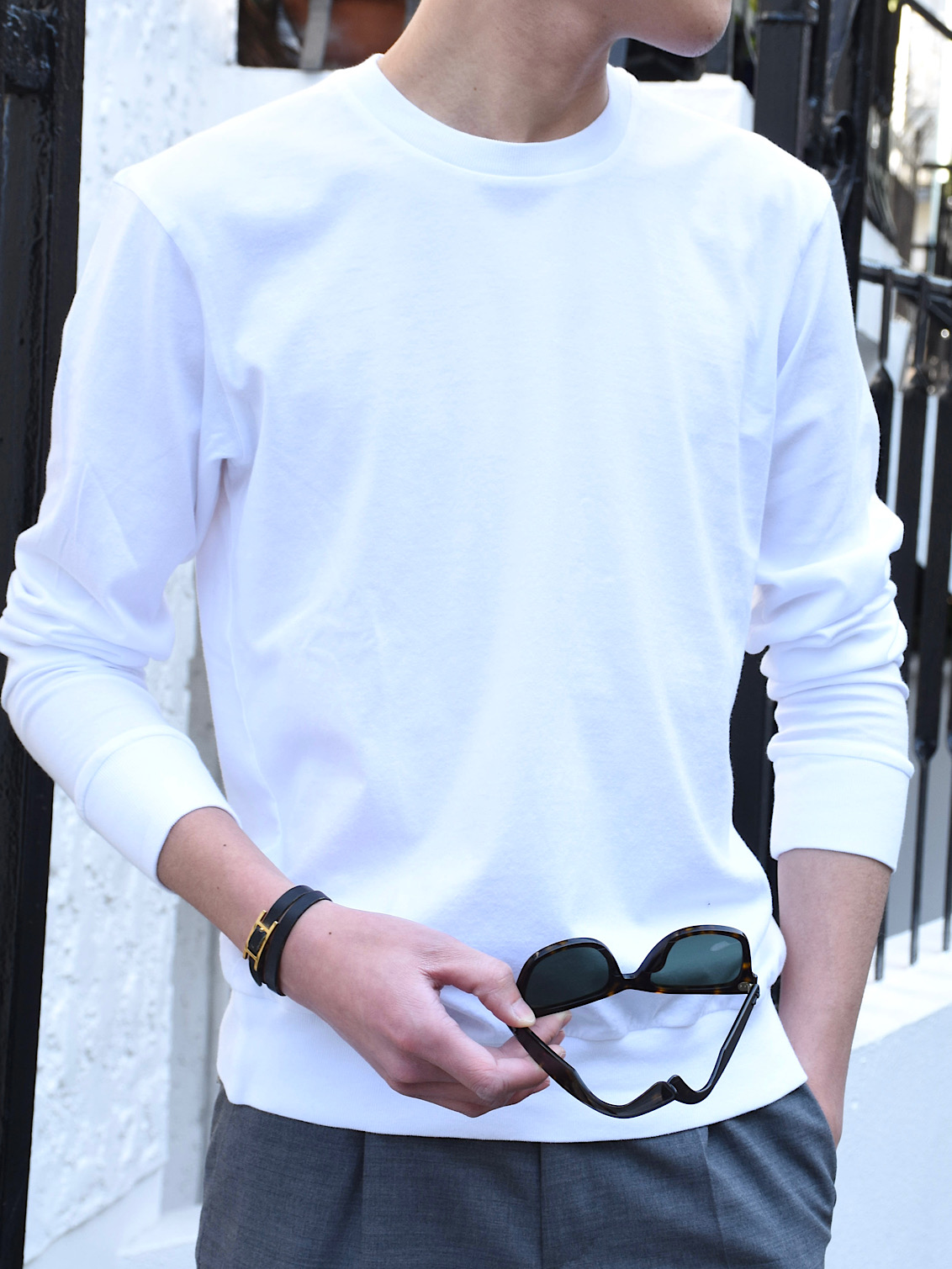 ・ホワイトを着用し、ライトグレーのパンツにスニーカーを合わせたスタイル