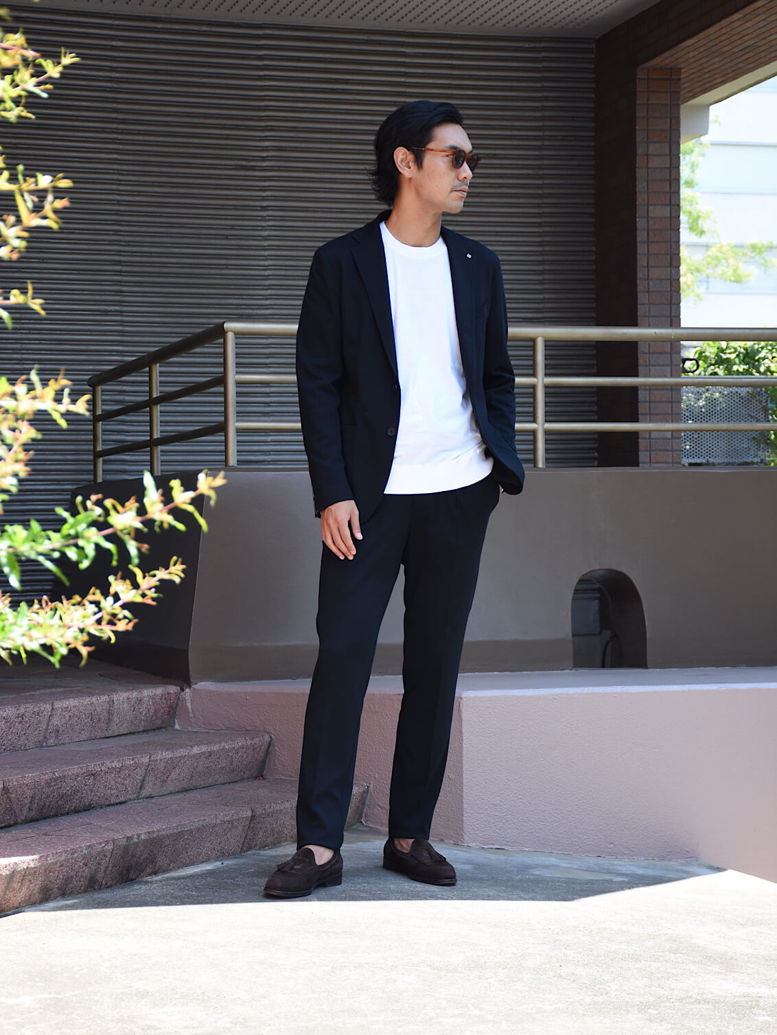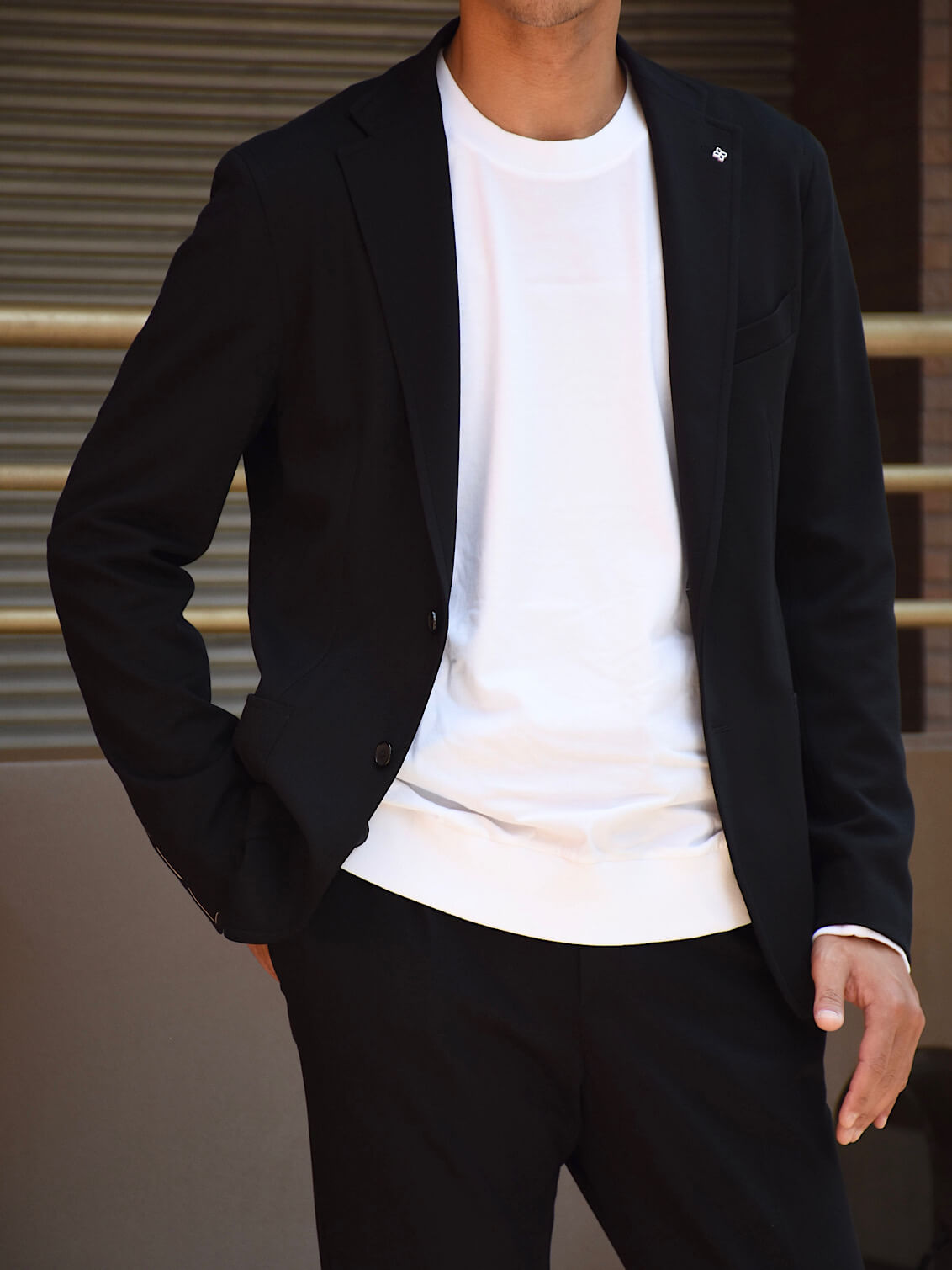 ・ブラックのセットアップにホワイトのインナーを合わせたスタイル(183センチ/75キロ)