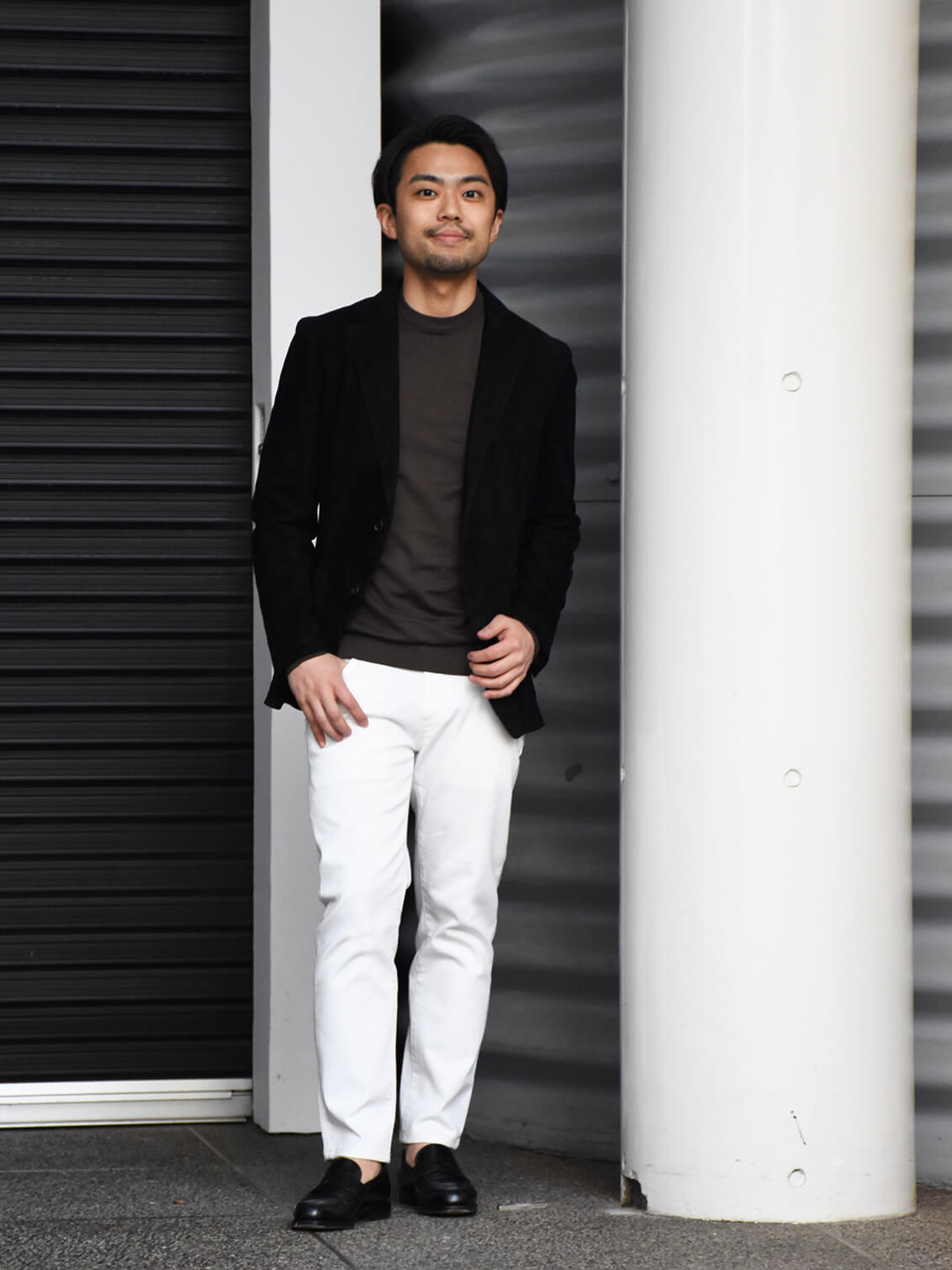 細身体型でサイズ48を着用しています。