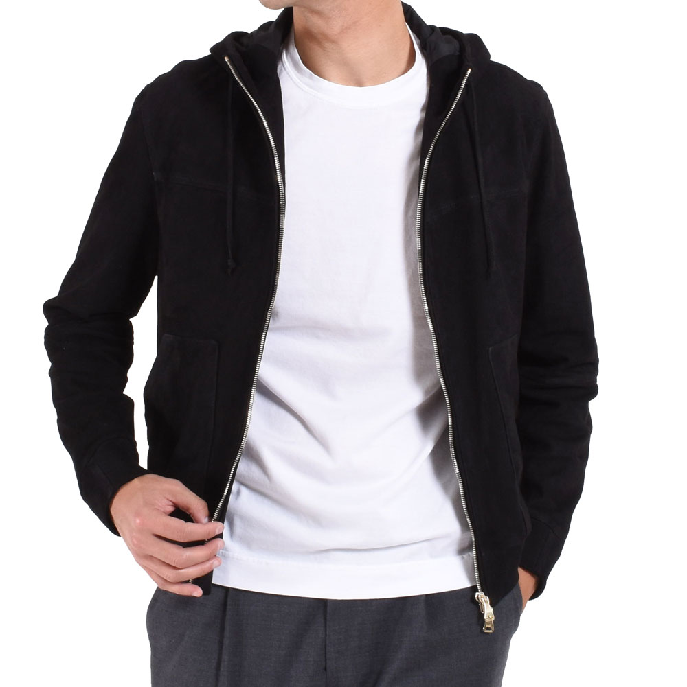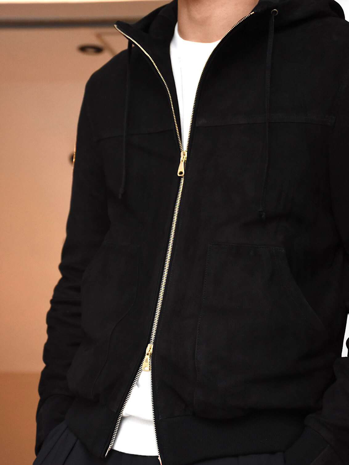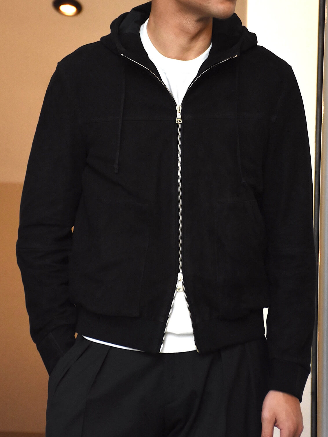 ・「EMMETI(エンメティ)」が得意とするスポーティなパーカー"PETER"は、本来はネオプレン(ダイビングなどで着用するウェットスーツにも使用される生地)とレザーの異素材コンビモデルです。それをよりラグジュアリーにすべくオールスウェードに仕上げたBR別注がこちら。