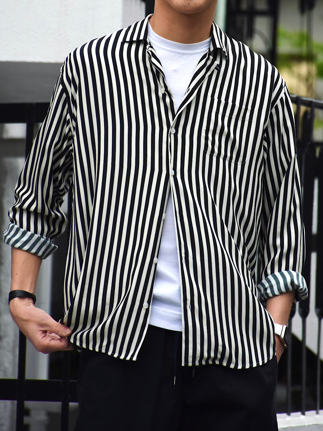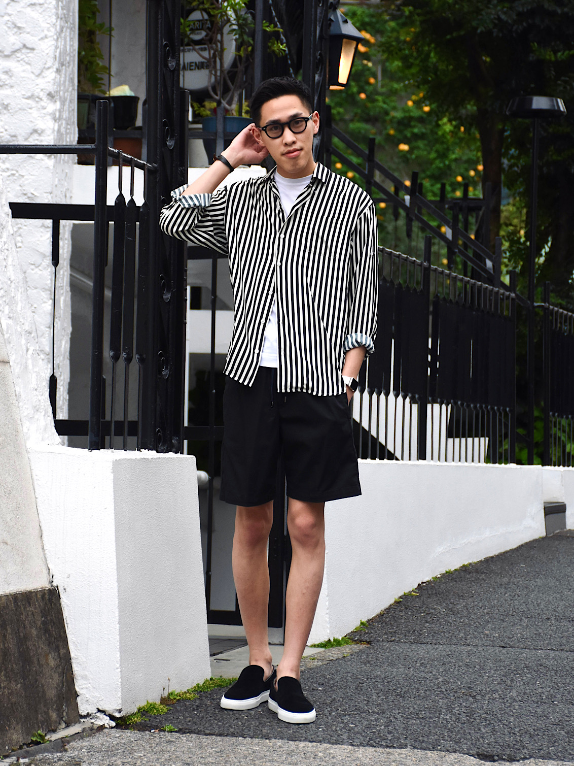・ブラックを着用し、ブラックのストライプシャツを合わせたスタイル