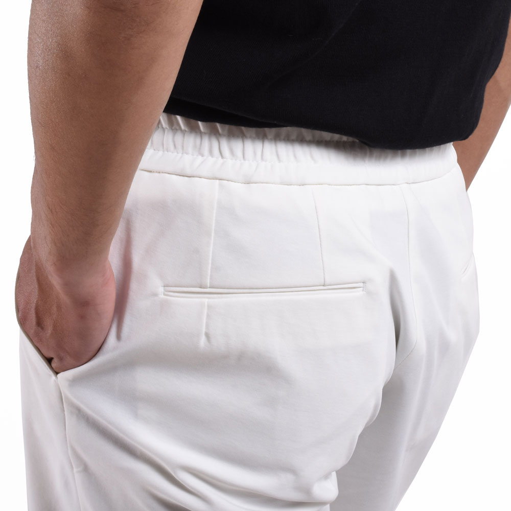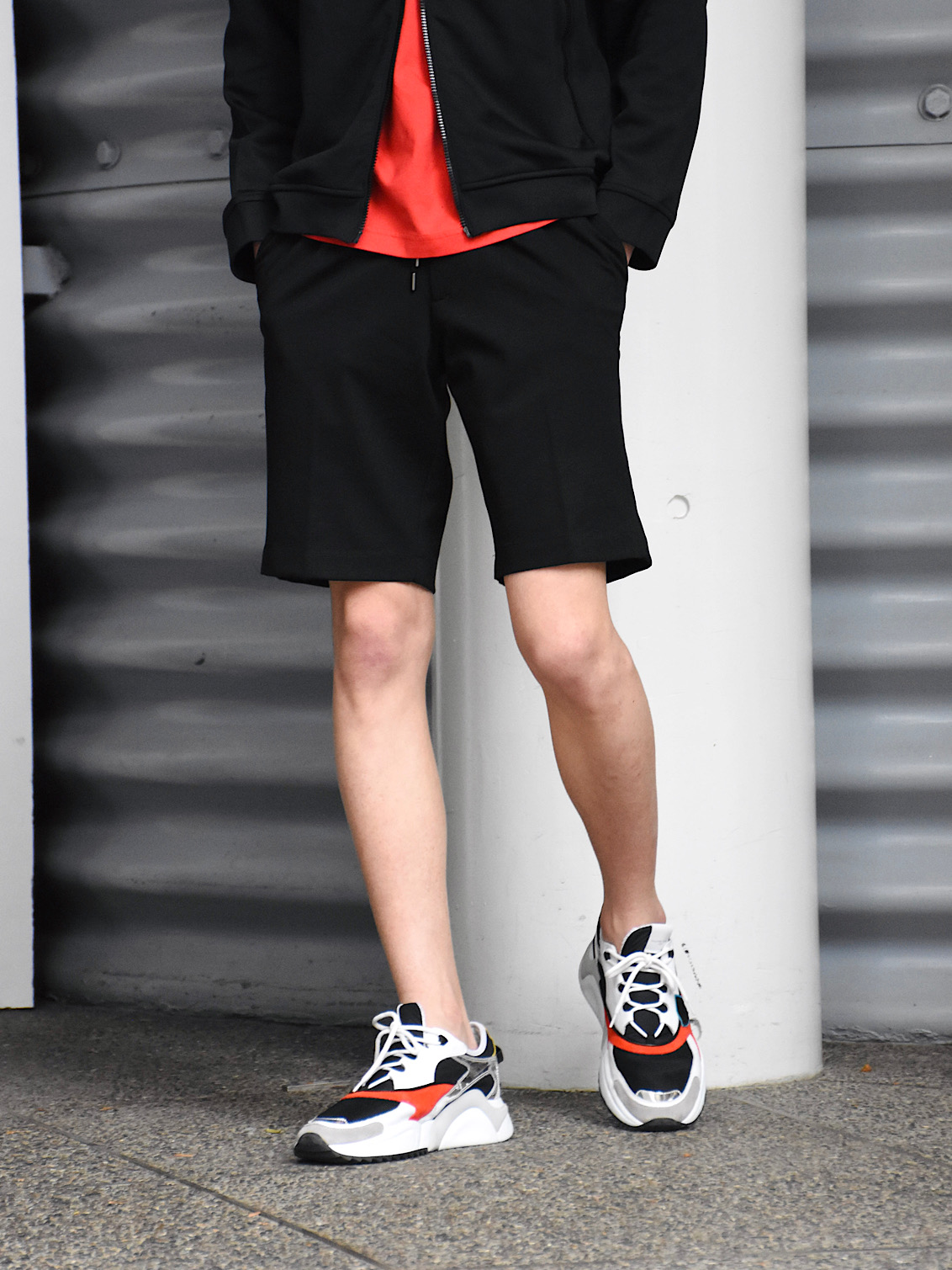 ・ストレッチ性抜群のジャージー素材に加え、腰廻りのゴムシャーリングによってとにかく穿き心地が楽!ドローコードを垂らしてちょい見せすれば、スポーティなムードを醸します。2色のラインナップ。