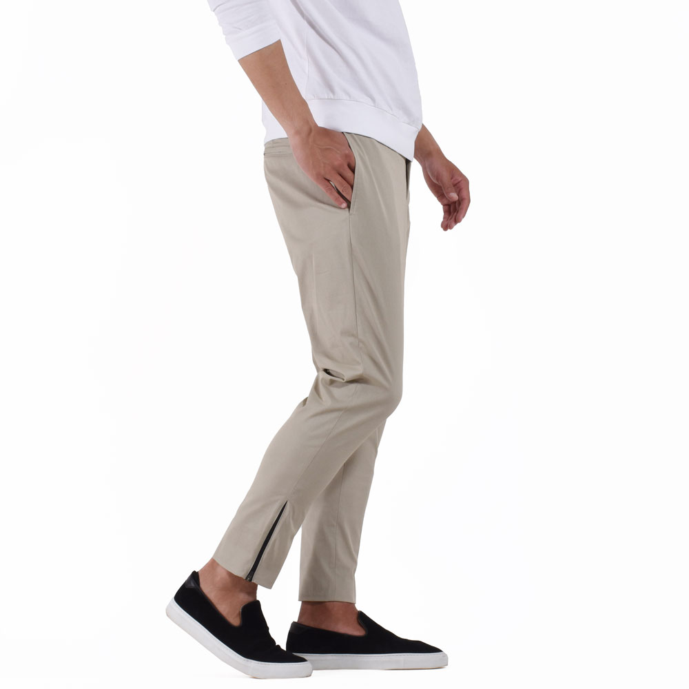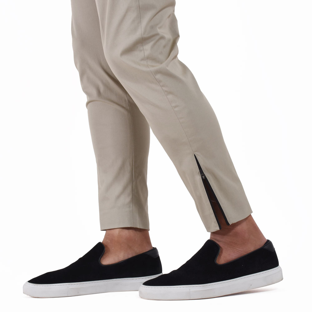 サラッとしたテクノコットン生地は暑い夏でも快適に着用頂けること間違いなし!ノープリーツでシンプルなデザインながら、裾のジップがアクセントに。ニュアンスを付けて穿きこなして頂くのが◎僕は普段自転車に乗る事が多いのですが、このような裾幅が細いパンツはそんなシーンにもピッタリだなと感じました。チェーンなどにも擦れないですし、もちろん暑いな〜と感じた時はジップを開けば風も入ってきて快適なんです!僕のライフスタイルにぴったりなんで、本気で欲しい!!
