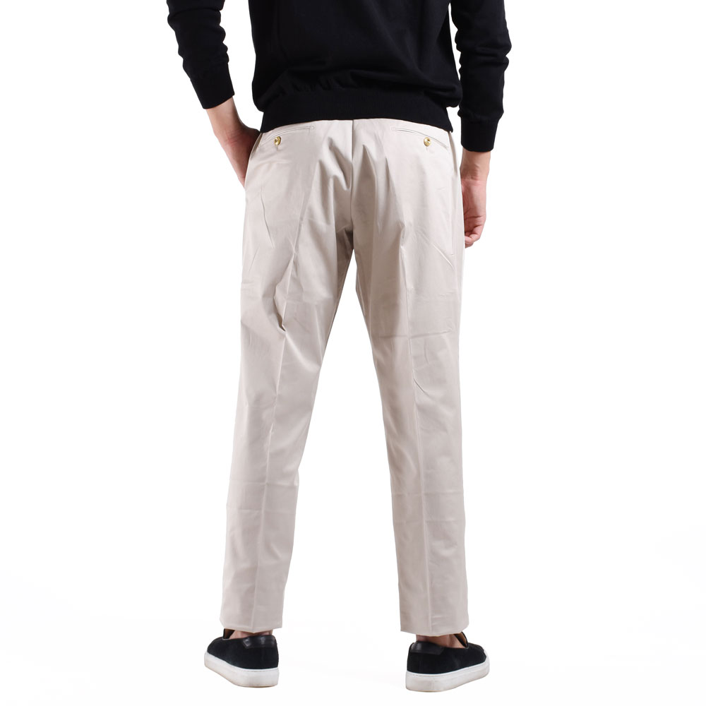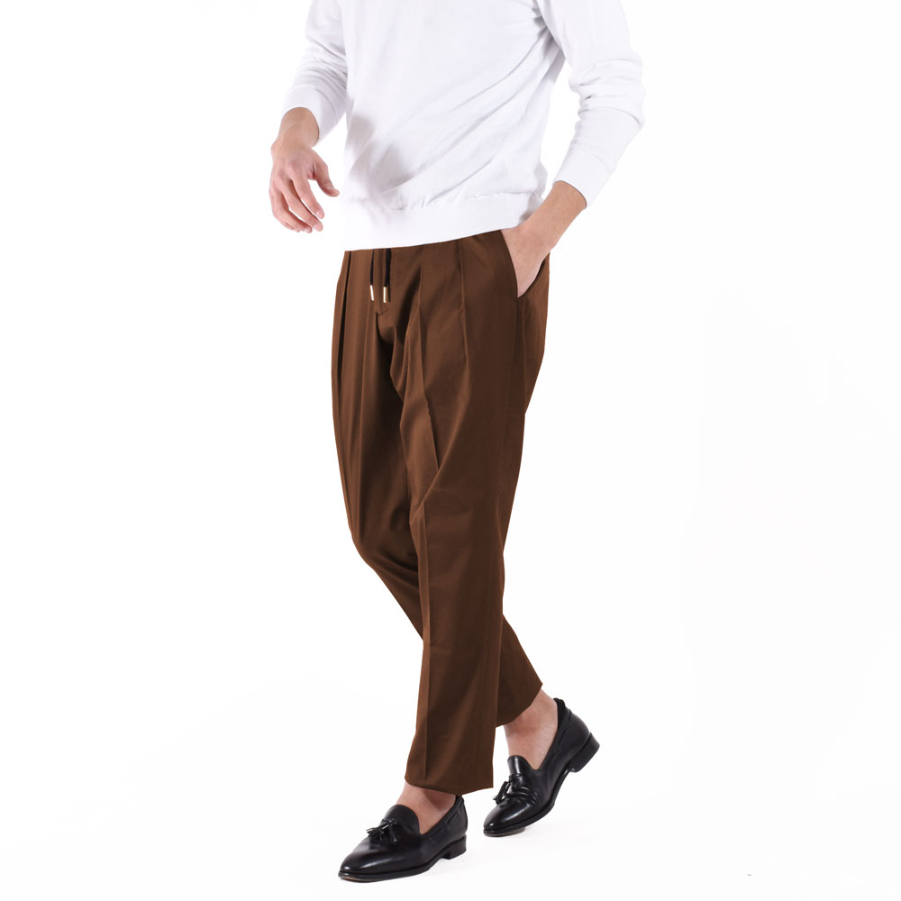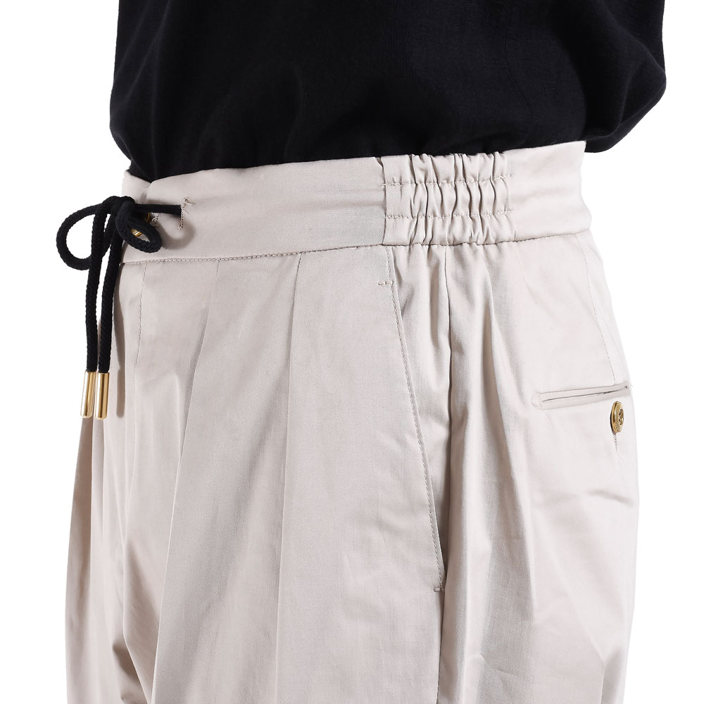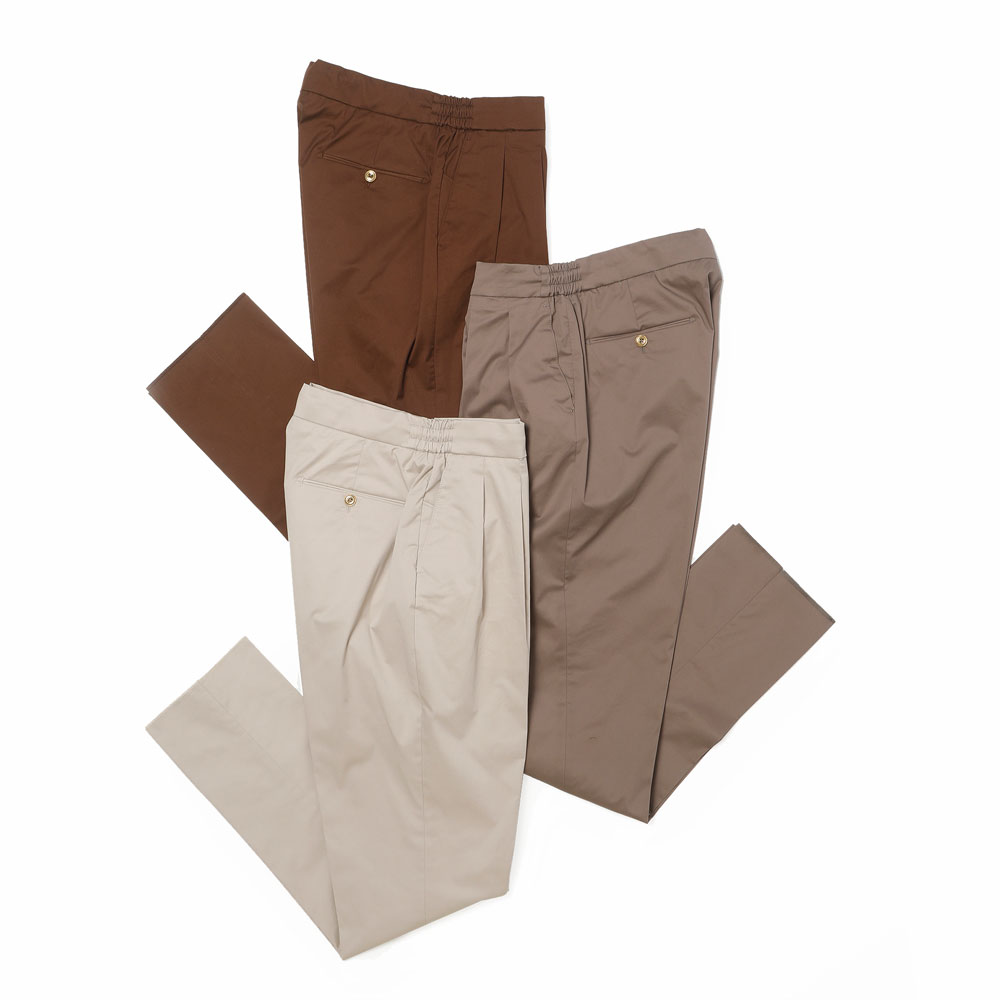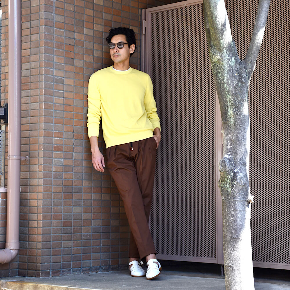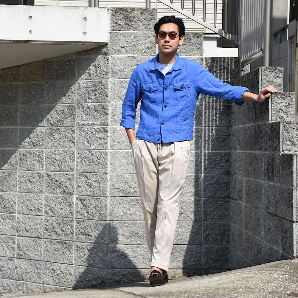 サイズ46を着用しジャストサイズでした。2インプリーツにより、腿周りに丸みがあるシルエットが特徴的なパンツです。太ももから裾にかけて綺麗にテーパードがかかっているので”野暮ったくない見えない”シルエット。さらさらとしたコットンの生地で穿き心地も抜群です。別注の裾はアンフィニッシュなので、お好みの丈感や裾の仕様を楽しんでいただけます。個人的には、少し短めに仕上げて軽快に穿きたい気分です!足元はローファーでもスニーカーでもOK。パンツでコーディネートにアクセントを加えたい時に重宝します!