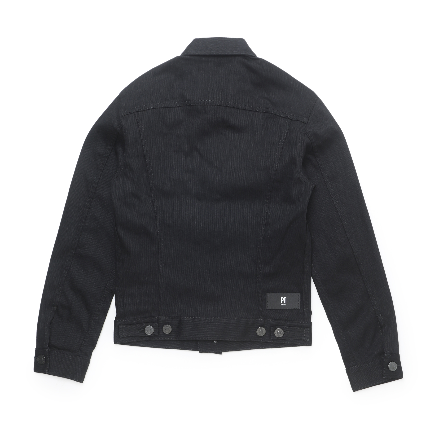 ・PTロゴが入ったボタンはガンメタリック、後身右裾にはモダンな配色のレザーパッチが配置。バックスタイルもキマります。