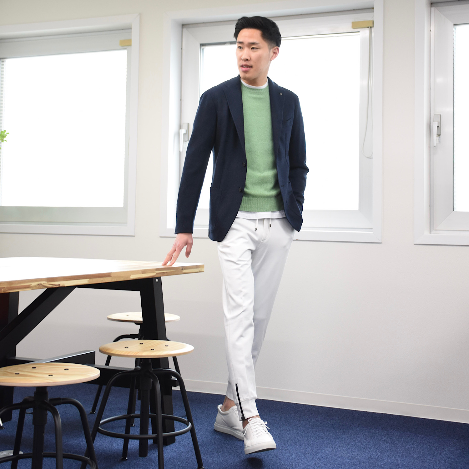 サイズ50を着用。ややスッキリ感のあるフィッティングでジャストサイズでした。ほんのりリラックスして着られたい場合はワンサイズ上げて頂くのもオススメ。カシミアならではのタッチと軽い着心地で上質感を存分に味わえる一着です。