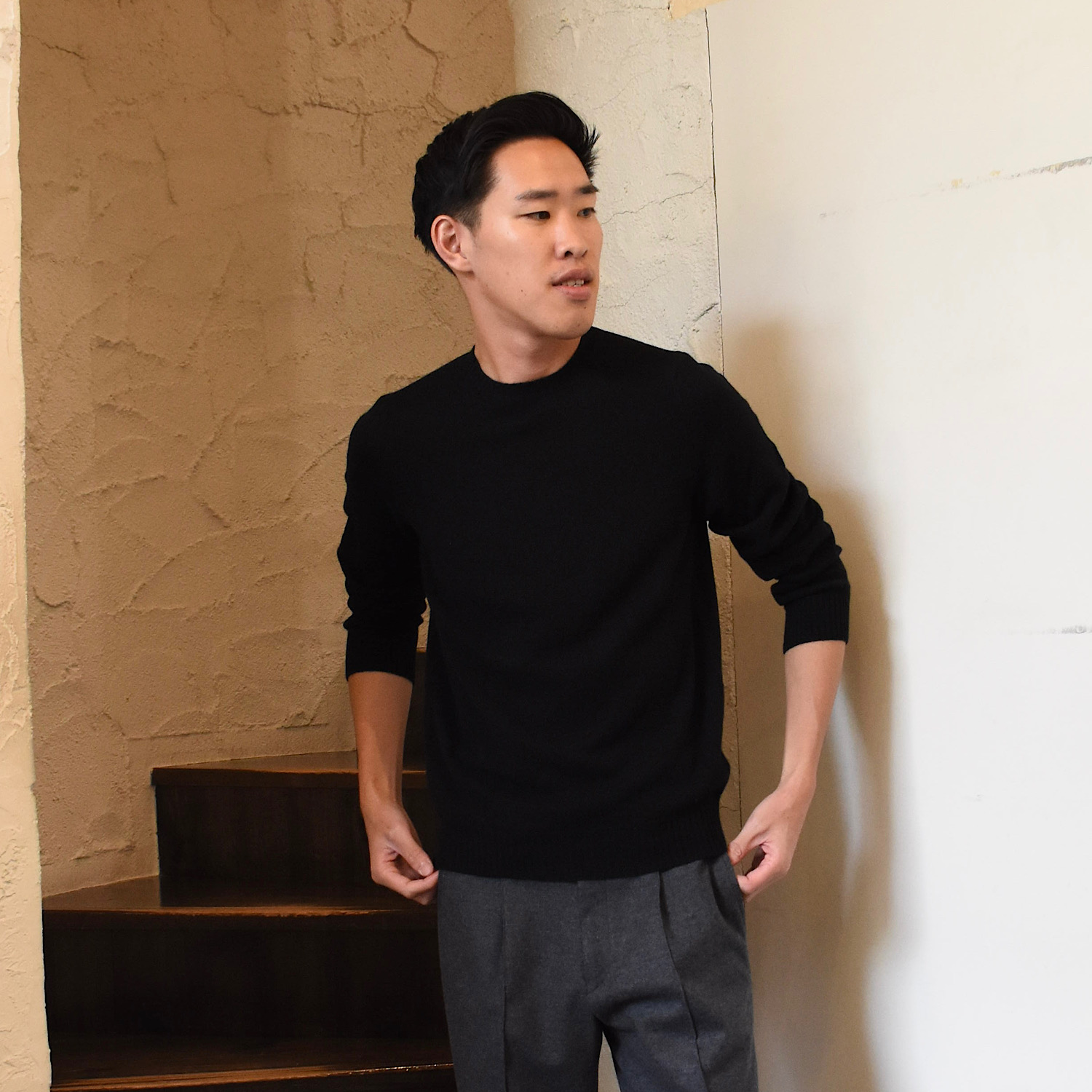 ・ニットの名門「FEDELI (フェデリ)」が使うカシミアはカシミアの中でも純度が高いものに限られており、そのカシミアから自社で糸を作り美しく編み上げた一着。