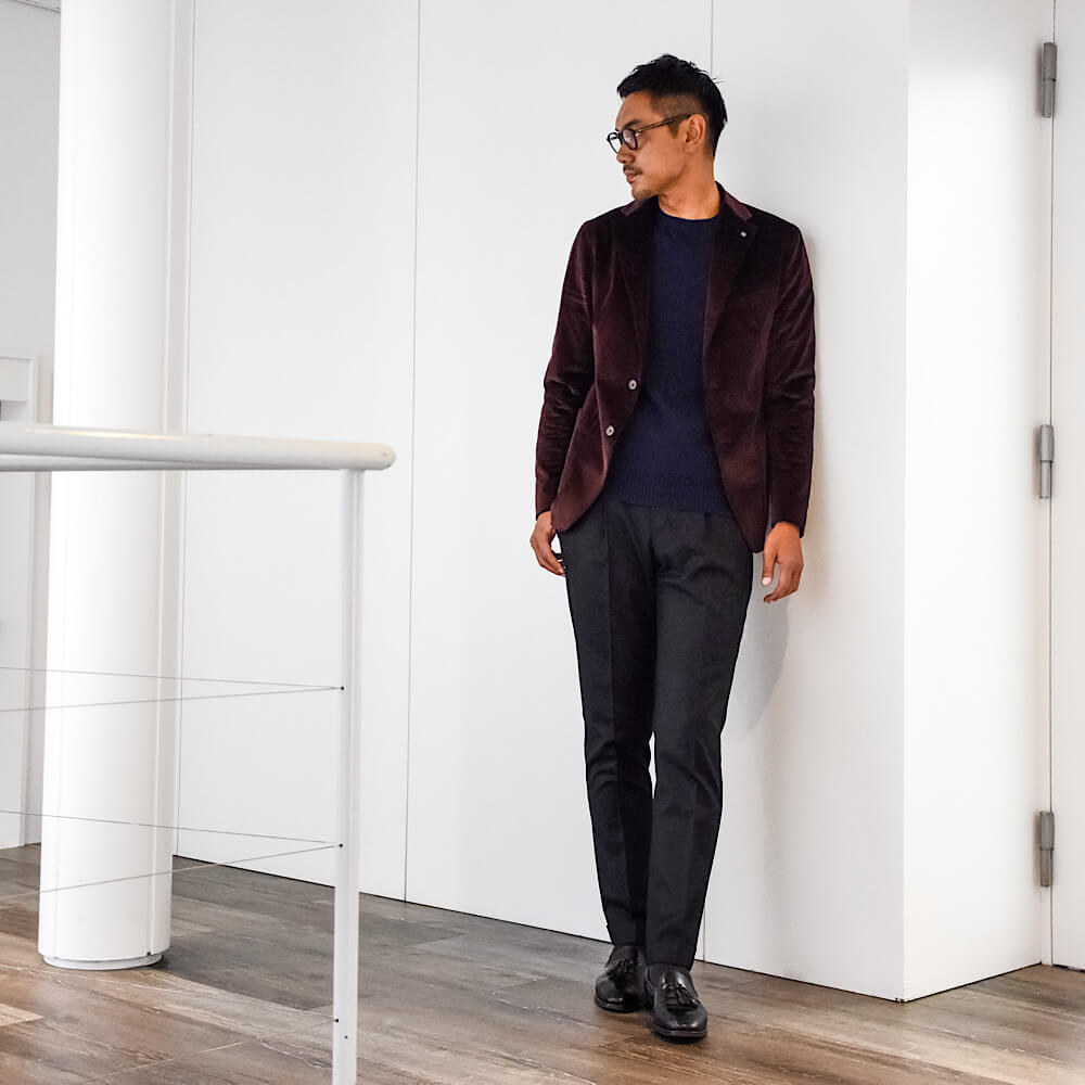 サイズ50を着用。ややスッキリ感のあるフィッティングでジャストサイズでした。ほんのりリラックスして着られたい場合はワンサイズ上げて頂くのもオススメ。カシミアならではのタッチと軽い着心地で上質感を存分に味わえる一着です。
