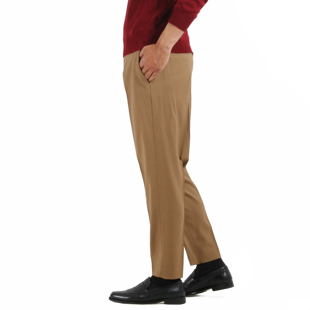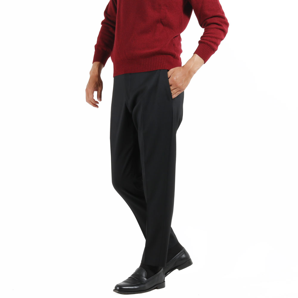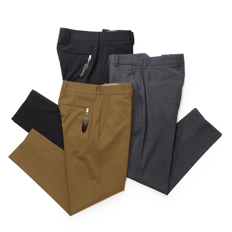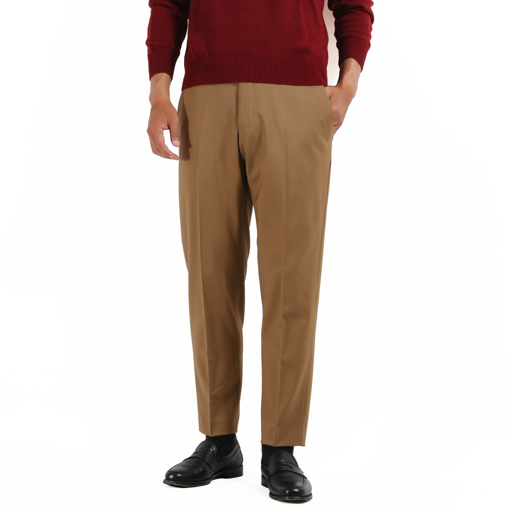 ・生地は、ウールの綾織りで、特有の程良いハリ感がありつつサラリとしたタッチで快適な穿き心地。もちろんストレッチが効いています。全4色(ダークグリーン)をラインナップ。