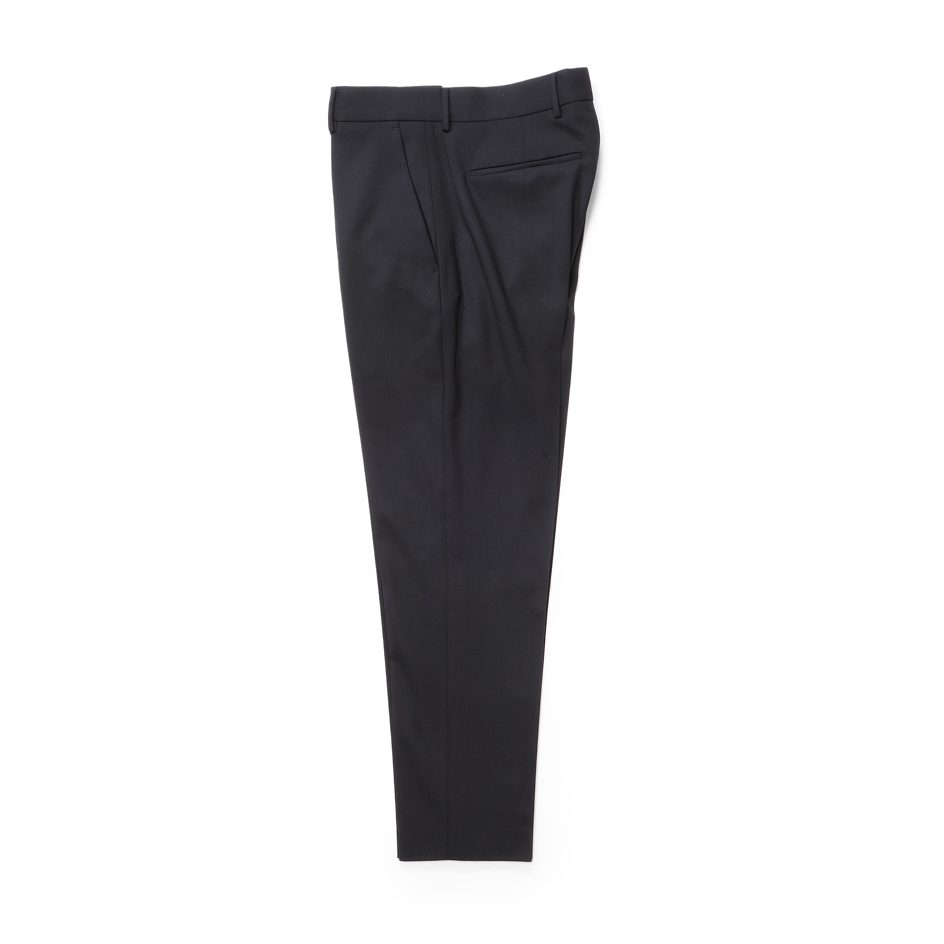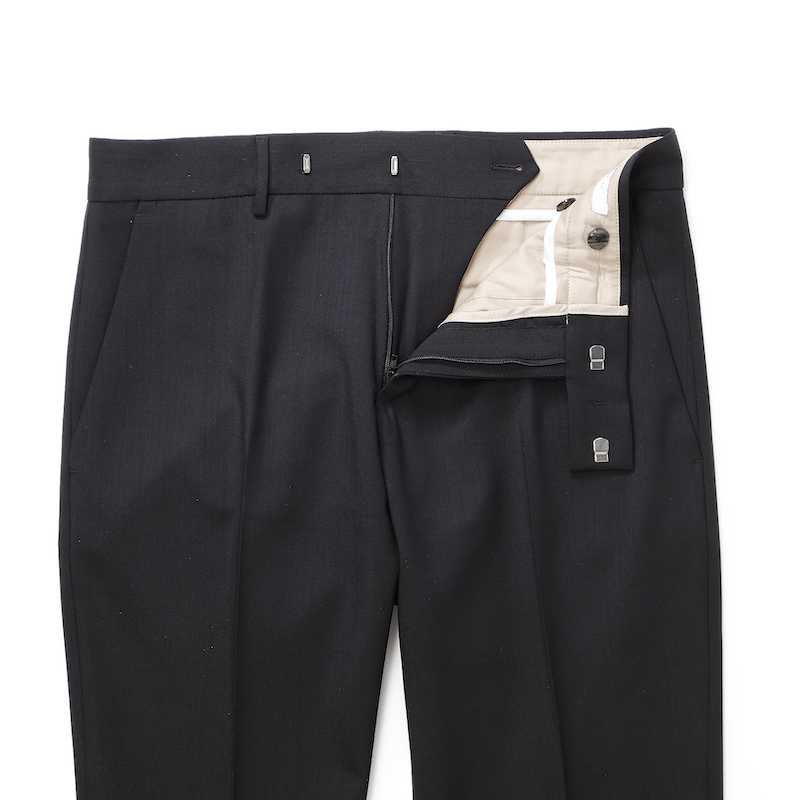 ・しっかりと確保された股上により、安心感ある腰廻りのフィッティングも特徴です。また、裾はアンフィニッシュではなくシングルにて仕上げられているので、(穿く方の股下寸法によっては)お直しナシで穿くことができるのも楽ですね。