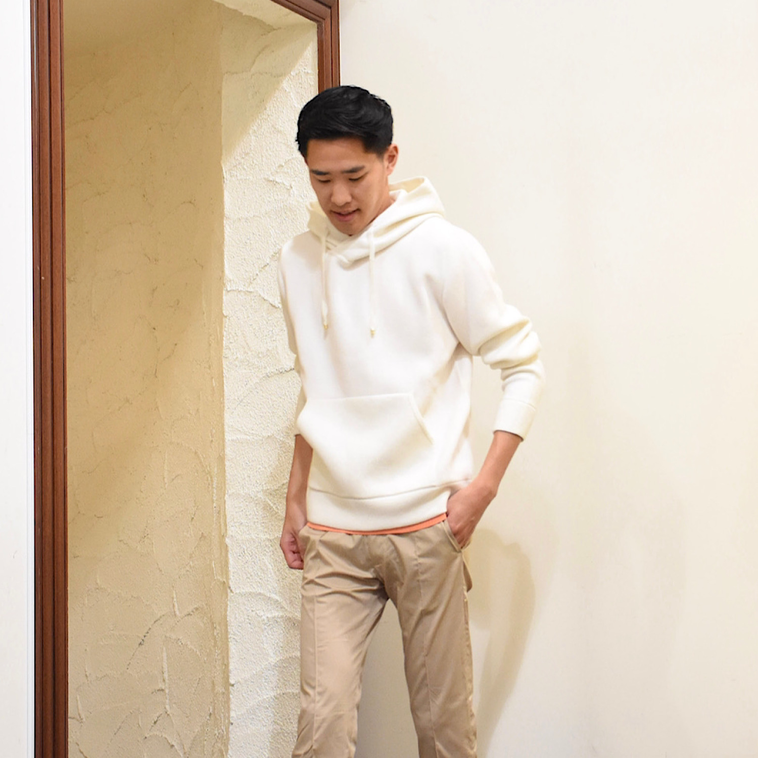 ・カシミアニットらしさを出しながら、ほどよくゆったりとしたシルエット、フードのボリューム感を実現するためスムース編みを採用し、肉感と伸縮性を両立。さらに編み上げた後に適度な洗い加工を施すことでカシミアらしいフワッとした質感も出しました。