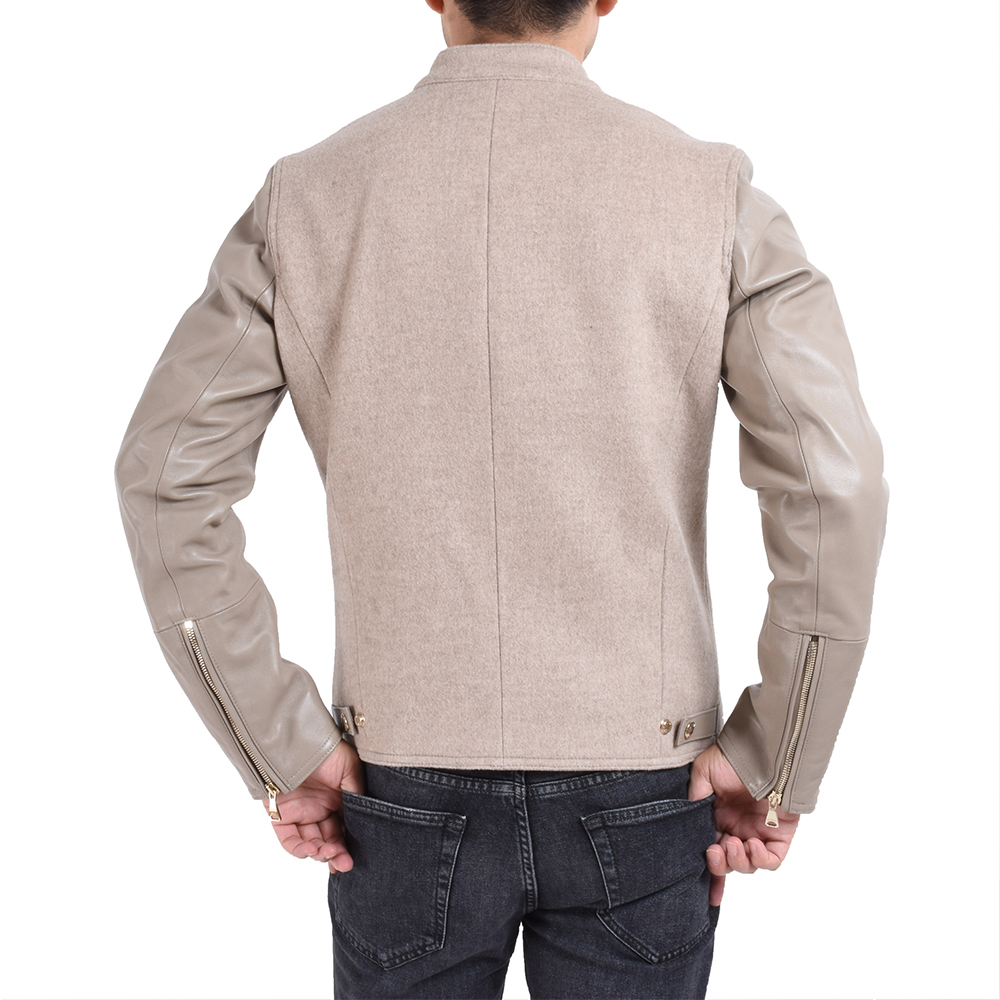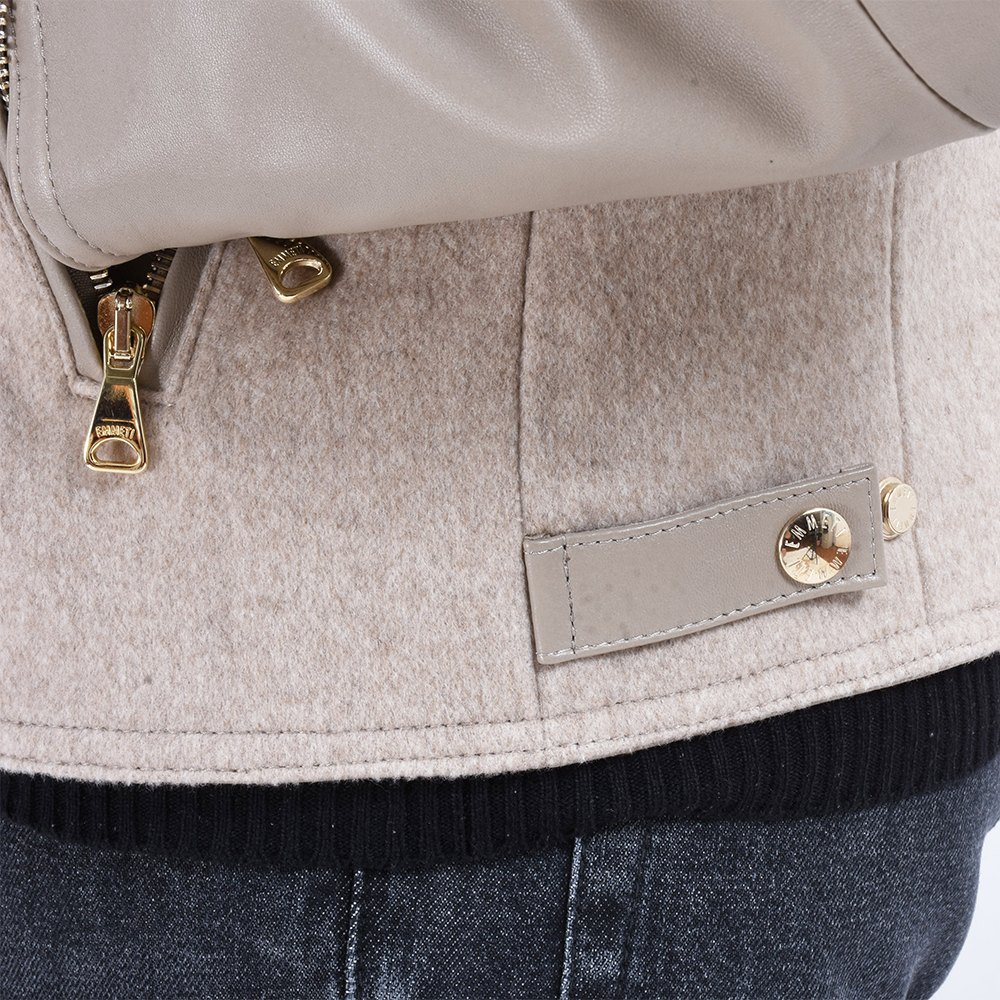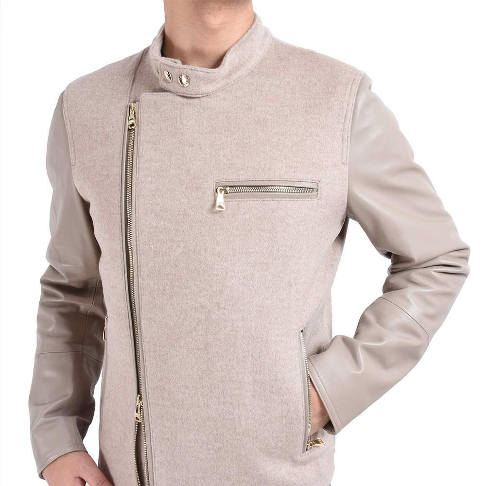 ・フィッティングは、ダブル合わせゆえにタイト過ぎない着心地。スマートなシルエットはもちろん健在で、袖やポケットのジップ、襟元や裾のスナップボタンは、ライトベージュ/ゴールドとブラック/シルバーにして、トーンを合わせています。