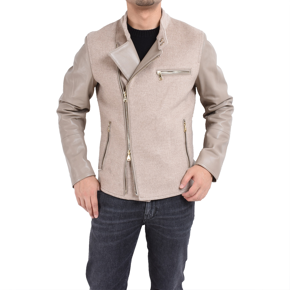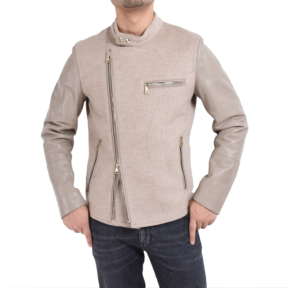 ・そもそもセミダブルはダブルライダースのハードさを抑えたデザインが特徴ですが、異素材コンビとなることで”スタジャン”的なムードも加わり、実にイマドキ顔な仕上がりとなりました。