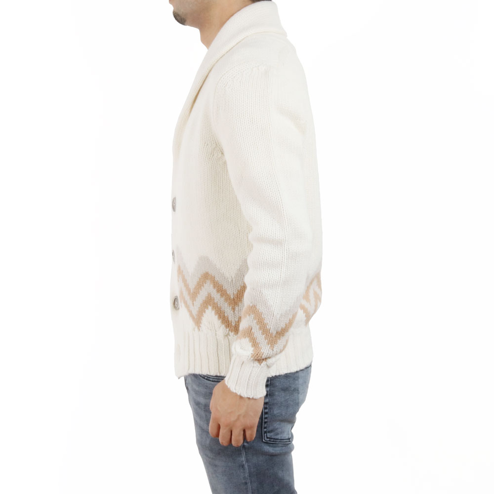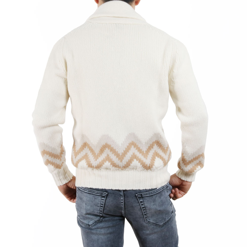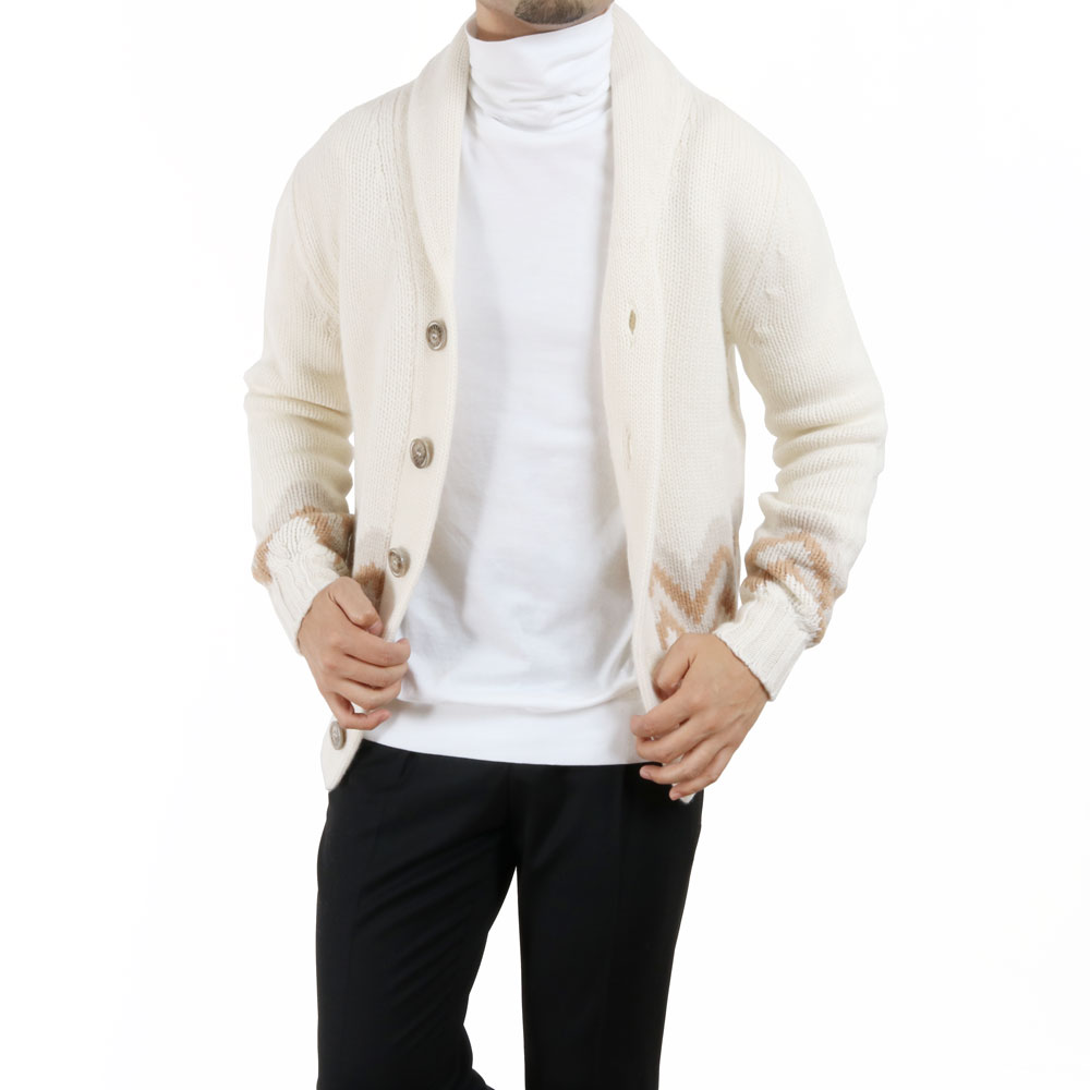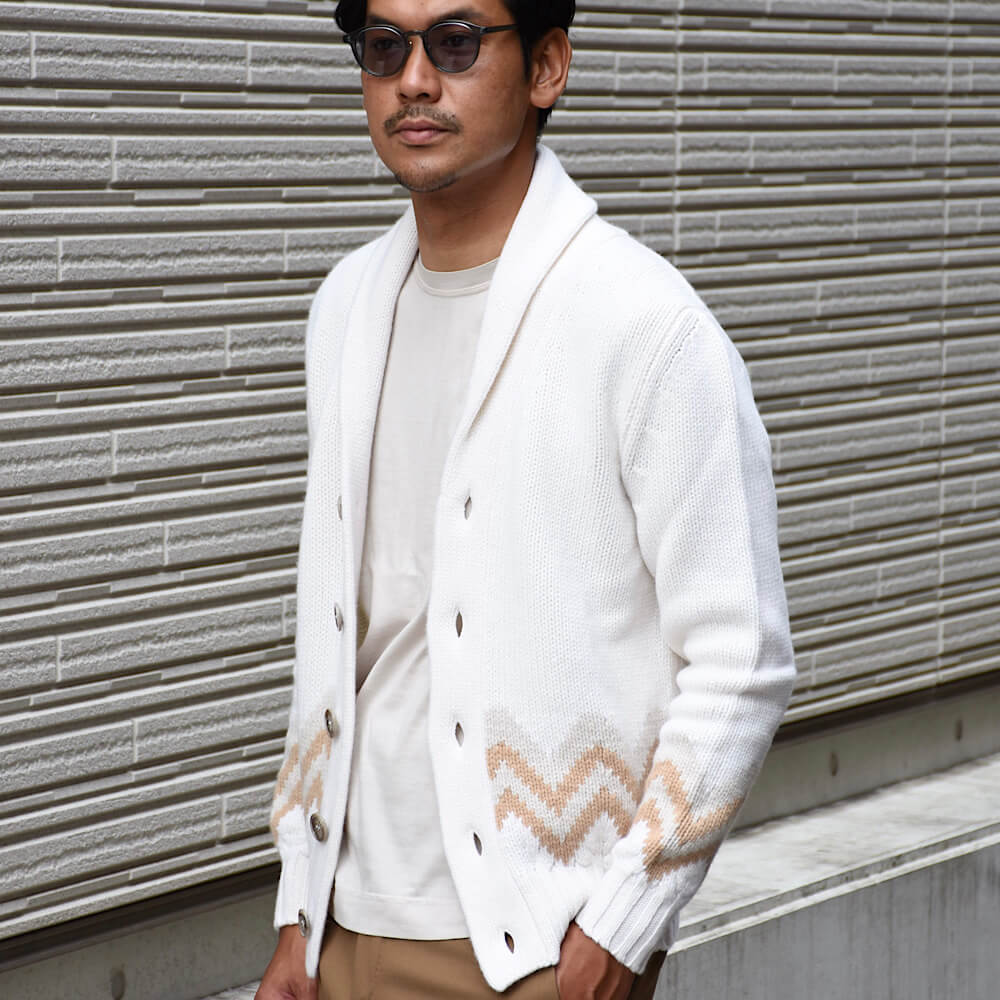 ・身頃と袖に大胆に配された幾何学模様がポイントで完全なハンドインターシャ編みの本領発揮と言ったところ。大人こそが着たいと思わせる上品さがあり、ベースカラーのオフホワイトから絶妙にズラした配色にイタリアブランドらしい遊び心が感じられます。また、少し大きめなフェデリネーム入りの高級感あるフロントボタンといったディテールもパーフェクト。プライスに見合う価値ある一着です。
