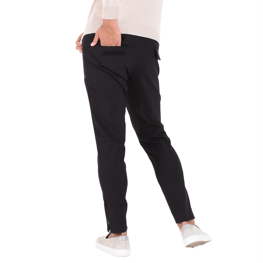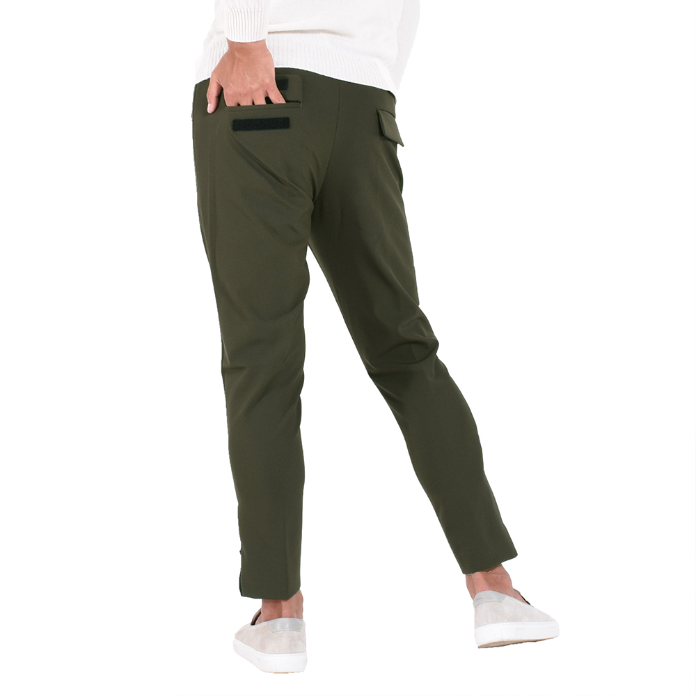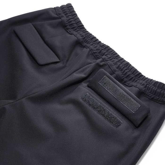 • ノープリーツ、ウエストゴム&ドローコード付き、裾口ジップ仕様、フロントジップ、フロントジップポケット2つ、バックフラップ&マジックテープ付きポケット2つ