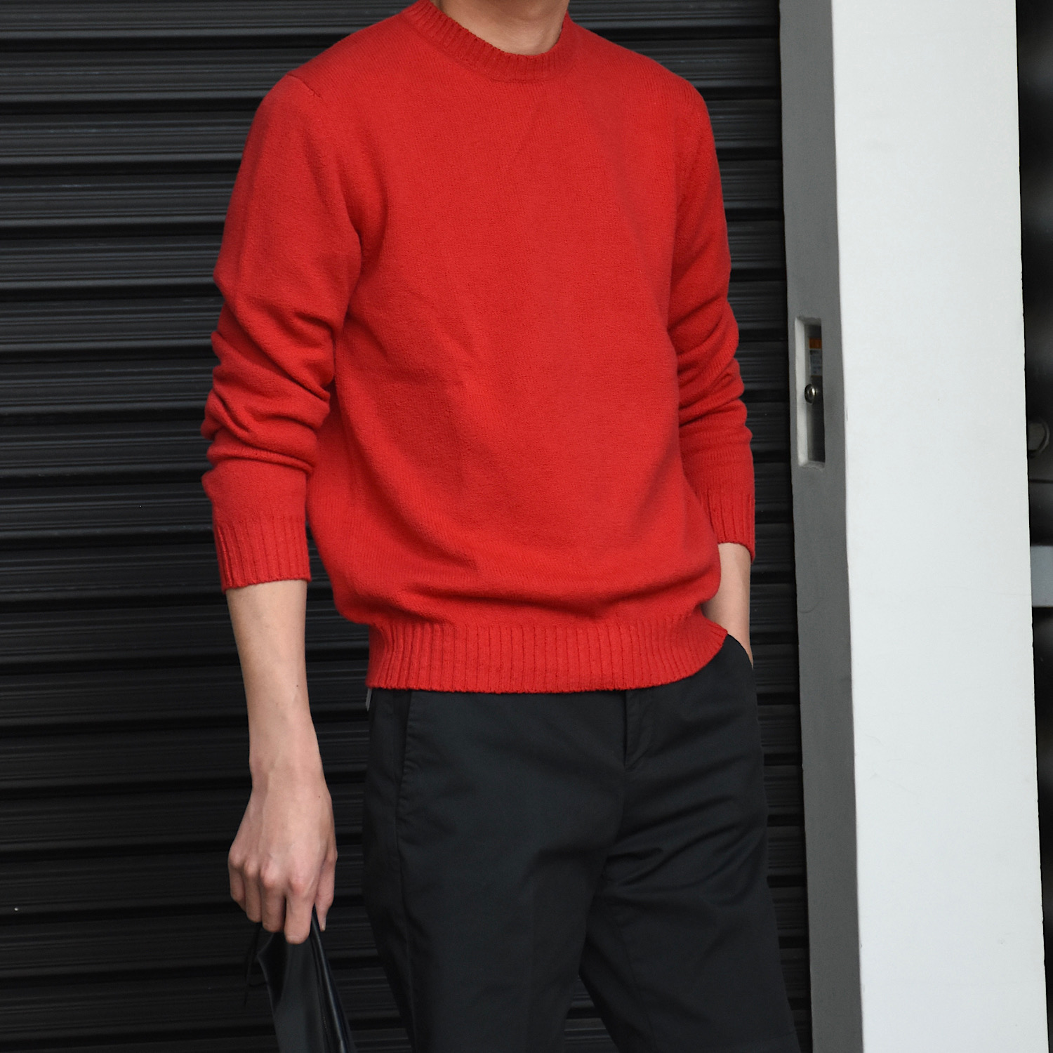 サイズ44を着用。丁度良いサイズ感でした。パイルのような編み地は程よく凹凸感があり、1枚だけでもサマになるニットです。また発色も良くイタリアならではの色気を感じます。リブの太さやテンションも良いことからワードローブに加わりそうな予感です。