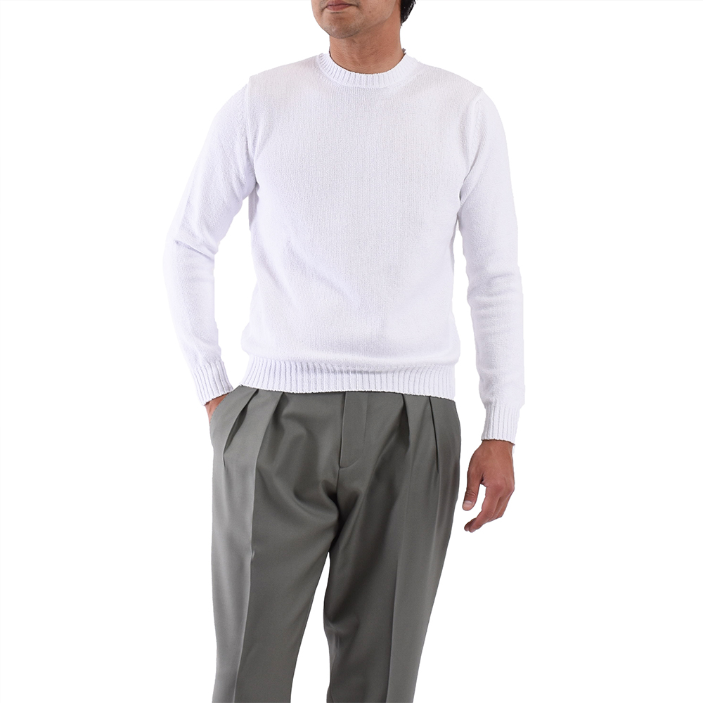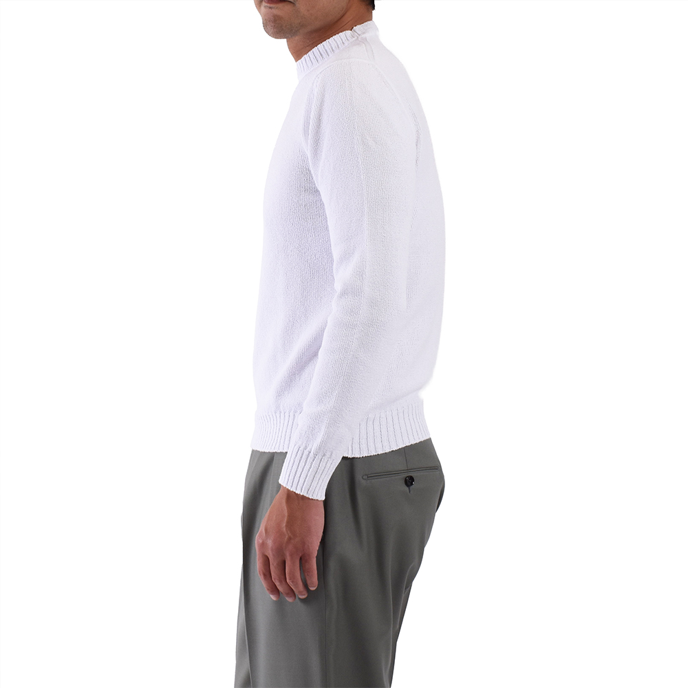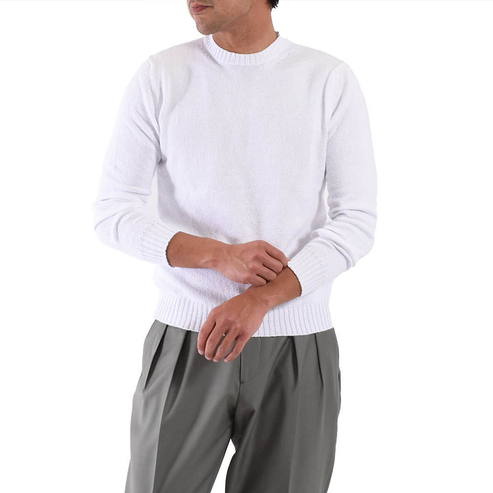・単糸の7ゲージで編み立てられているためミドルゲージに属するものの、目が詰まったパイルのような編み地ゆえ一枚で着てもふっくらと立体感のある見映えを実現します。ローゲージ感覚で着て頂ける一枚。
