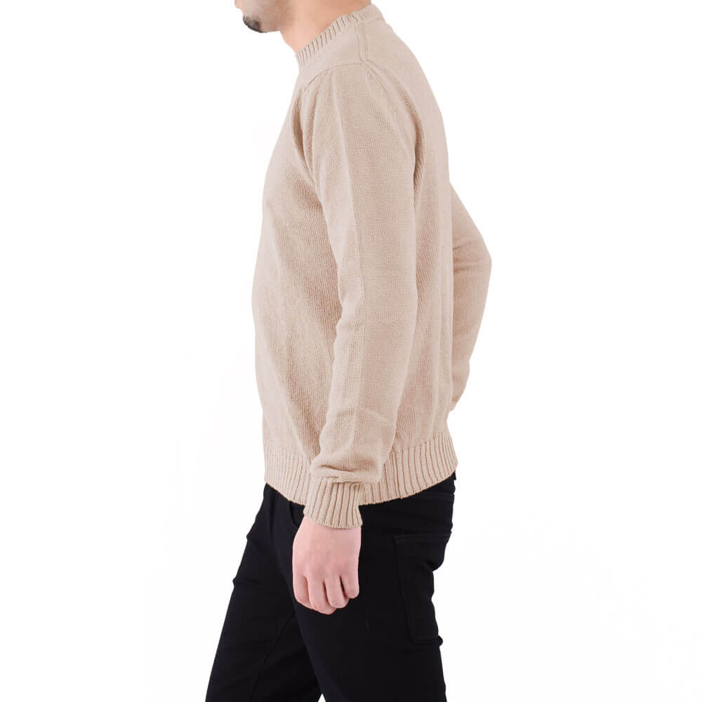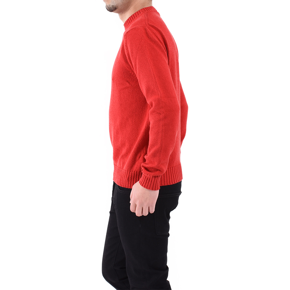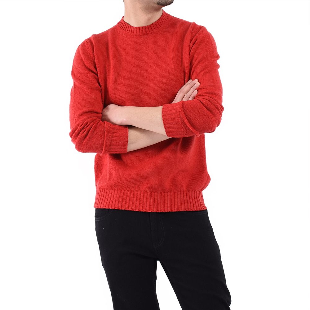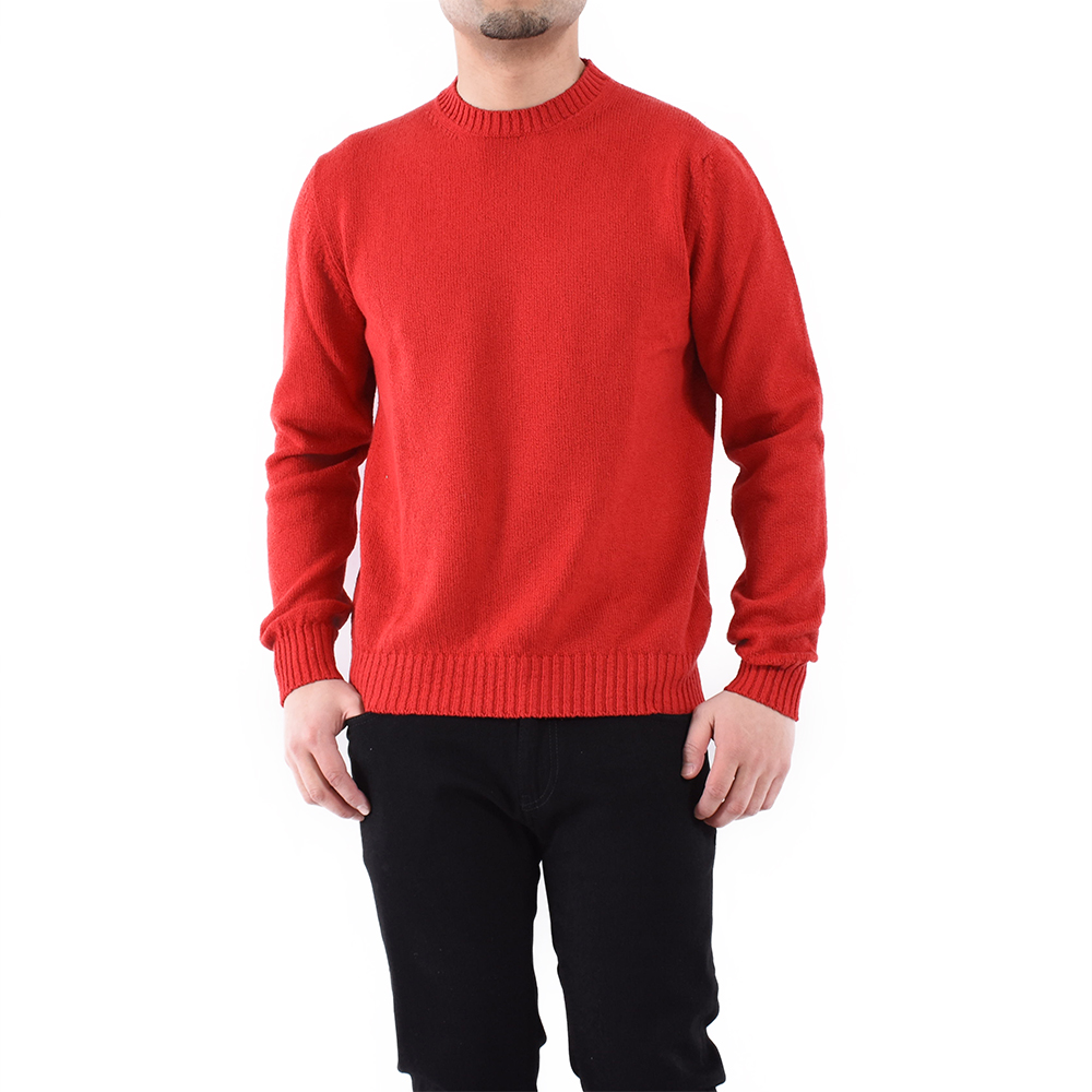 ・単糸の7ゲージで編み立てられているためミドルゲージに属するものの、目が詰まったパイルのような編み地ゆえ一枚で着てもふっくらと立体感のある見映えを実現します。ローゲージ感覚で着て頂ける一枚。