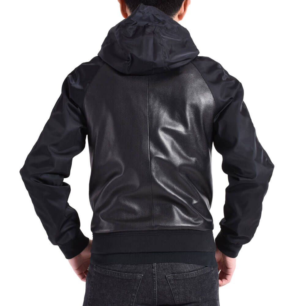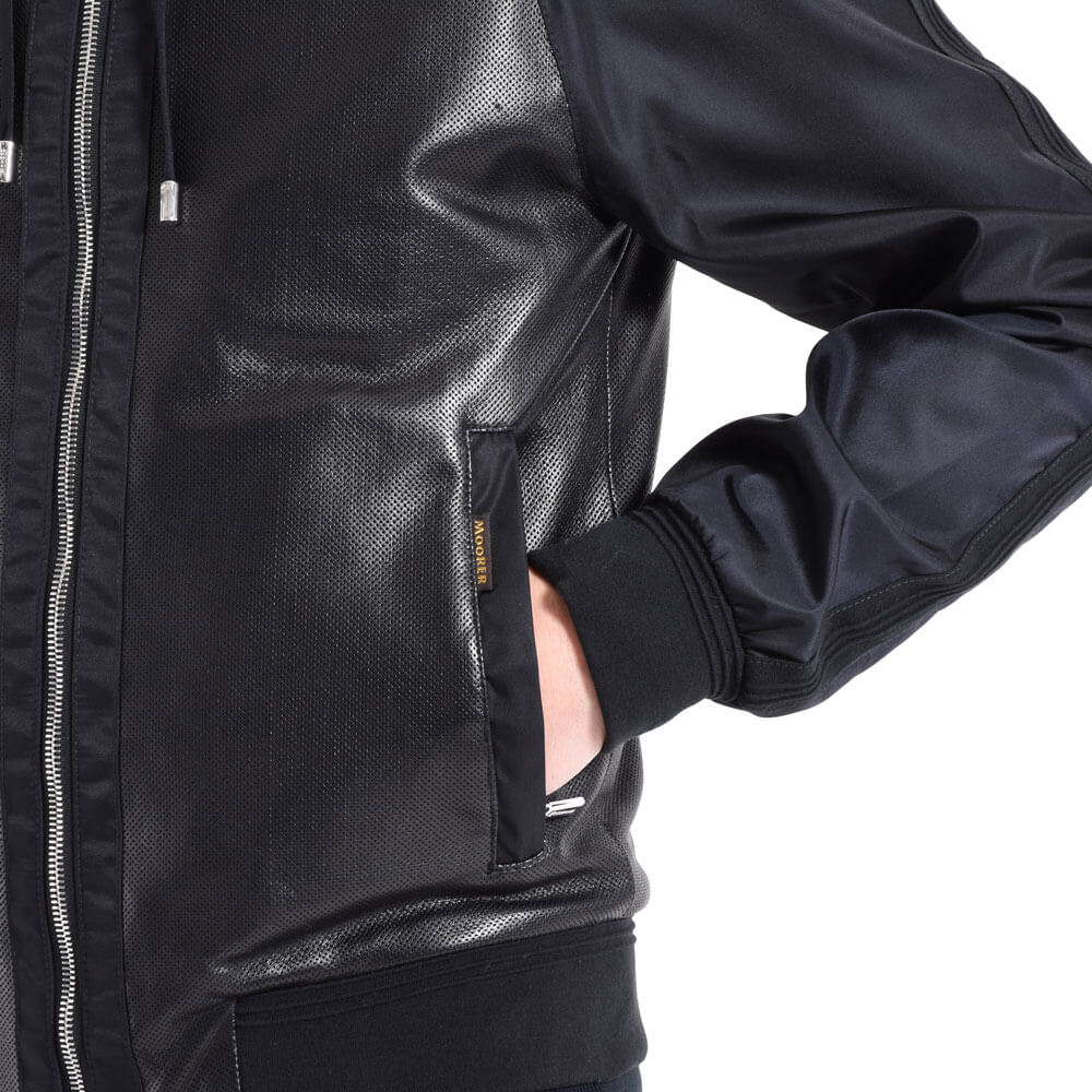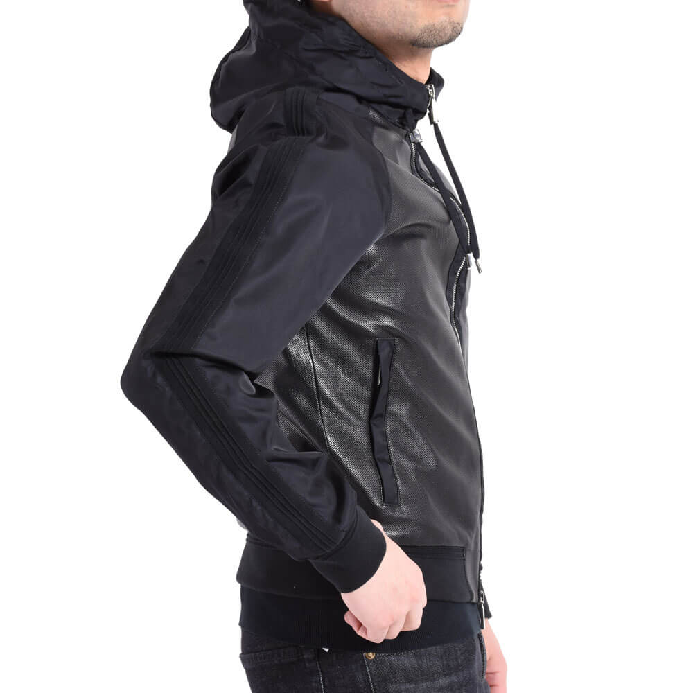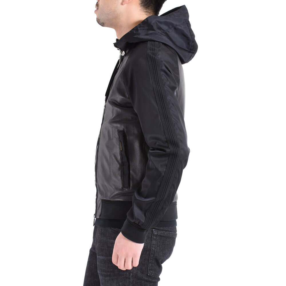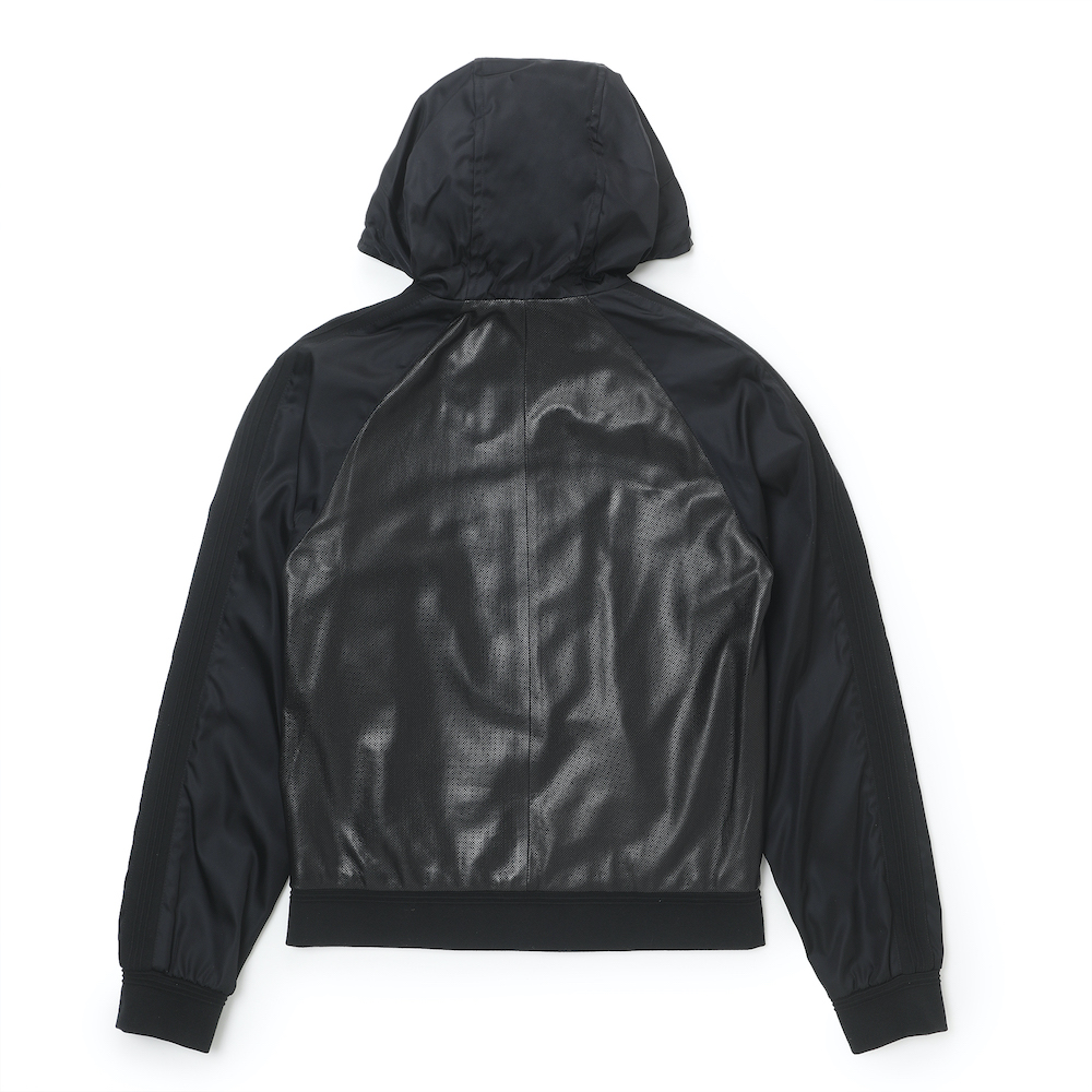 ・身頃にはパンチングレザー、フードやスリーブにはナイロンを組み合わせた異素材コンビモデルの”COSIMO”。ジップアップパーカーのデザインに加え、ナイロン素材のスリーブには袖と裾リブと同素材で切り替えしのラインを配することでスポーティなデザイン性を高めています。