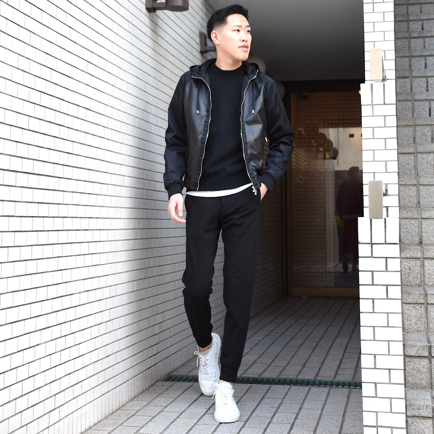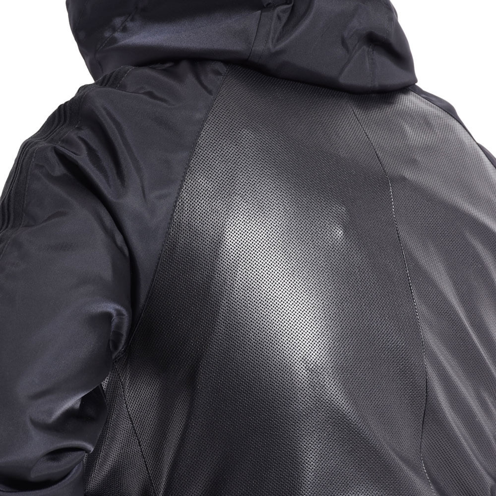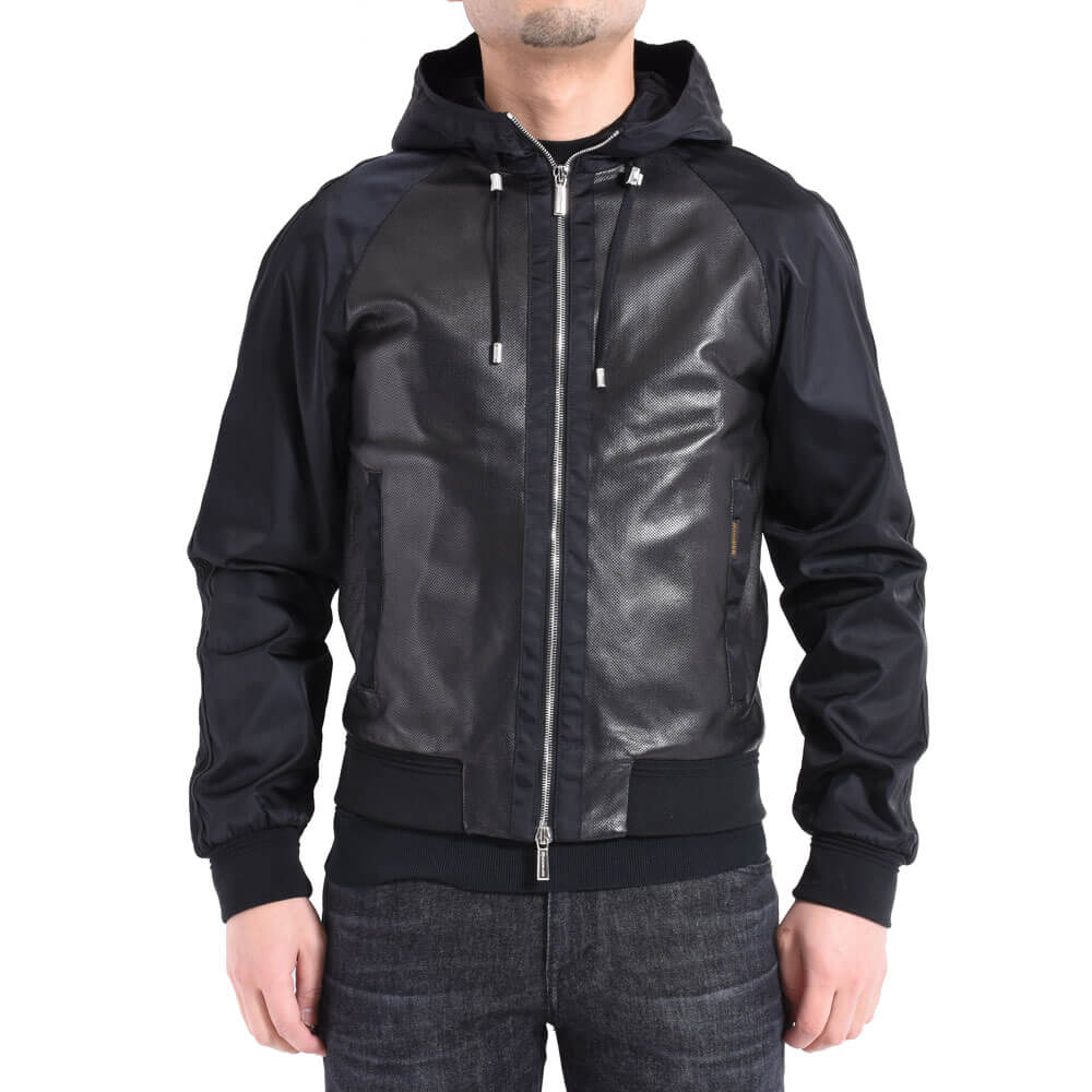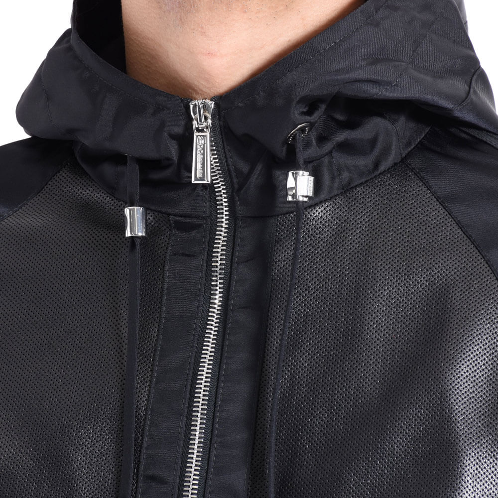 ・身頃にはパンチングレザー、フードやスリーブにはナイロンを組み合わせた異素材コンビモデルの”COSIMO”。ジップアップパーカーのデザインに加え、ナイロン素材のスリーブには袖と裾リブと同素材で切り替えしのラインを配することでスポーティなデザイン性を高めています。