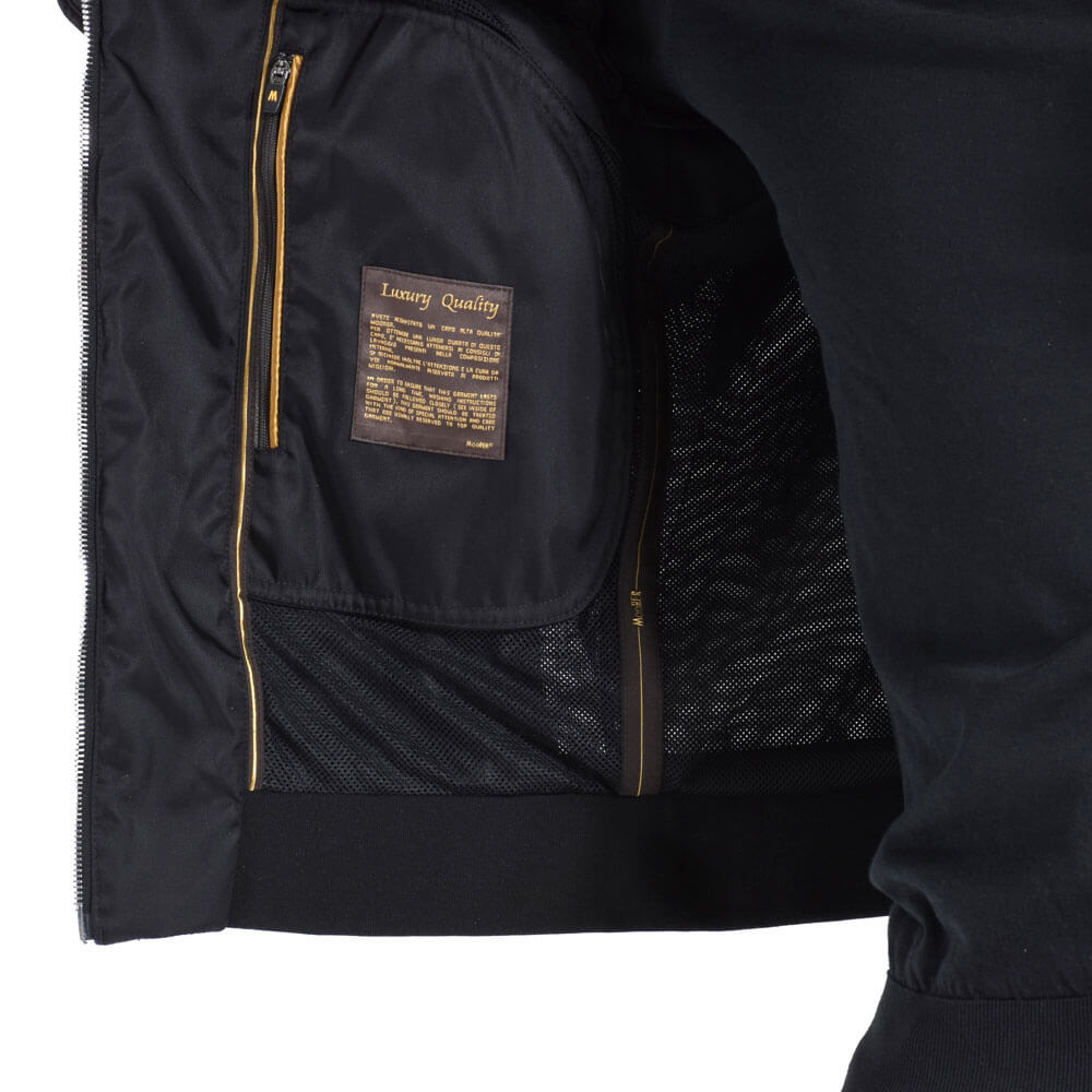 ・同ブランドが誇る圧倒的なクオリティーにもご注目を。ジップの引き手やドローコード留め具といった付属品はオリジナルで、表側のみならず裏側の細かい始末にも手を抜かない仕事ぶりです。例えば、イエローゴールドのパイピングによる補強という実用性も併せ持った裏側の仕様は見事の一言で、配色もラグジュアリー感がありデザイン的にも優れています。