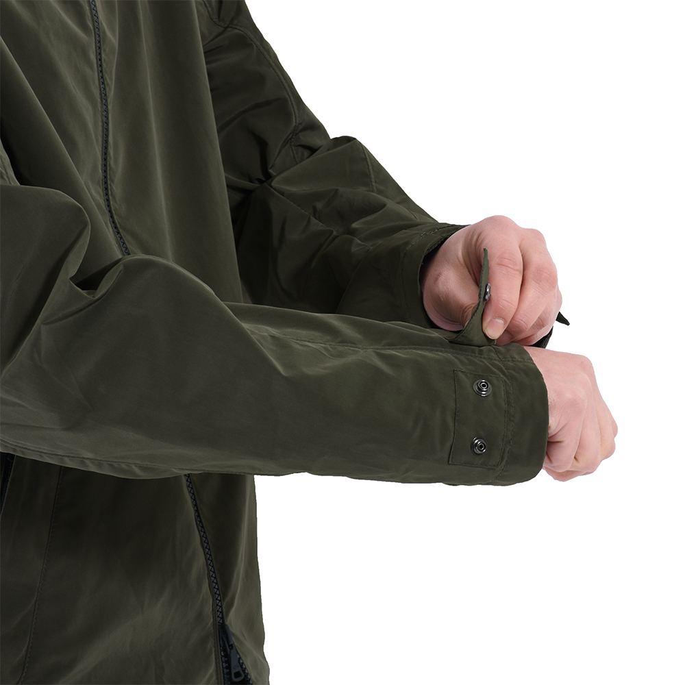 ・こちらは130度という高温で圧縮することで高密度に仕上げたポリエステル&ナイロン素材を使用したパーカー。しっかりと目が詰まっているため、肌触りが良く、素肌に触れても心地良いのです。また、軽量でコンパクトになり、風雨に強く、そして快適な柔らかさが得られるという、機能性と着心地の良さを両立した仕上がりです。