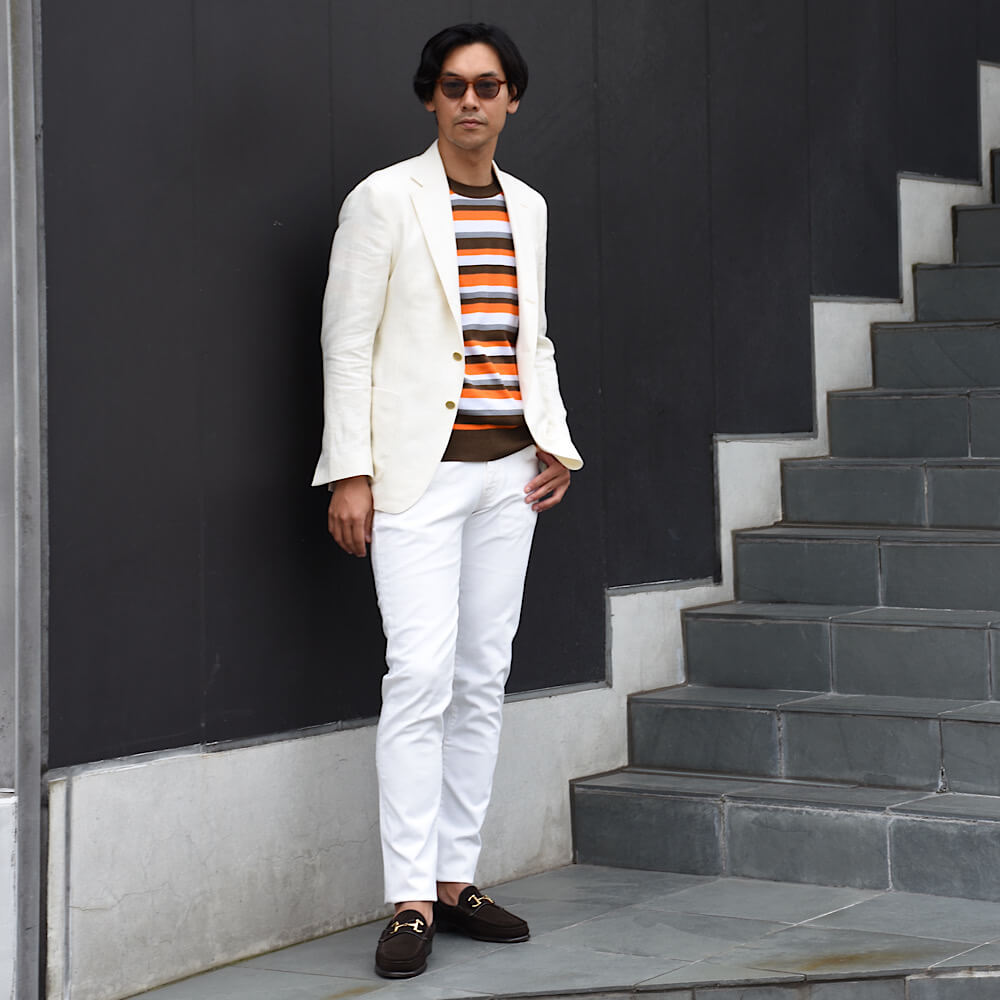 待っていました!清潔感溢れる白ジャケットの登場です。気が引けると思いきや、そうでもないのがこのジャケット。リネンが60%入っていることによりカジュアルな見た目と優しい風合いにより雰囲気が柔らかくなります。また、真っ白ではなく黄味が掛かった白なので嫌味のないところもポイント。加えて高級感のある光沢が特徴のヘリンボーンですが、こちらはほんのりと光沢が控えめで落ち着きがあります。大人の余裕を感じさせつつ、ポイントで「GOLDのメタルボタン」。抜きどころと押しどころの調和が取れた優れたジャケットです。