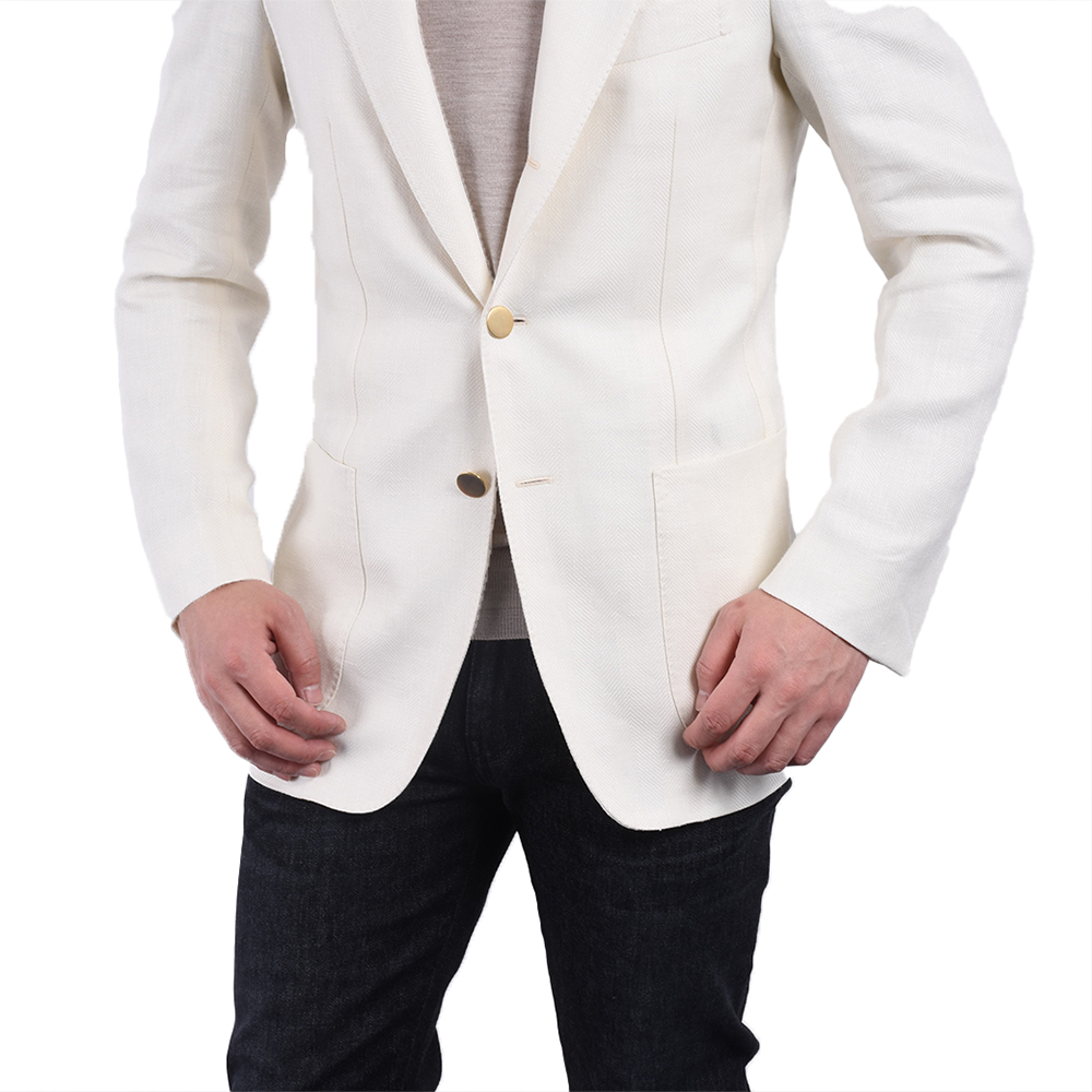 ・生地はヘリンボーン織りの清涼感あるリネン&ウール。サラッとしたタッチでしなやかさもあり、着心地の軽さが特徴です。目付は260グラム。