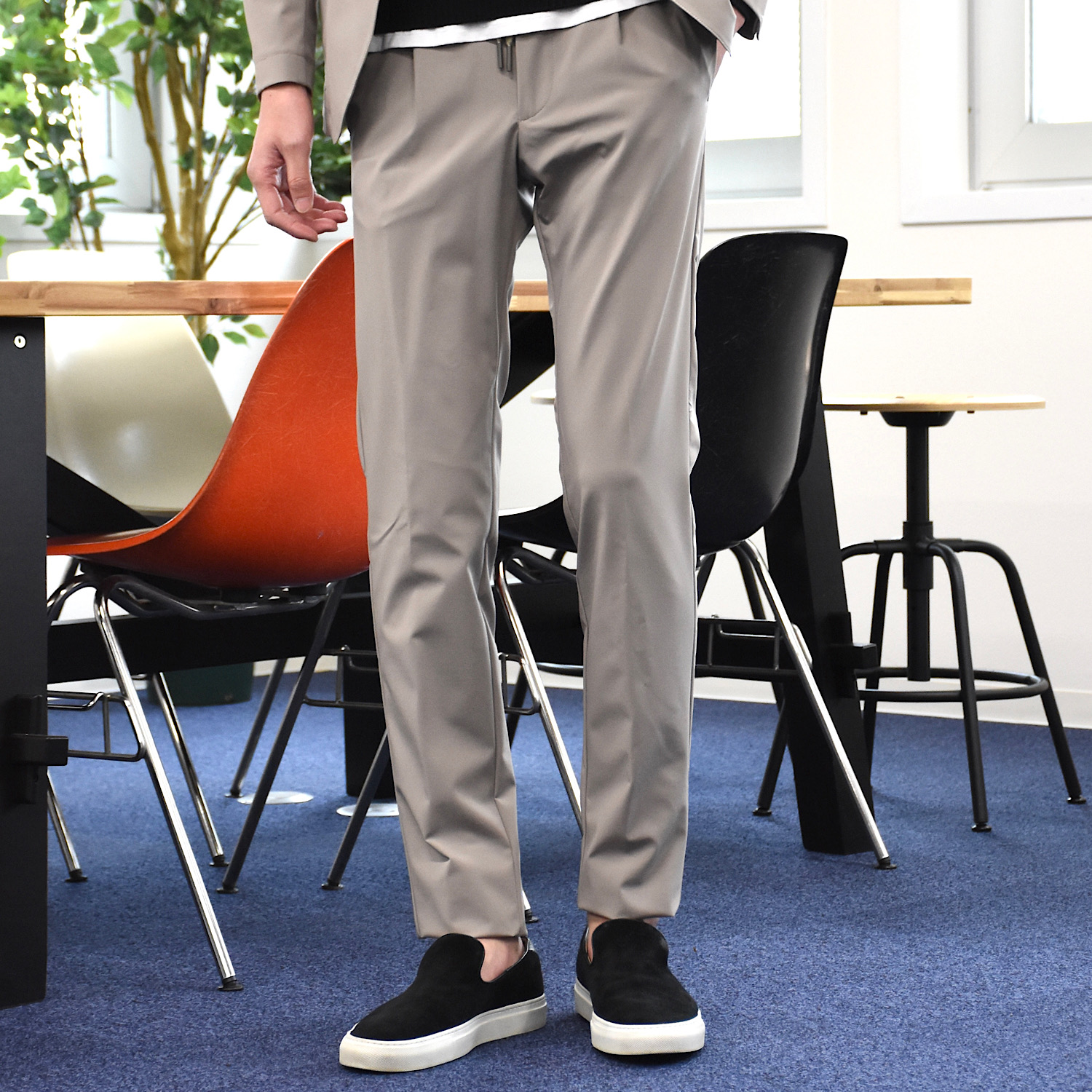 ・「TAGLIATORE(タリアトーレ)」のウエストシャーリンゴム&ドローコード付きのリラックスパンツは1プリーツ。腰廻りとワタリはほんのりゆとりがありつつも、美しくテーパードしたシルエットによってスッキリとした印象を与えます。