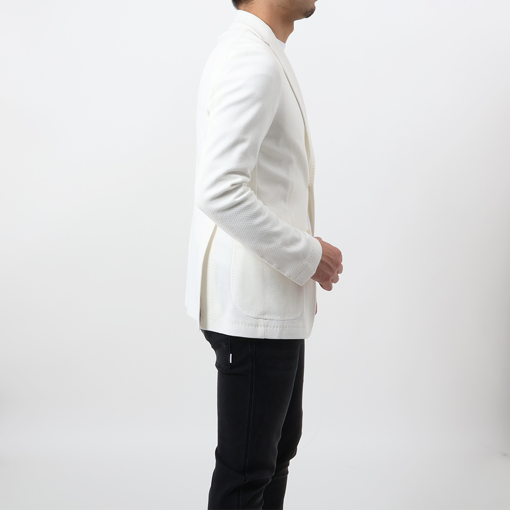 見るからにソフトな雰囲気を醸す「TAGLIATORE(タリアトーレ)」のジャージージャケット。ジャージーゆえに伸縮性は抜群の上、メッシュ編みなので通気性が良く、快適かつリラックスして着ていただけます。目付けは400グラムです。
