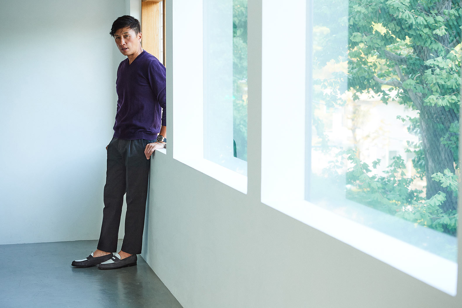 ・右ヒップポケットのボタンはアイコンである"W"を象って付けられていたりと遊び心が感じられるディテールは健在。適度なカジュアル感がありつつ、持ち出しがつけられたフロントデザインはベルトレスでも違和感なし。ゆえにトップスを選ばず、足元もカジュアルなレザーシューズからスニーカーまで、品の良さを保ちつつ幅広いスタイルに合わせられるのです。