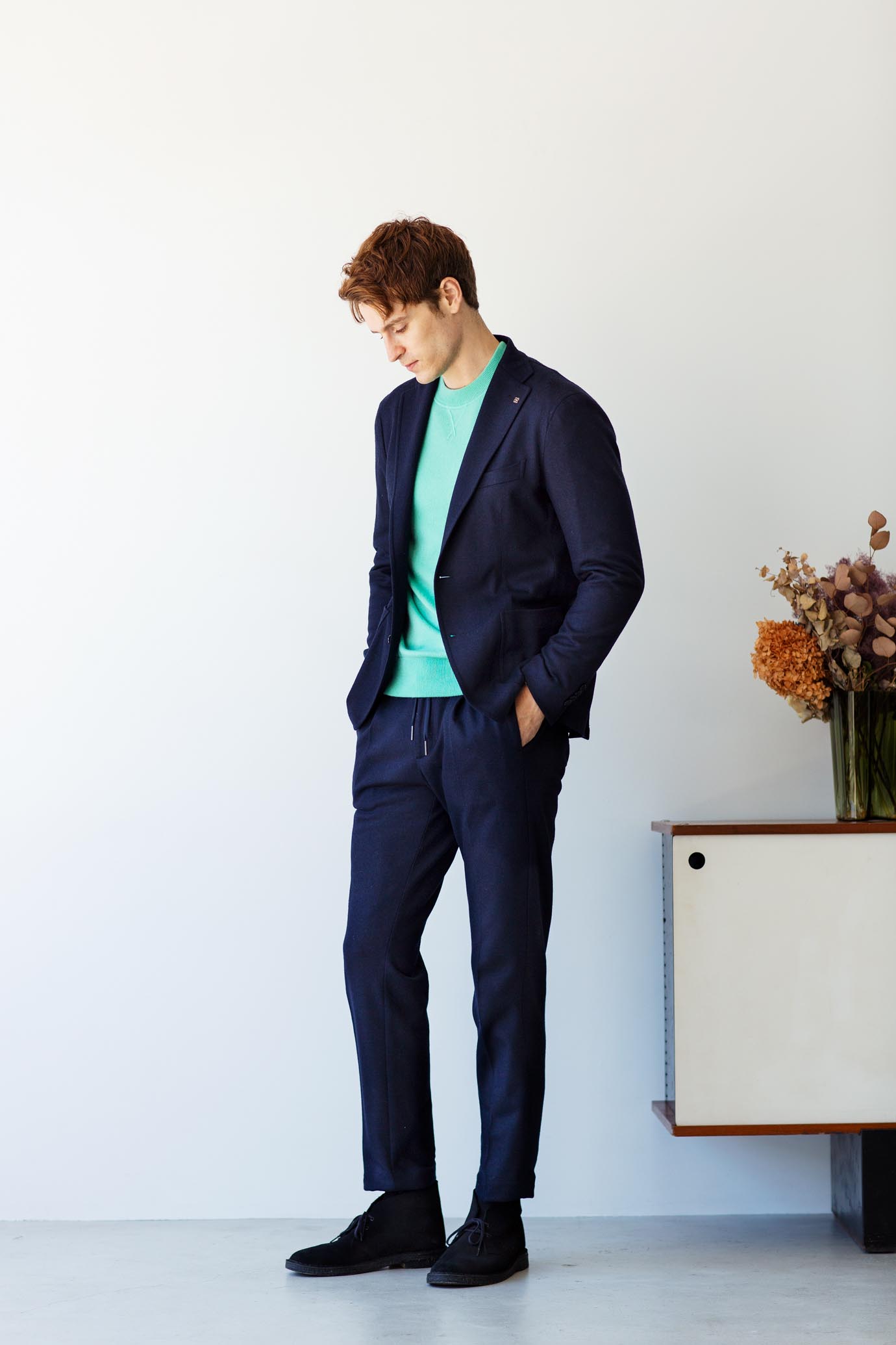・ジャケットモデルは「TAGLIATORE(タリアトーレ)」が誇る軽量仕立ての"DAKAR"。形状保持とボリューム感を出すためにジャケットのキモとも言える襟、肩、バスト部分以外は一枚仕立てです。見た目は完全にジャケットなのに着心地はシャツ並みという軽量感をお楽しみ頂けます。襟裏には表地の色を拾った超極細なコーデュロイを使用し、ディテールにも抜かりない仕上がりです。
