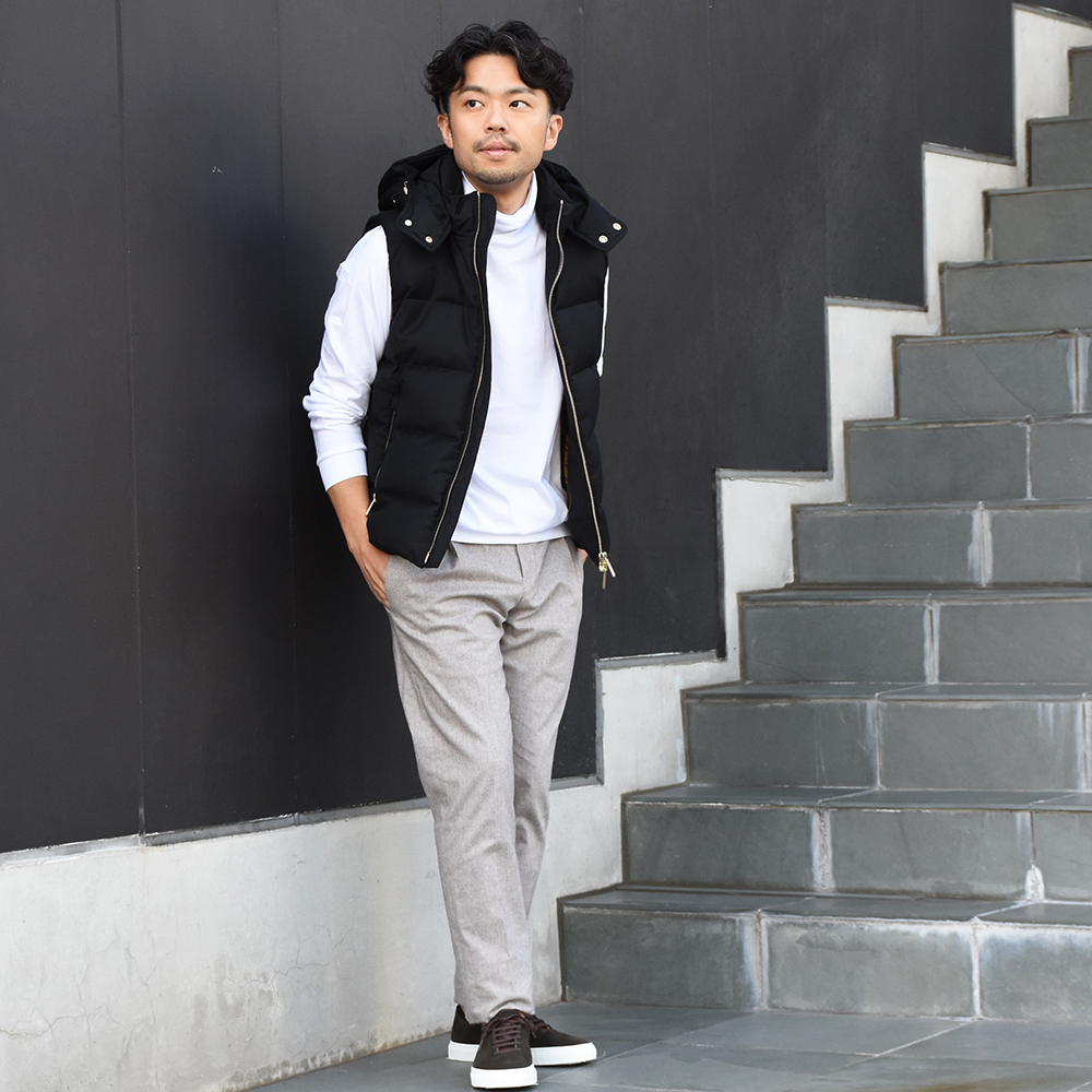 太過ぎず細過ぎず丁度良いサイズ感でした。ウエスト周りはイージーパンツのようなディテールで、非常にラクな穿き心地ながら全体の印象はキレイめなドレスパンツといった印象。ヒップポケットに配されたファスナーのエンドパーツがレザーがあしらわれており、ハイブランドのような細かいディテールも満足度を高めてくれます。着こなしの幅も広くて、裾の仕上げはシングルかタタキが個人的にはオススメ。足元はスニーカーやブーツといった幅の広い合わせ方が楽しめます。