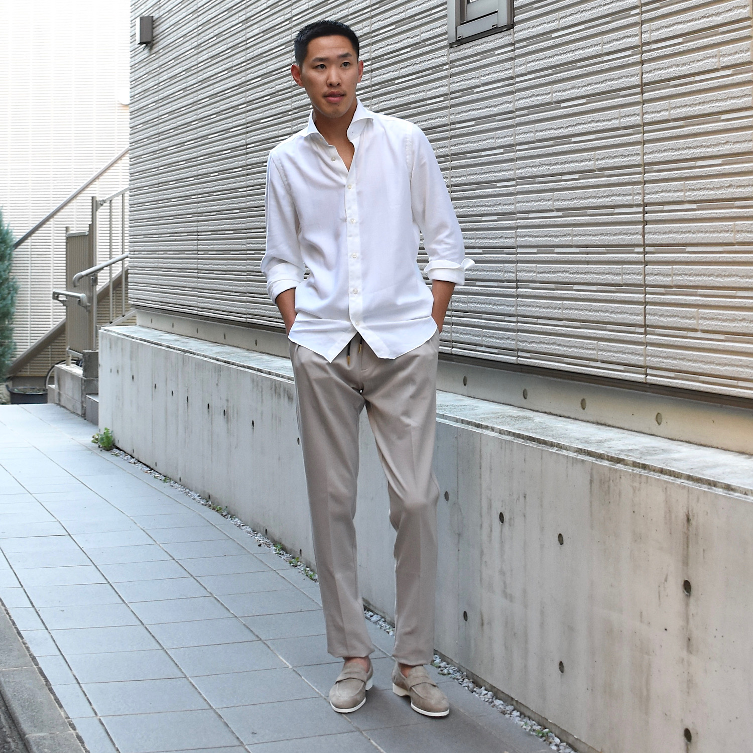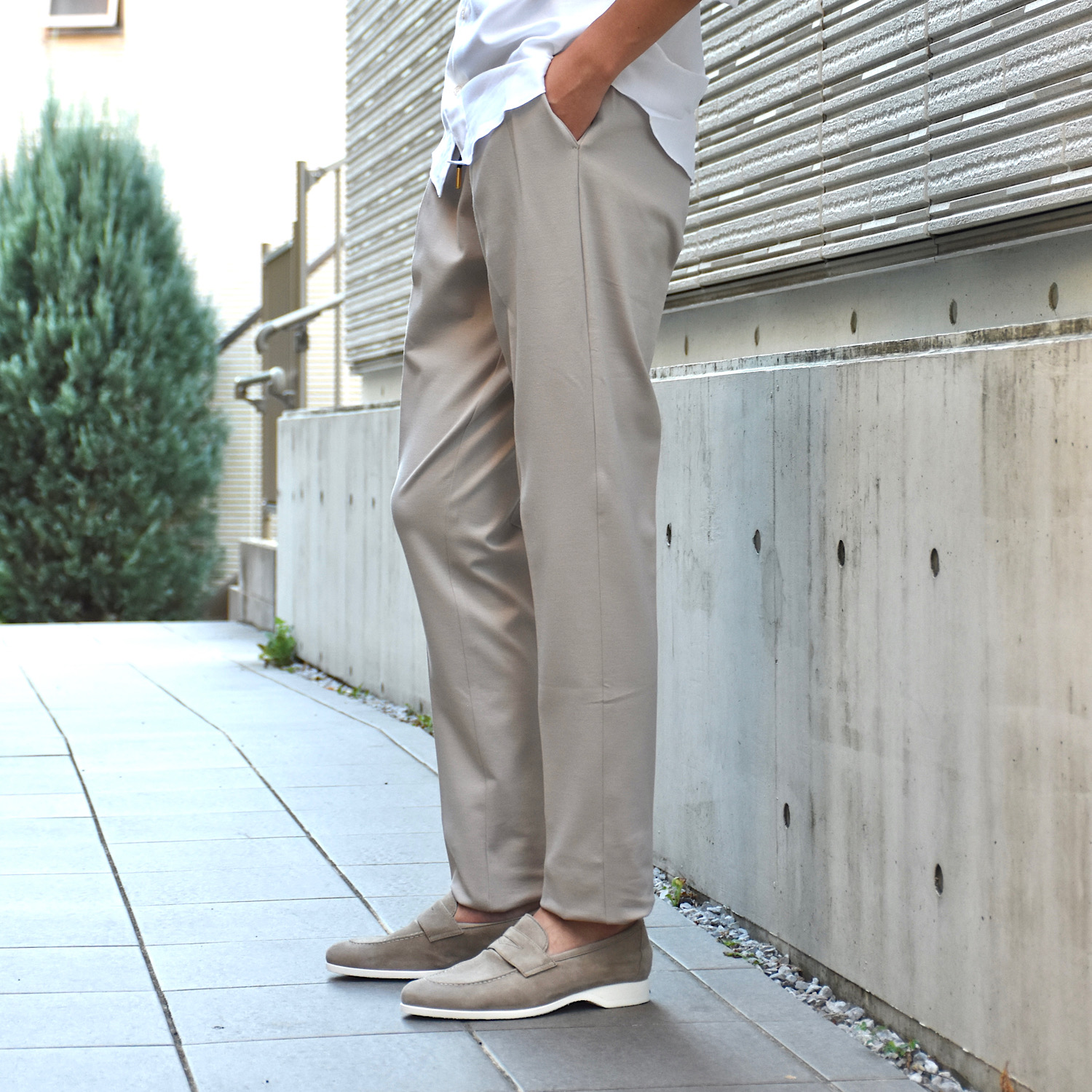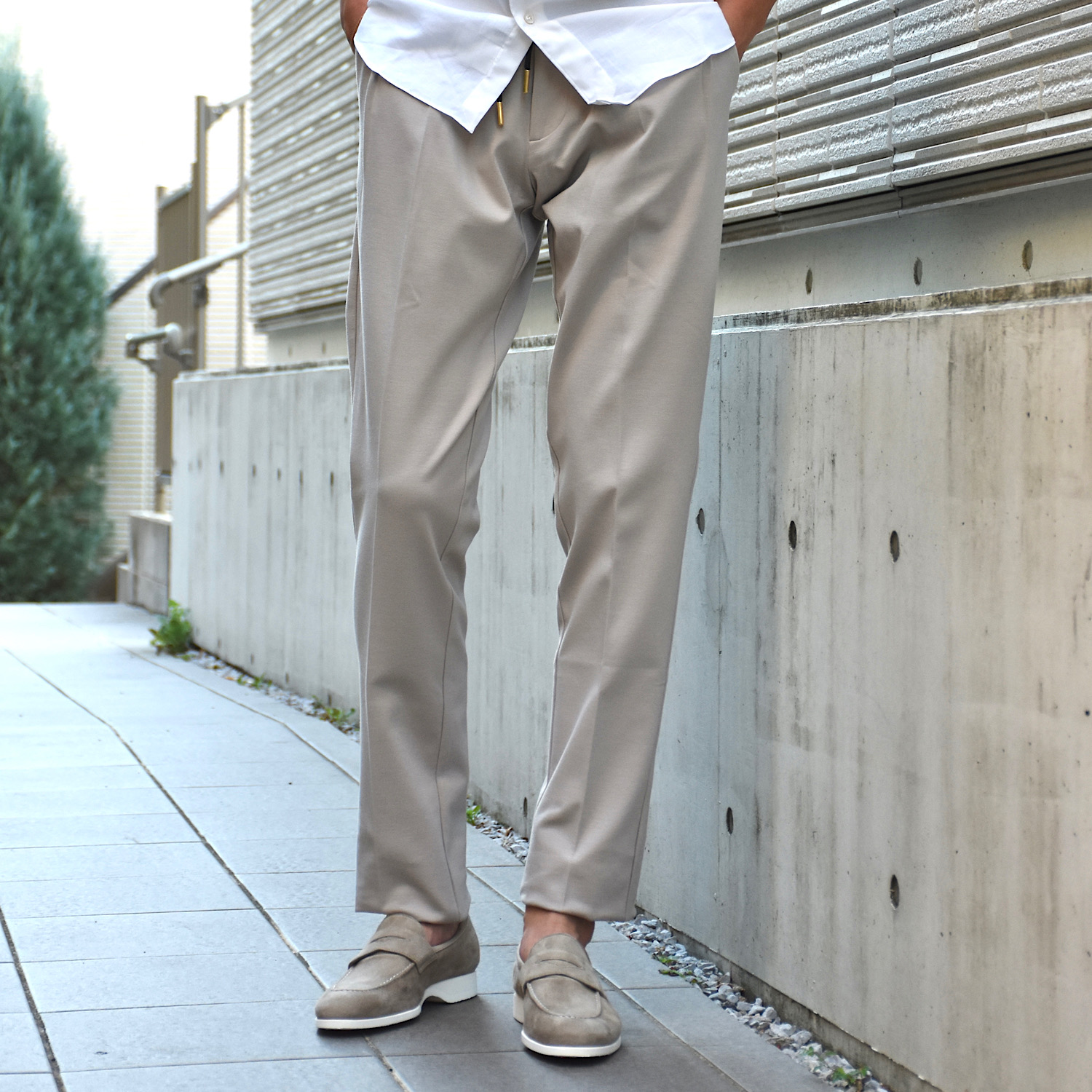 しっかりテーパードが効いているので足元はスッキリとした印象。スニーカーでもローファーなどの革靴でもバランスがとりやすいデザインです。