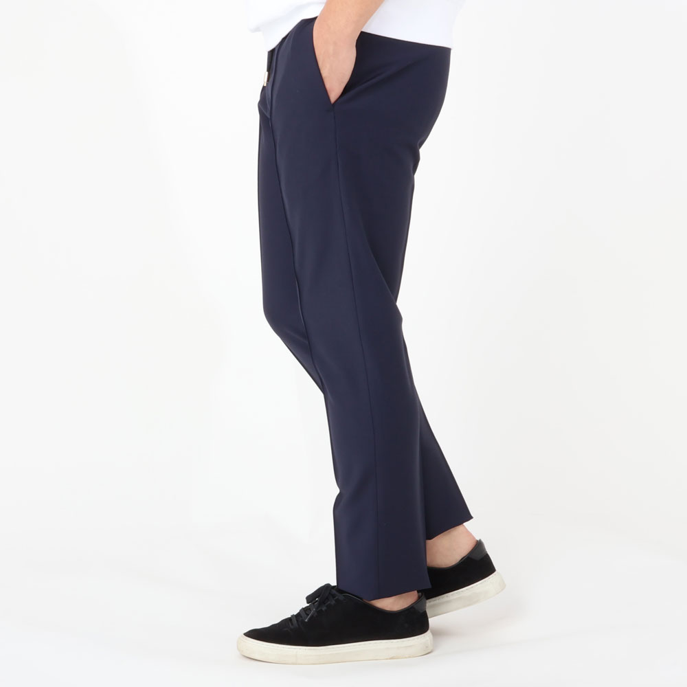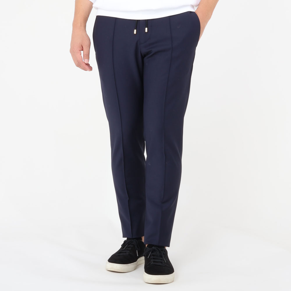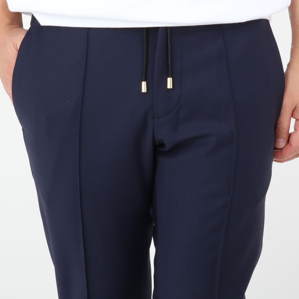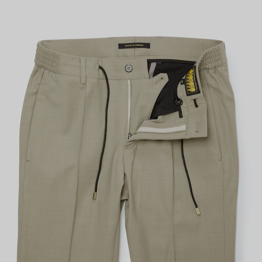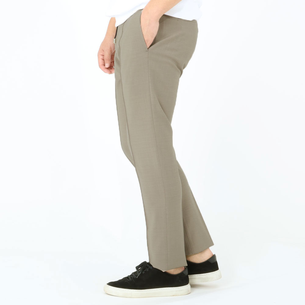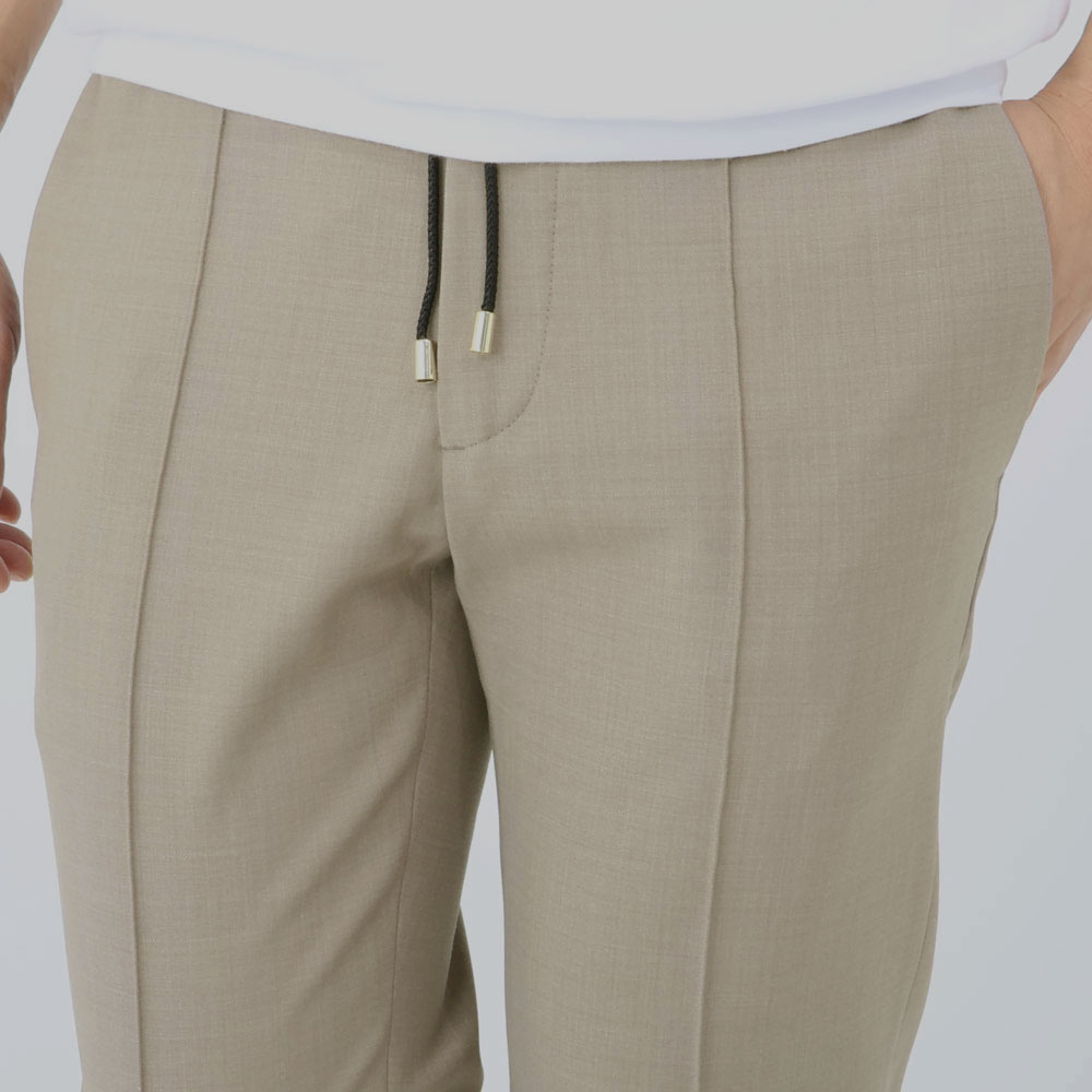 • 永久クリース、ノープリーツ、ウエストサイドシャーリングゴム&ドローコード付き、フロントジップ、裾口タタキ仕立て(幅1cm)