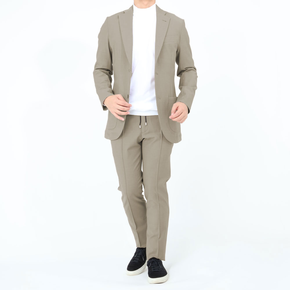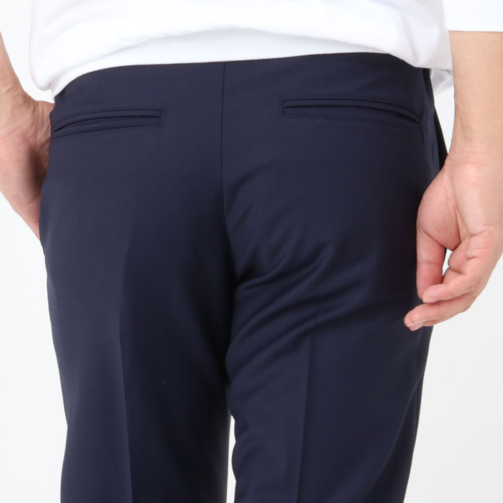 柔らかなタッチにほんのりとした光沢感、ハリ・コシがある生地は端正な印象、オンオフ問わず活躍するジャケットです。シワになりにくいので長時間の移動でも安心して穿けます。44サイズを着用しウエスト周りは丁度よく全体的に細身のフィッティングでした