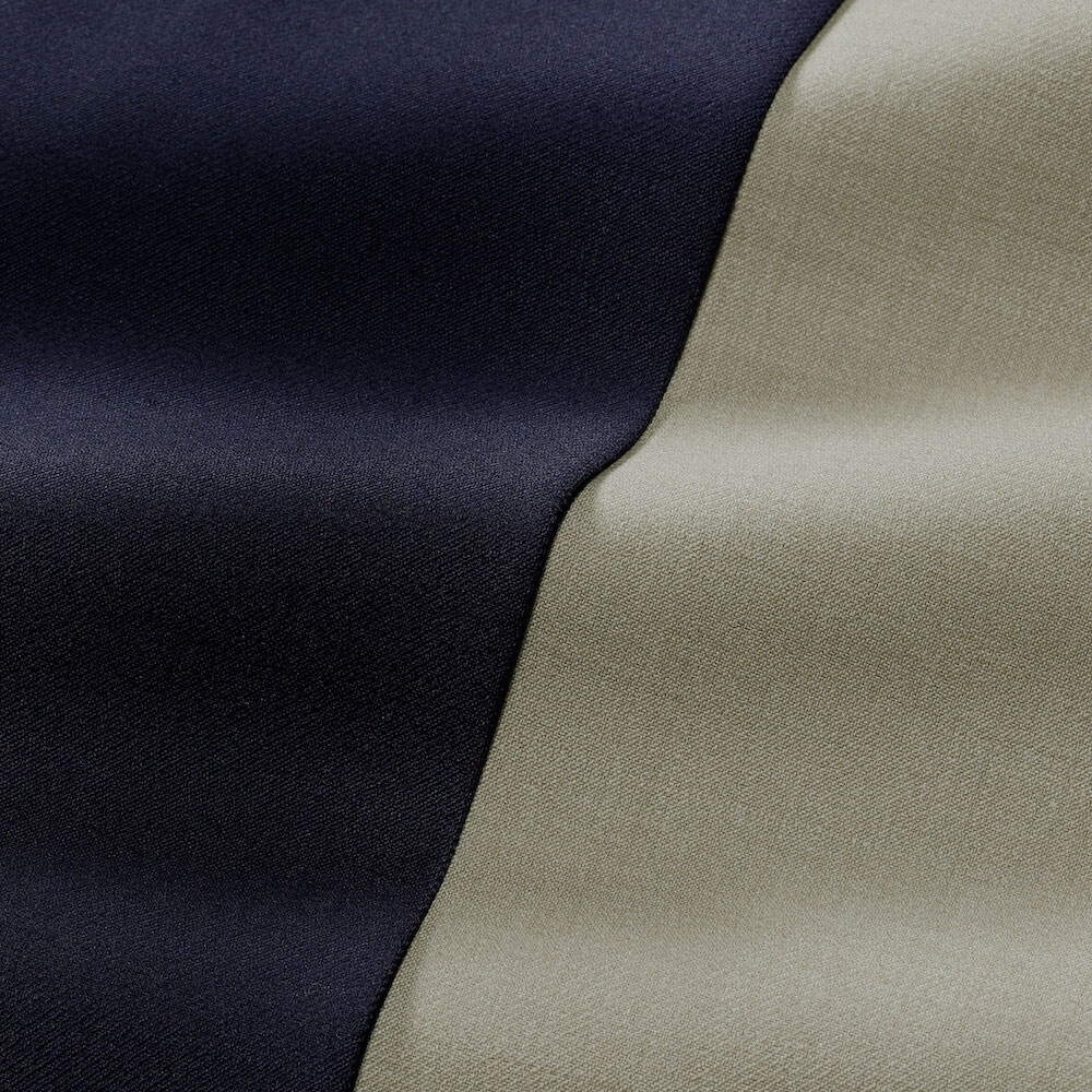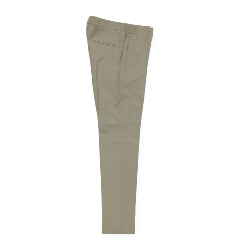 ・生地は杢調の複雑な色合いが美しいウールベースの平織りストレッチ素材である”TOP WOOL TROPICAL”。今シーズンのコレクションの中でも抜群のハリ感とトロみを併せ持ち、シルエットを綺麗に引き立たせます。