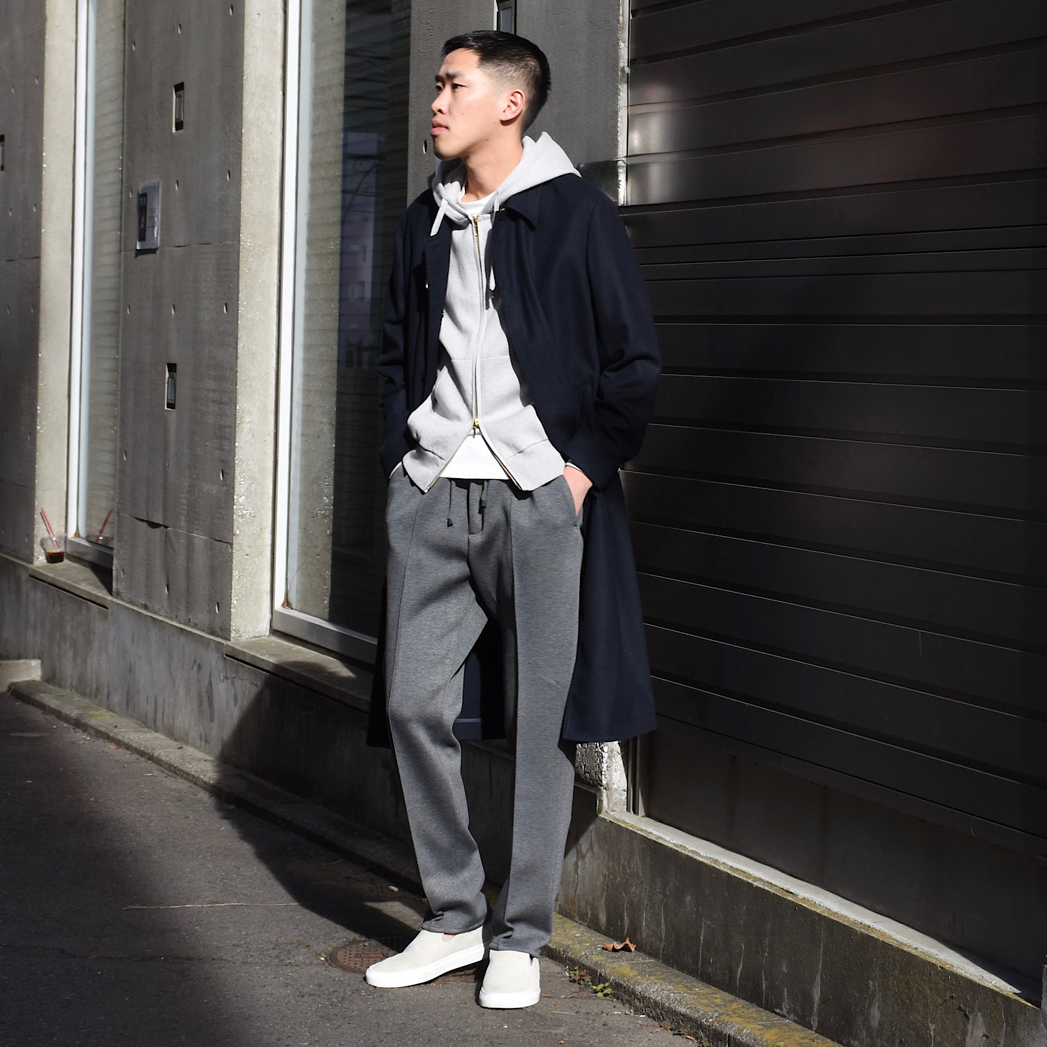 ・ネックポイントが低めで小ぶりなカラーにより抜け感漂う襟元、膝下まですっぽり隠れる着丈、中に着ているジャケットやパンツのポケットに脇からアクセスできるスルーポケットを備えるなど、服好きも納得のディテールを備えています。