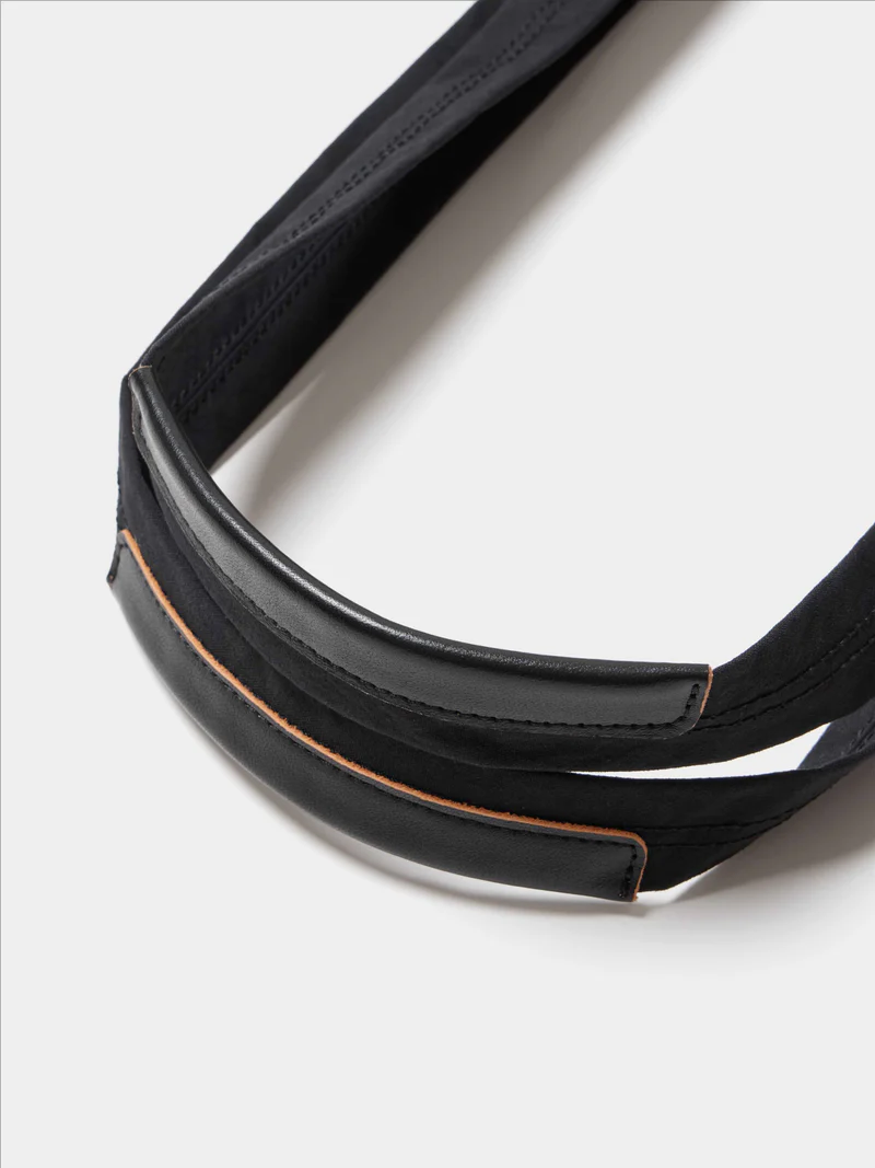 付属革には”丘染め”と呼ばれる芯の茶色を残した染色が特徴のヌメ革を使用し、切り目を生かしたディテールもポイントにしている。 ステッチが見えないように二つに分けたフロントポケットが特徴。
