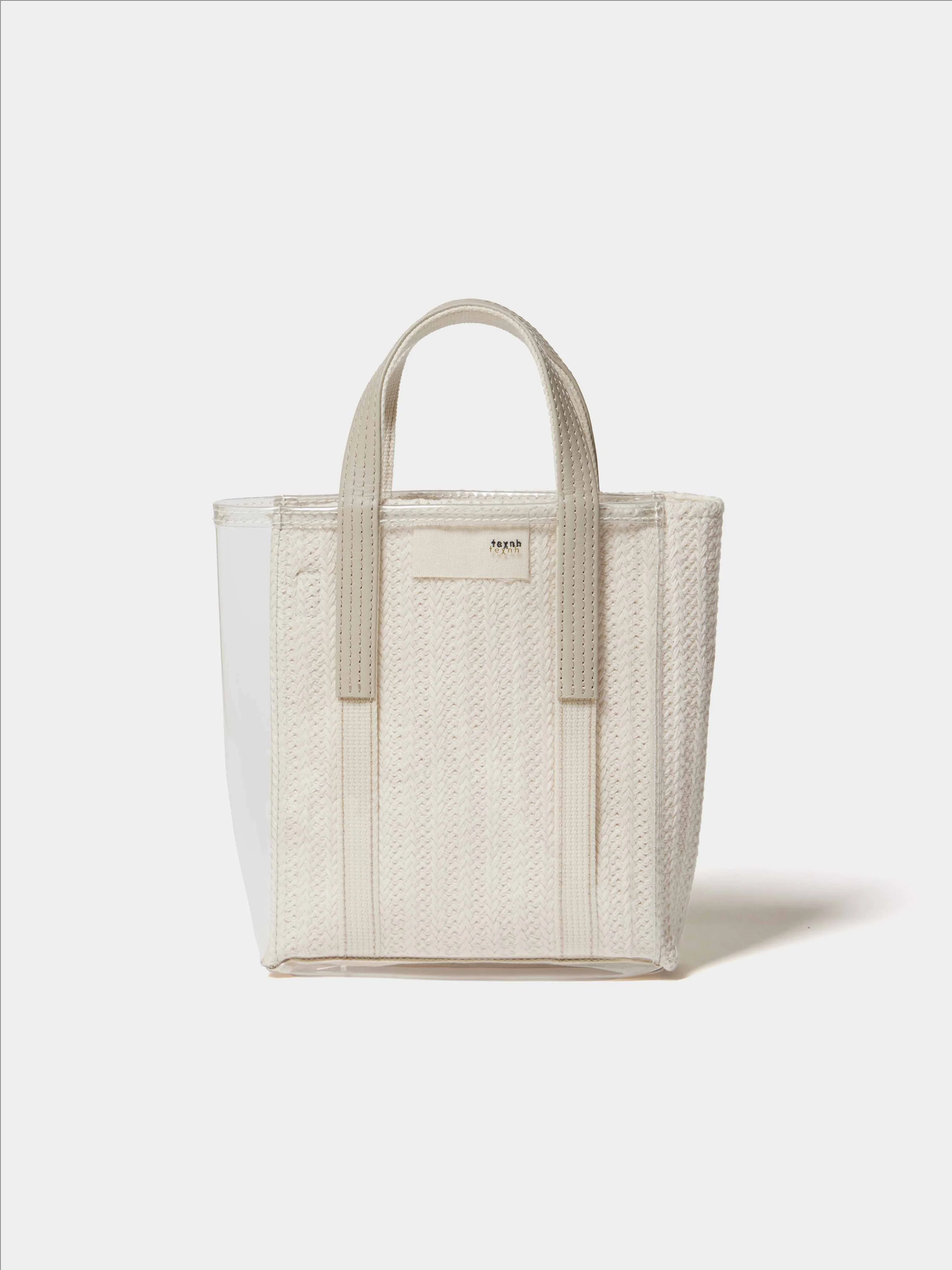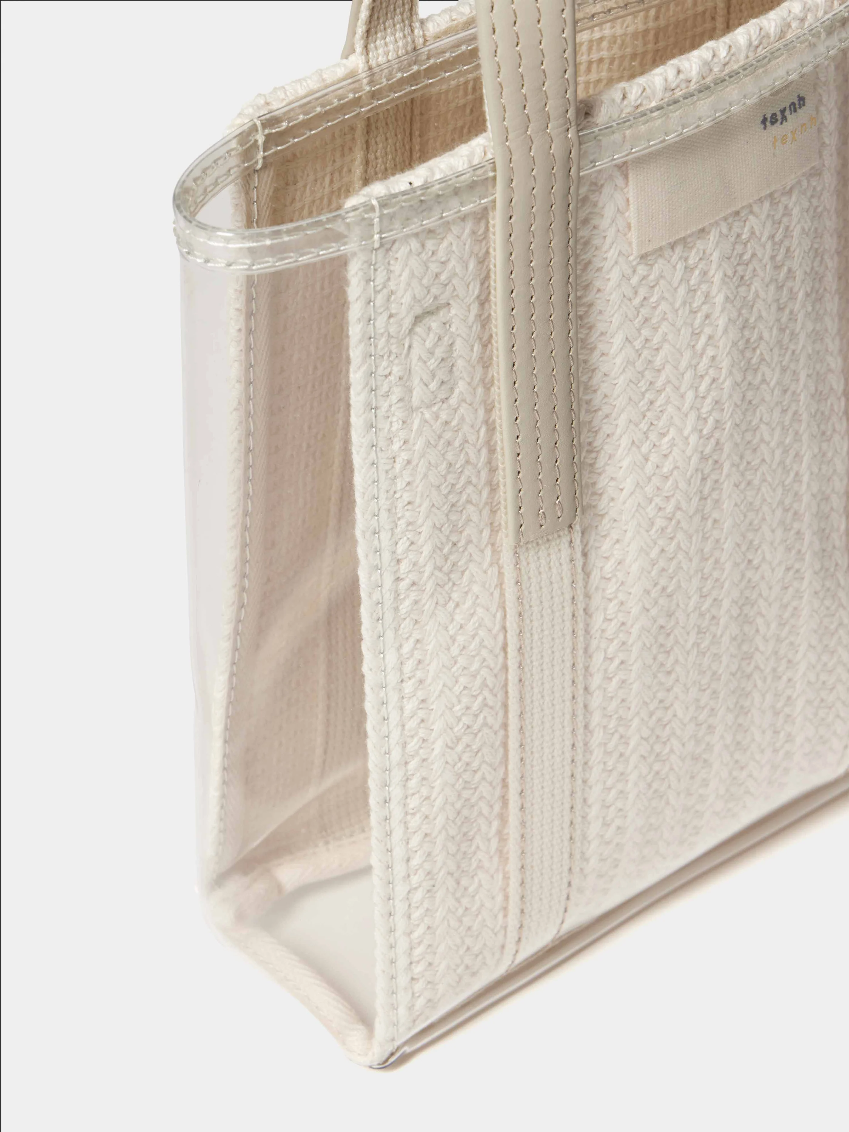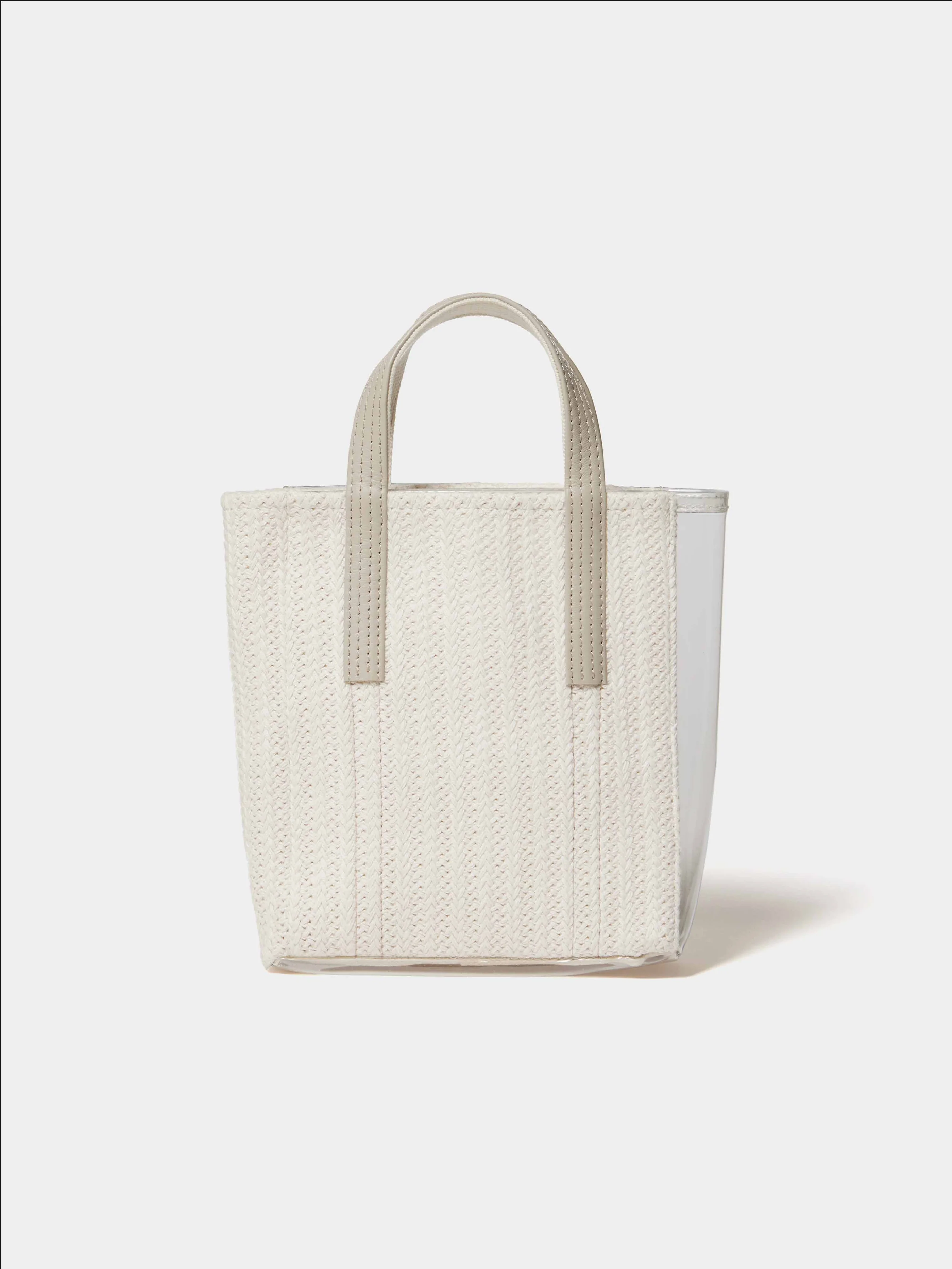 カゴを彷彿させるコットンメッシュの素材感に涼しげなクリアPVC、高級感を感じさせるハンドルとストラップのレザー使いが特徴。 ストラップは男性でも女性でもナナメ掛けができる長さで設定。