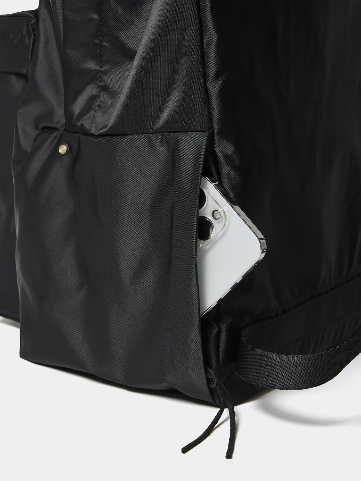 高強度を誇る66ナイロンを使用したツイル素材。シルクサテンのように美しい光沢感からは 想像できないほど耐久性が高い。