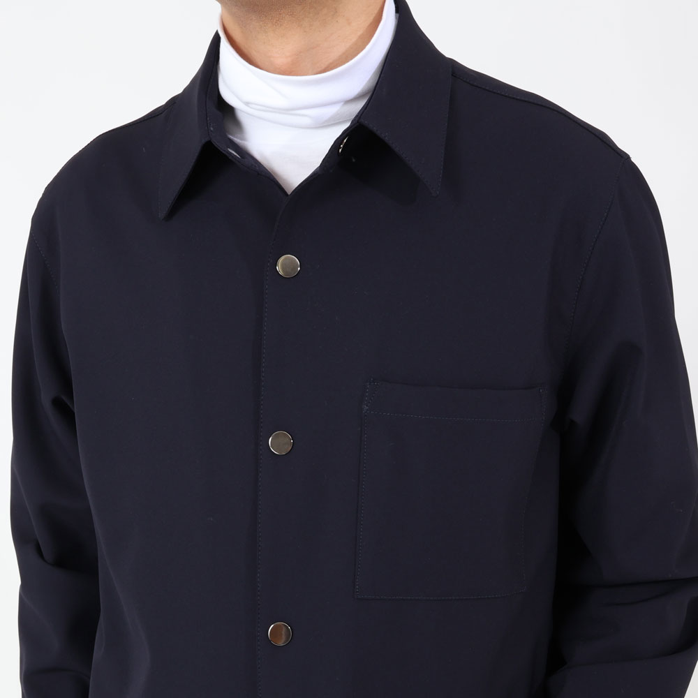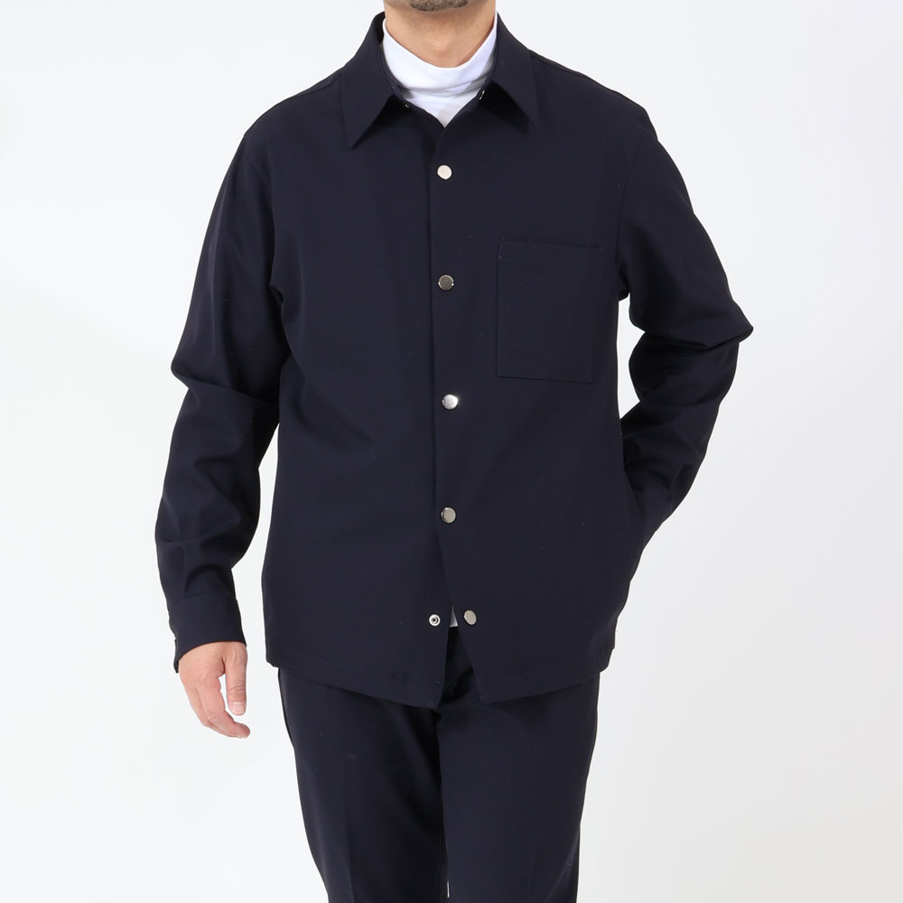 ・こちらはシルバーのドットボタンが都会的なアクセントとなるシャツ型ブルゾン。ボックスシルエットながらスッキリとしており、羽織るとスマートに映ります。