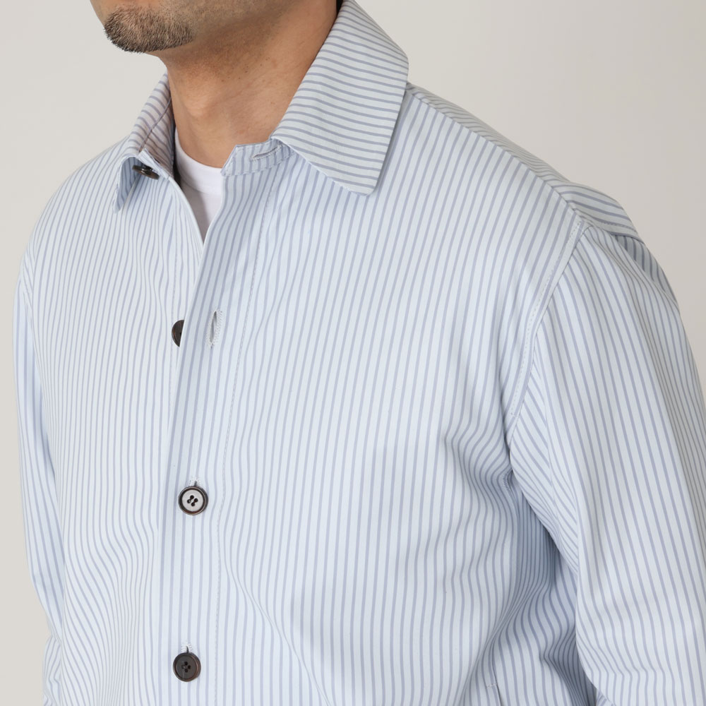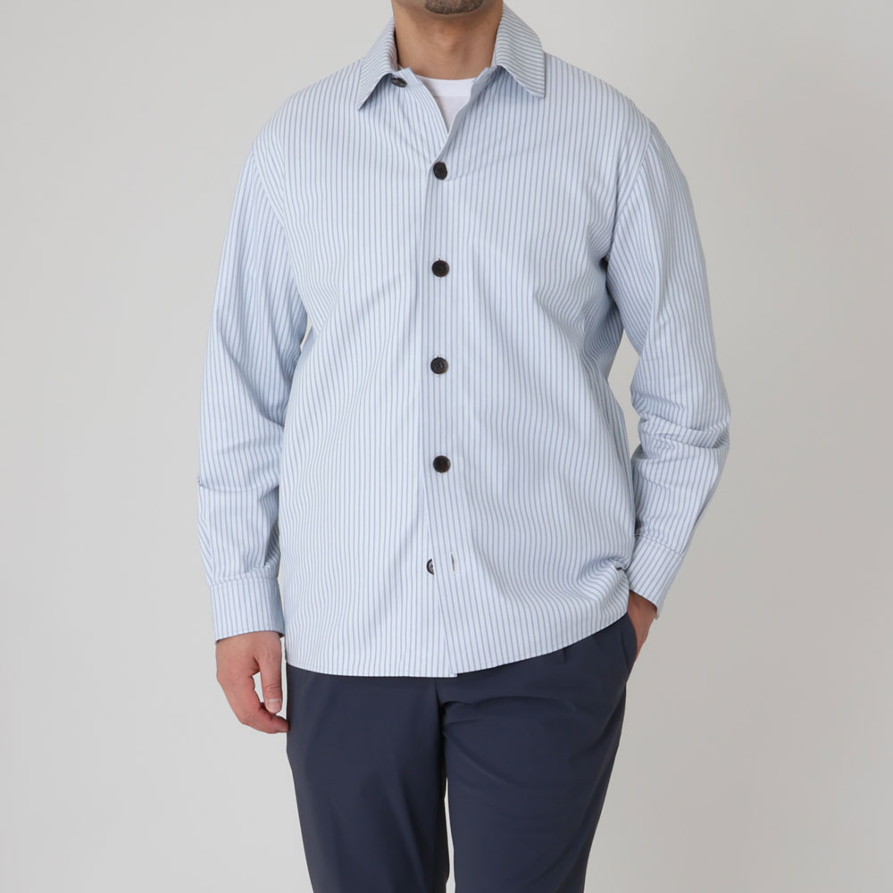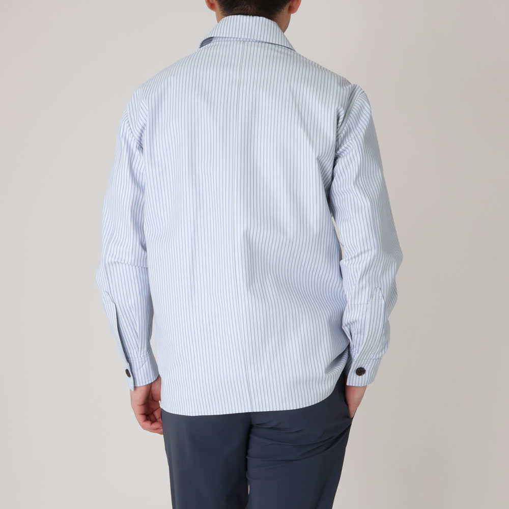 ・こちらはラムレザーにプリントでストライプを表現したオーバーシャツ。ツルっとした質感にクリーンな配色のストライプがピッタリで、ほのかにラウンドした襟と相まり、デザイナー物のようなムードを醸します。