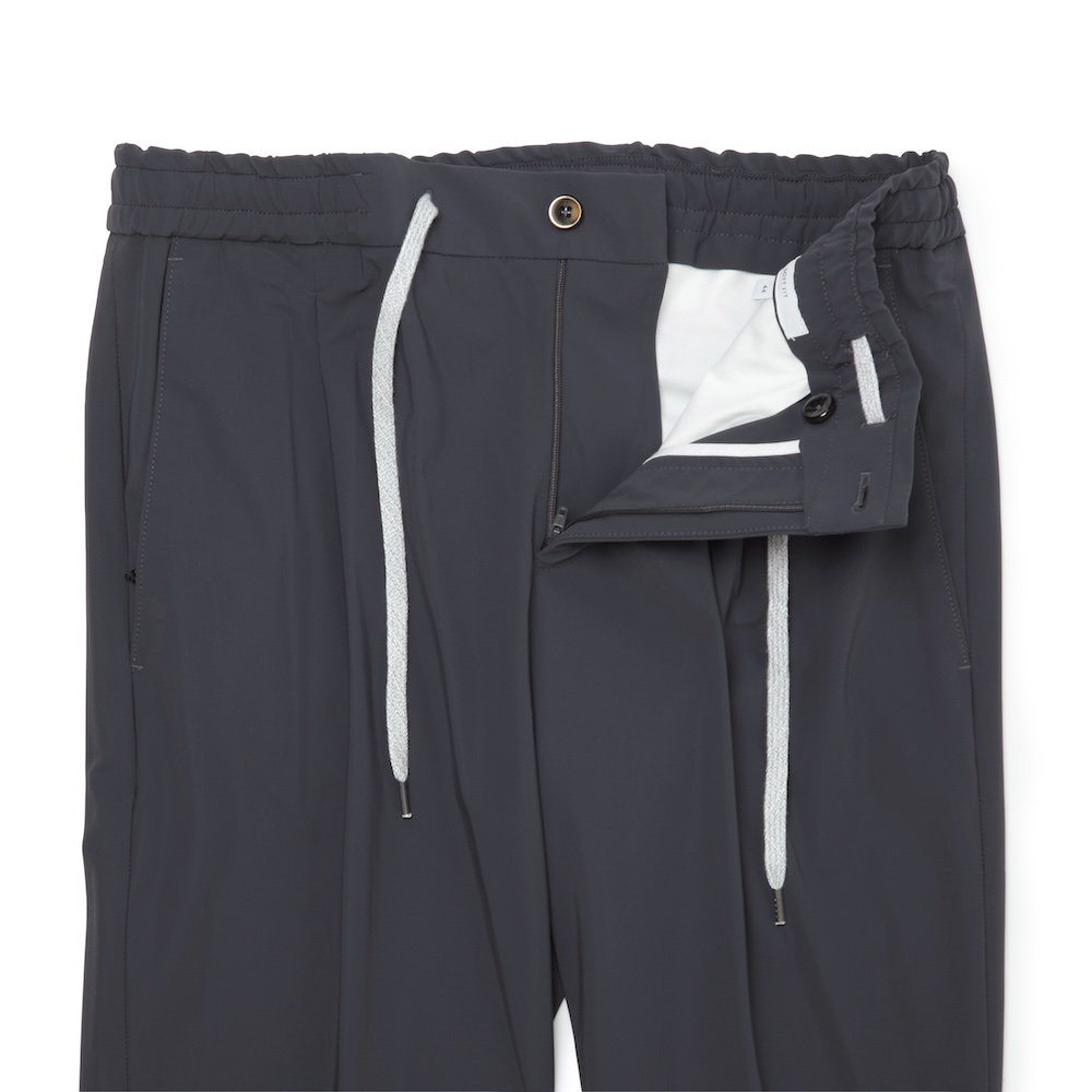 ・ウエストフルシャーリングでドローコード付き、1プリーツが入れられ運動量も確保された腰廻りが特徴のこちらは、快適な穿き心地と上品なルックスを追求した一本。ドローコードは内通しも可能、後ろポケットはZIP付きとディテールまで抜かりはありません。