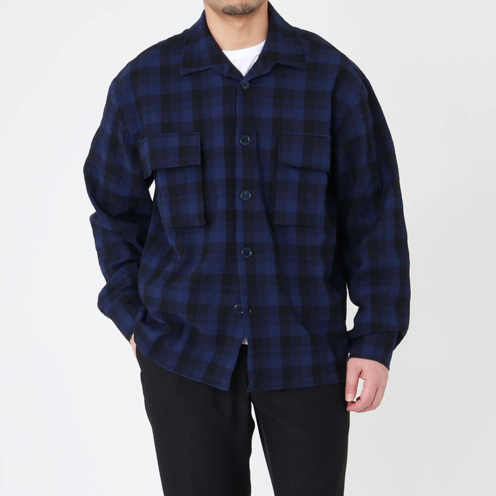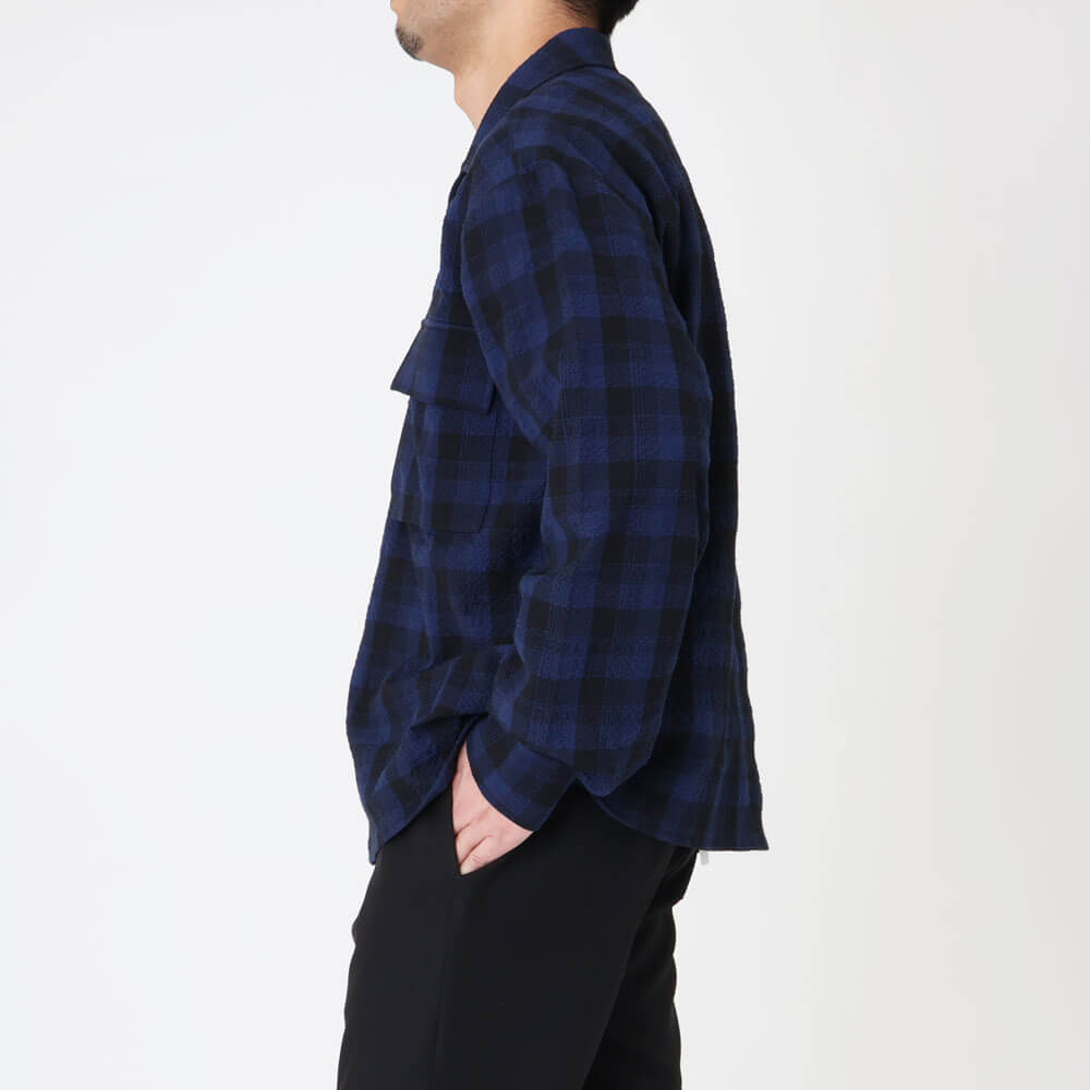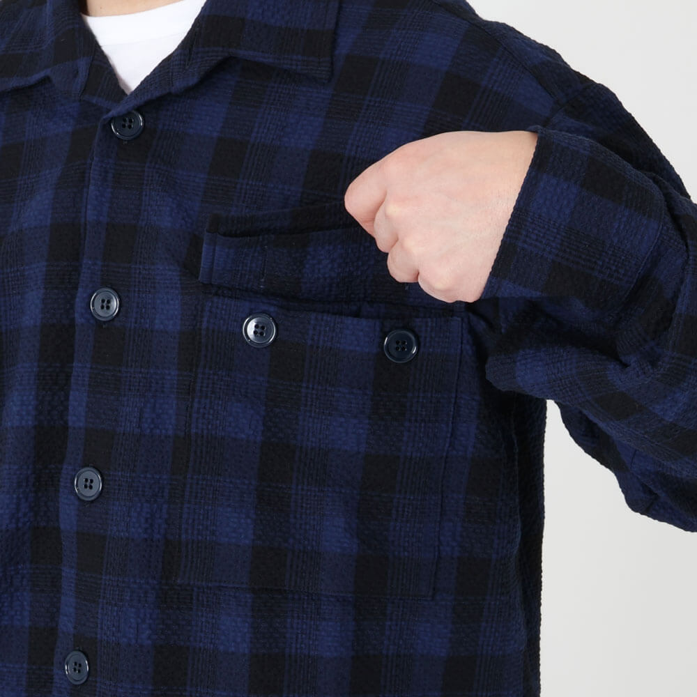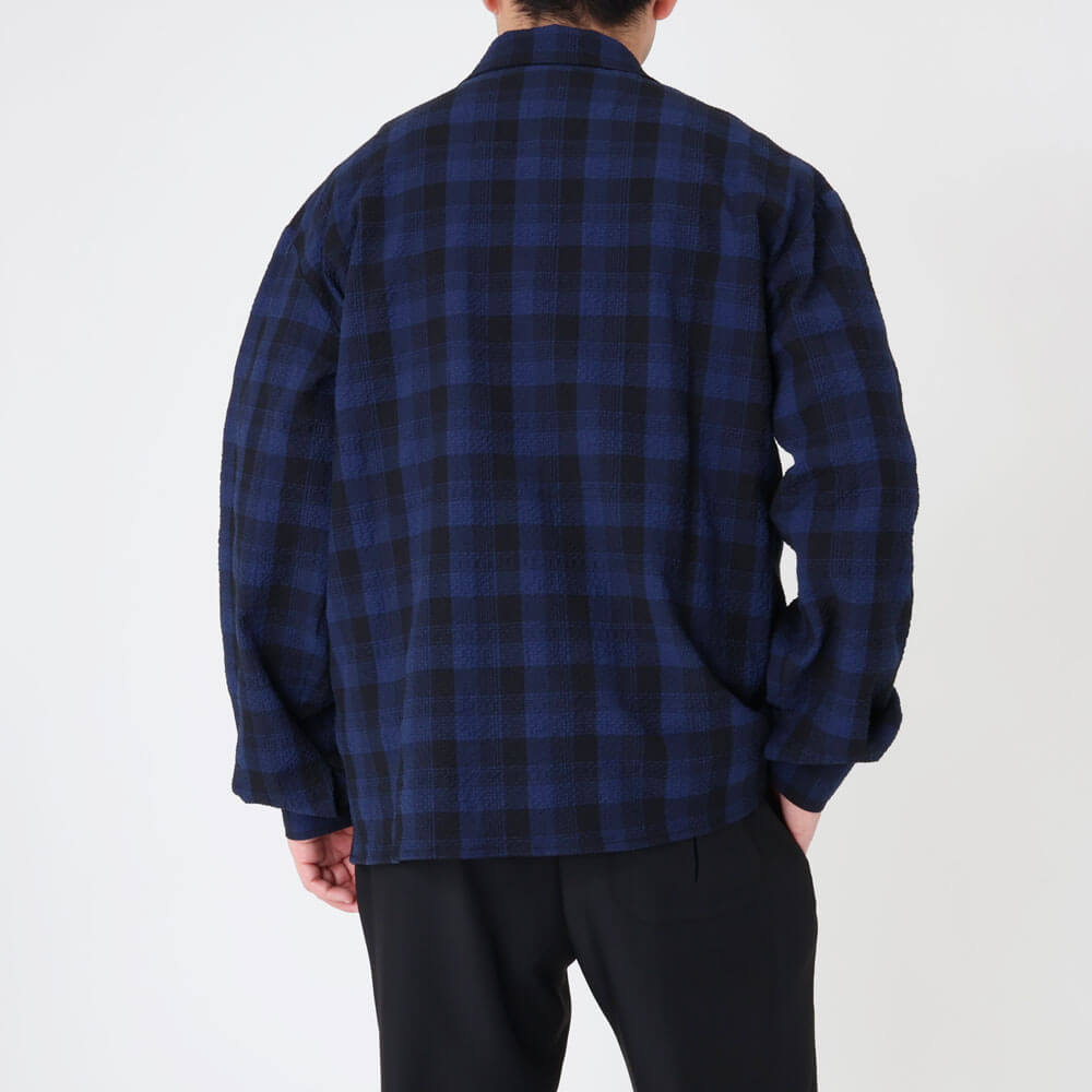 カモ / ストレッチ シアサッカー チェック シャツジャケット/NEEDLES NEW MAXI SHIRT SEERSUCKER NAVY CHECK